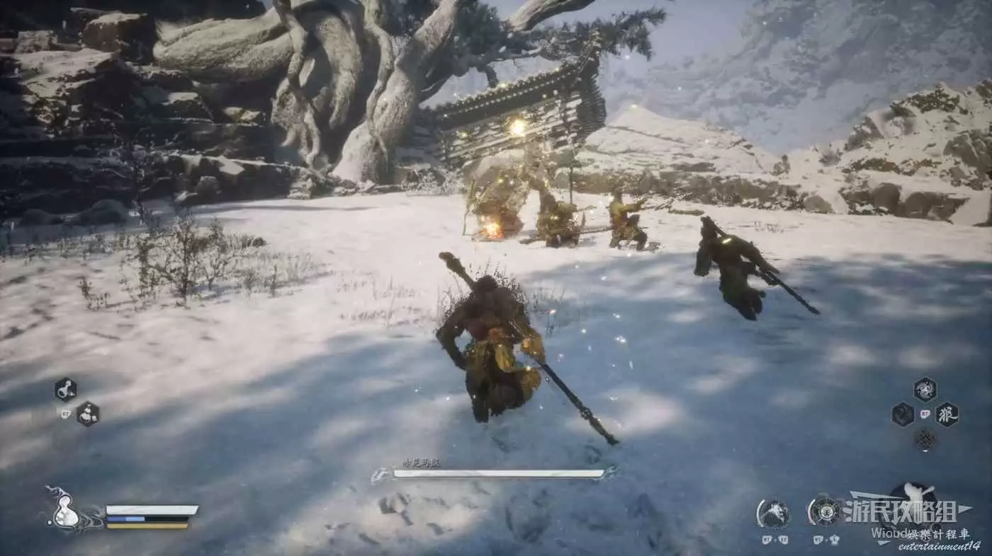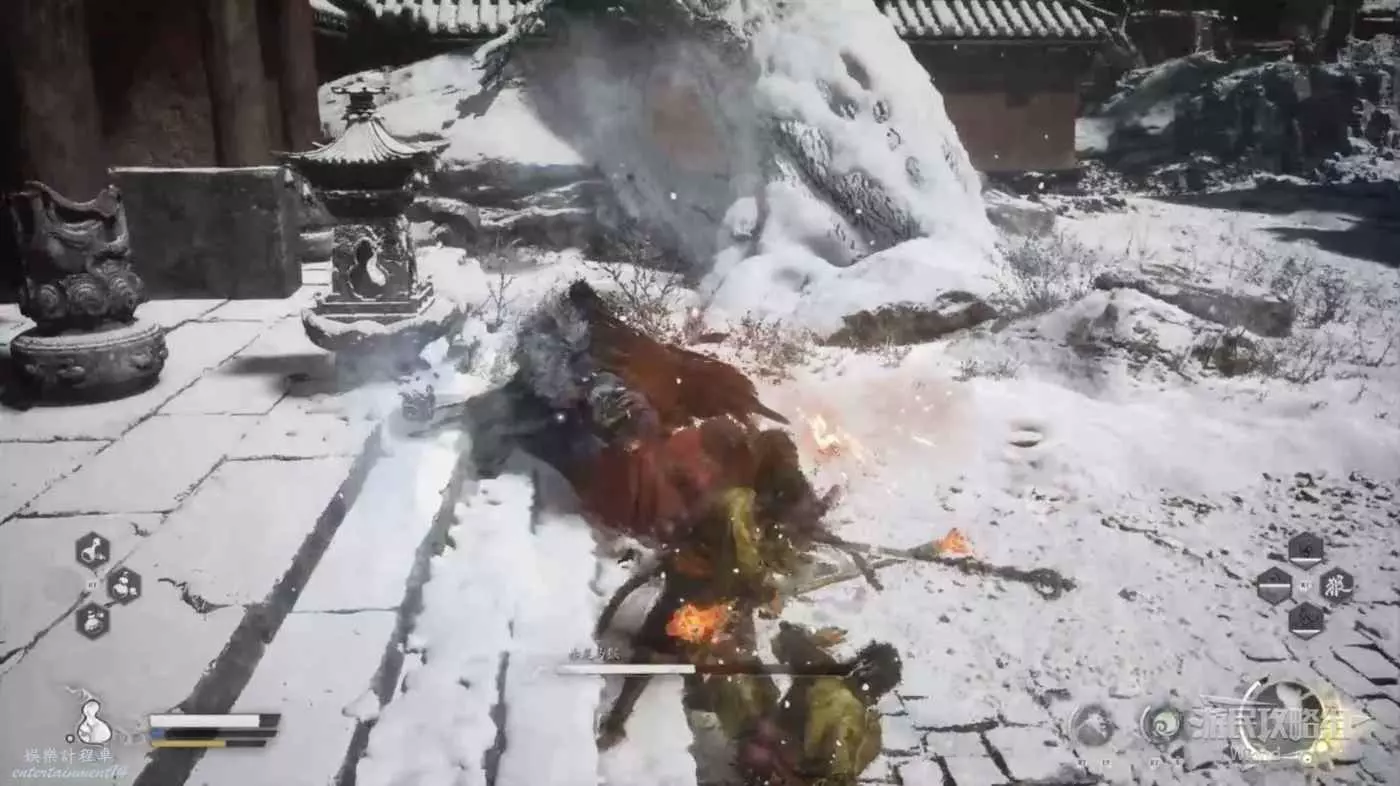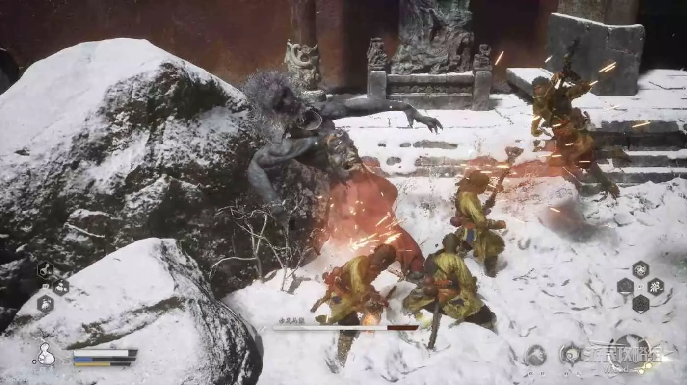 第二次在安身寺碰到也是身外身法+定身術起步,然後不停的跟著猴子們用普攻的最後一擊敲,疊滿三層棍勢就重擊。基本能把赤尻馬猴打倒在地上起不來。