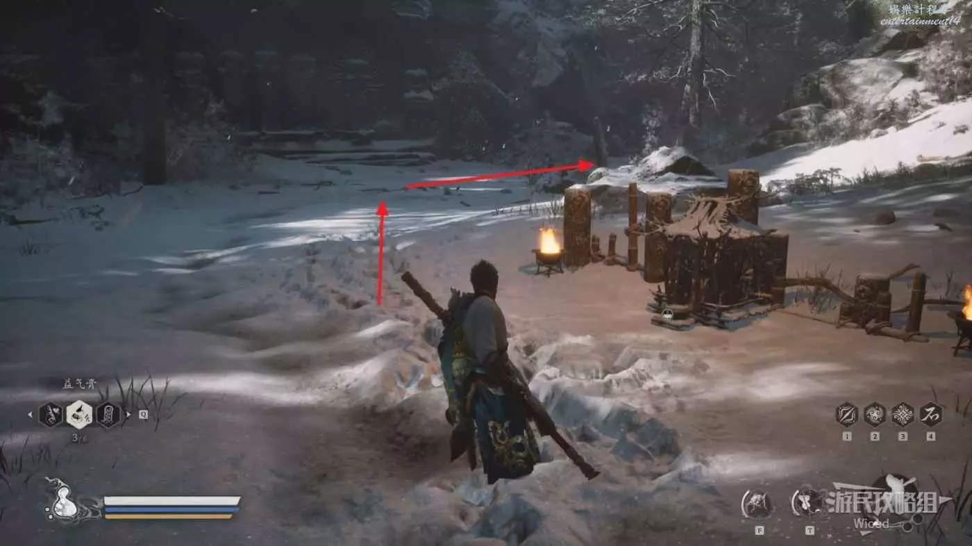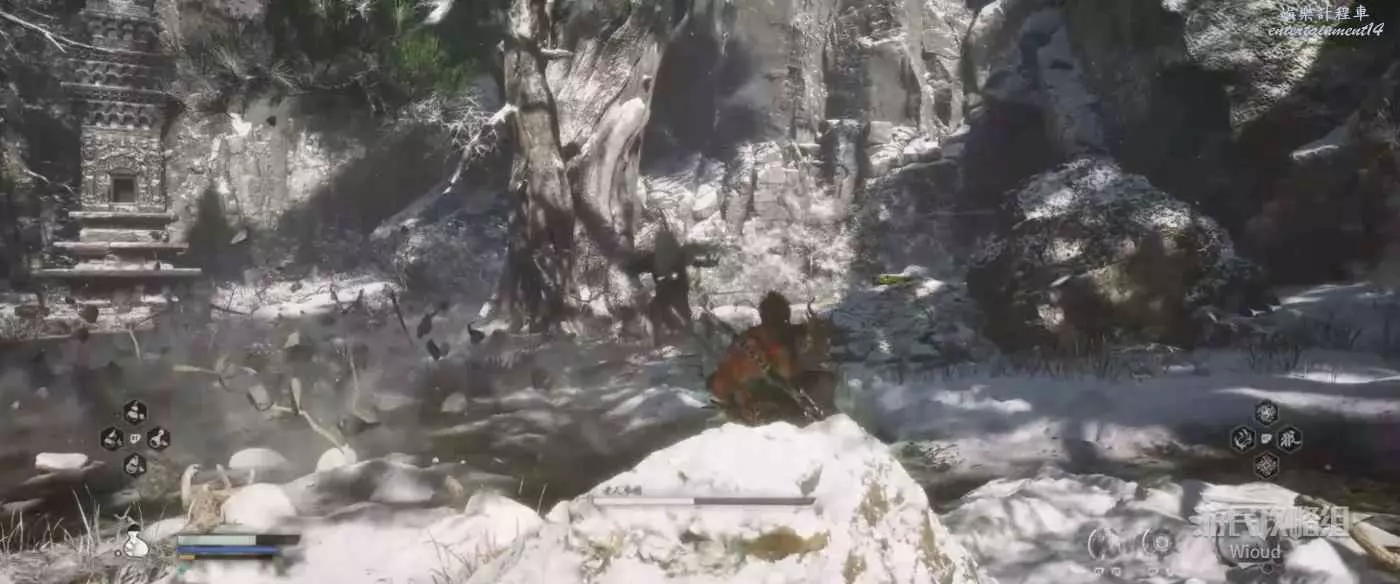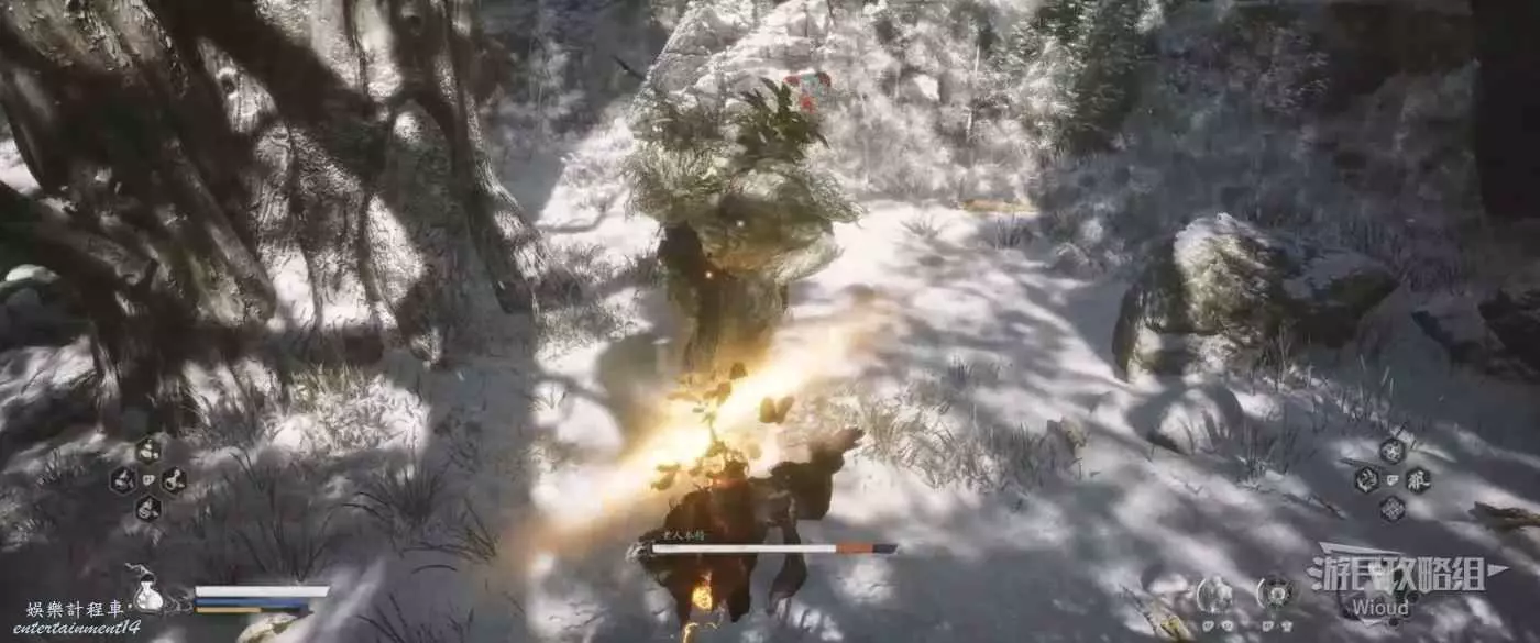 我們只需要離遠蓄力三棍勢然後上前重擊,再離遠蓄力就行,重複這個流程就能輕鬆將其擊敗,中間如果大意被擊中也可以通過聚形散氣強行脫離然後隱身蓄力上前重擊。