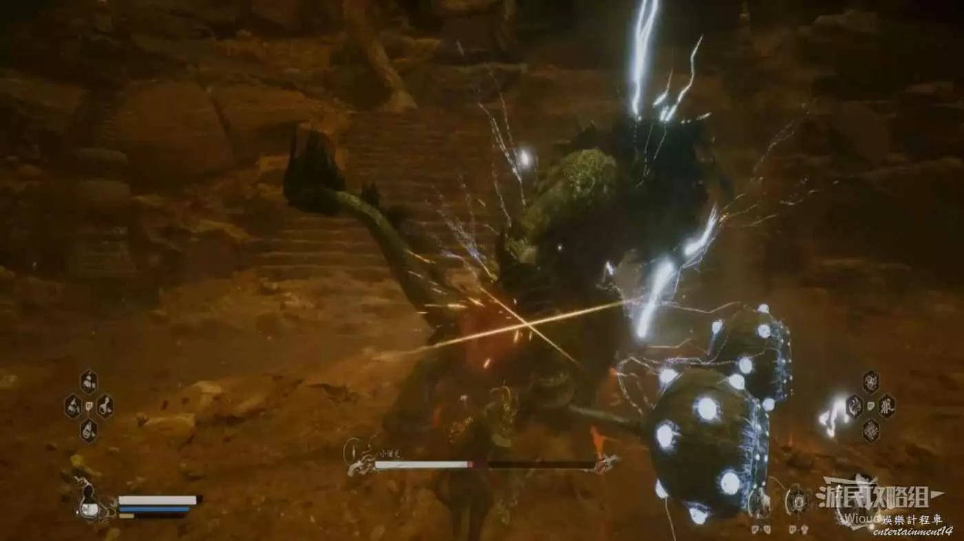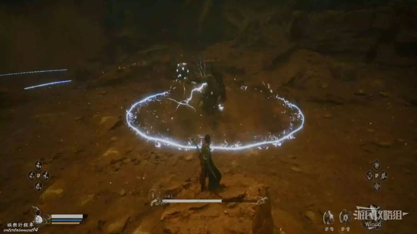 連續的波紋範圍攻擊可以站在附近的岩石上等到招式釋放完畢再攻擊,躲都不用躲,但需要注意這些岩石都是可以被破壞的,戰鬥時小心這些岩石被波及到。