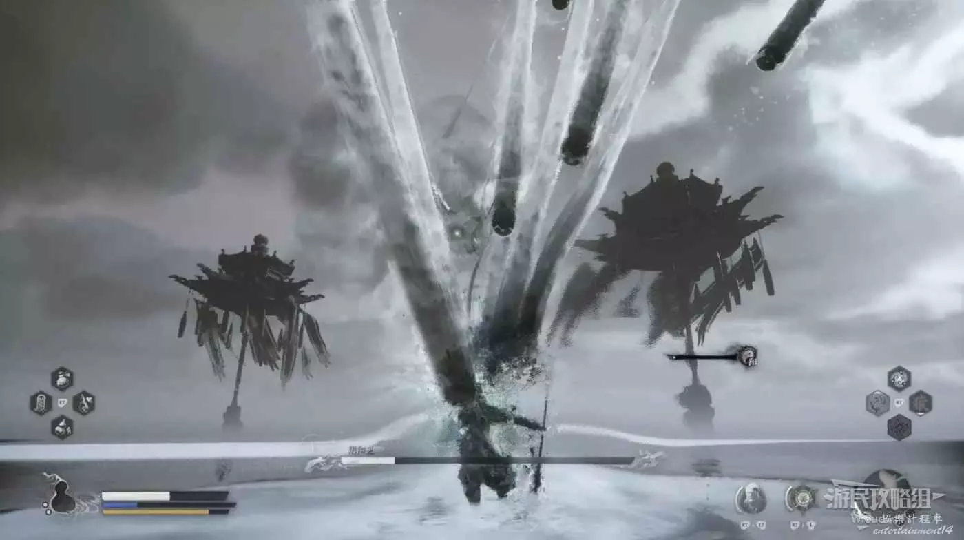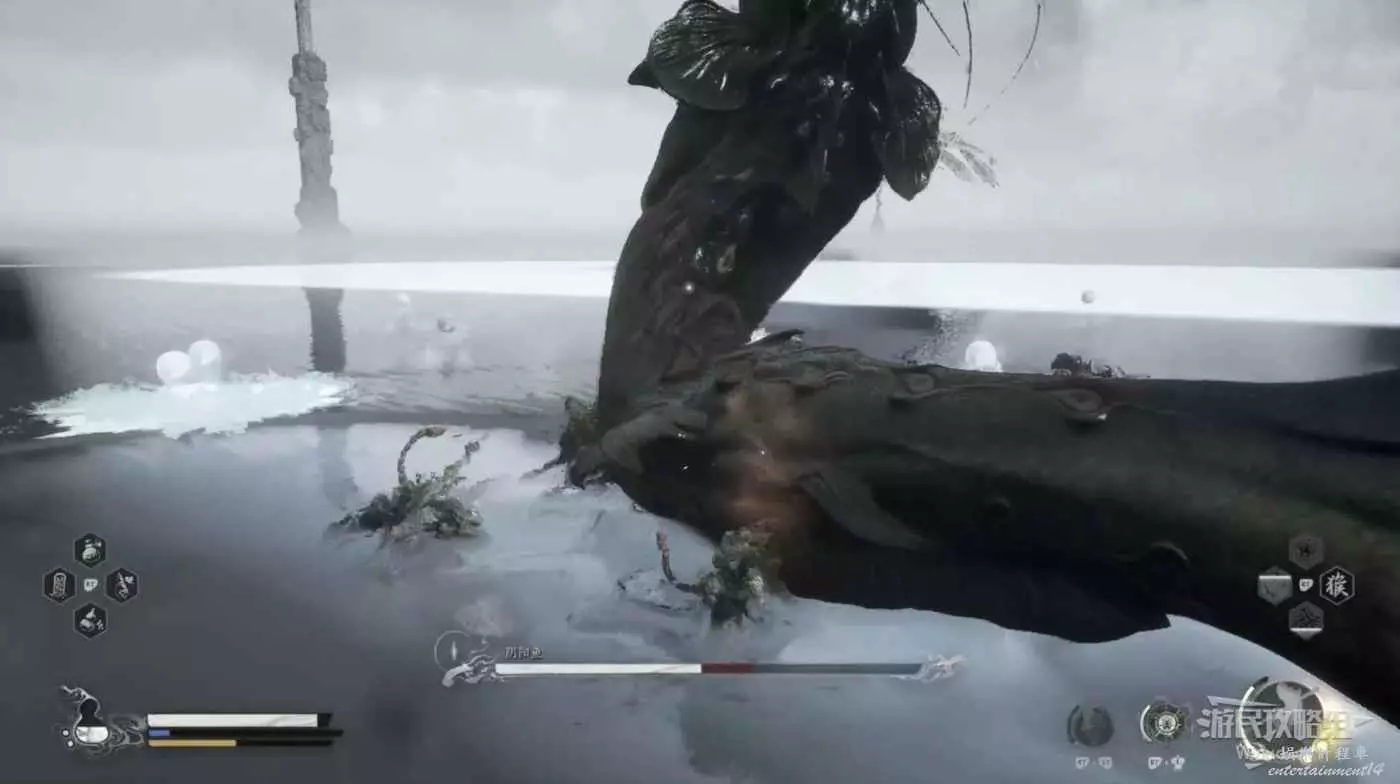 陰陽魚的技能類似與艾爾登之獸,能夠以非常迅捷的姿態穿插在湖面,拉進或拉遠與玩家的距離,如果變形後沒有太多失誤的情況下基本能將陰陽魚的血量打到底。