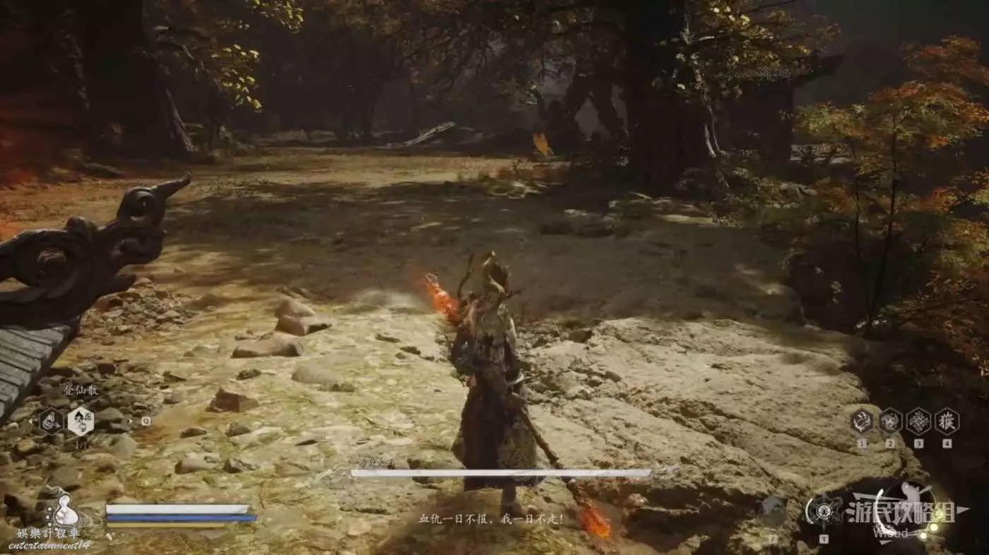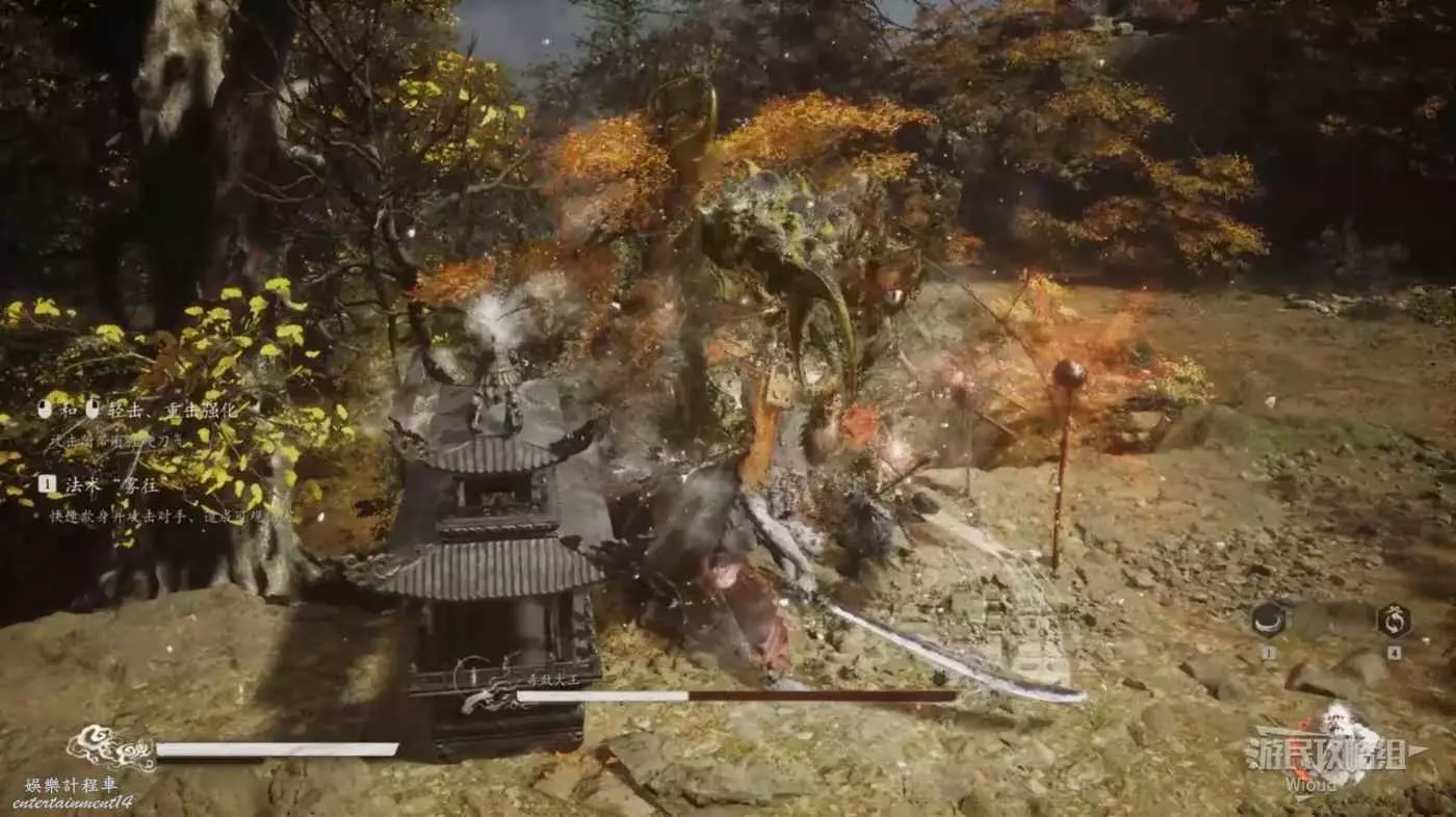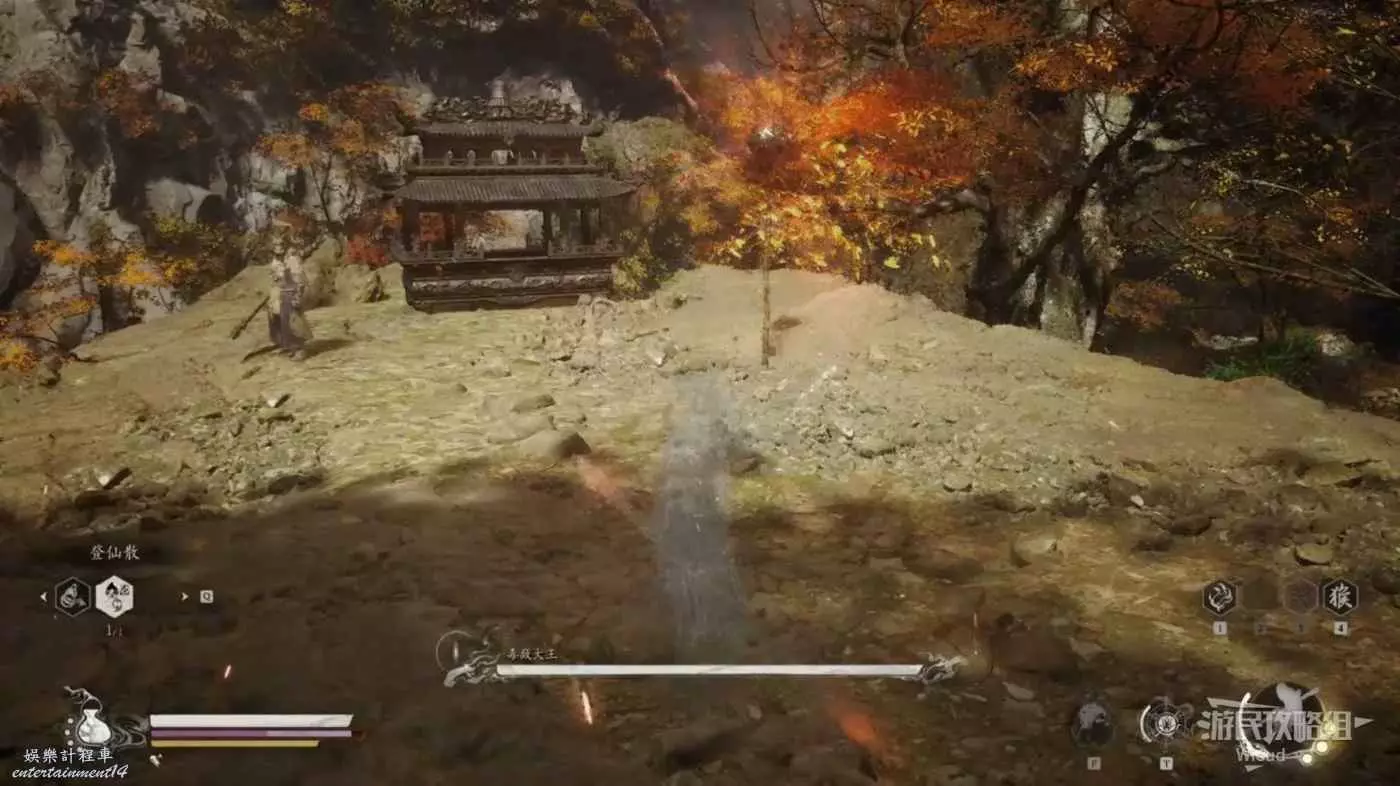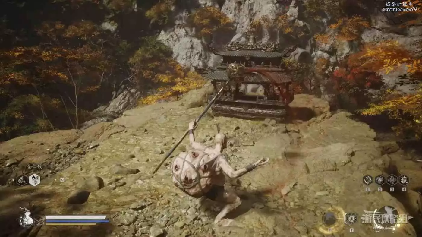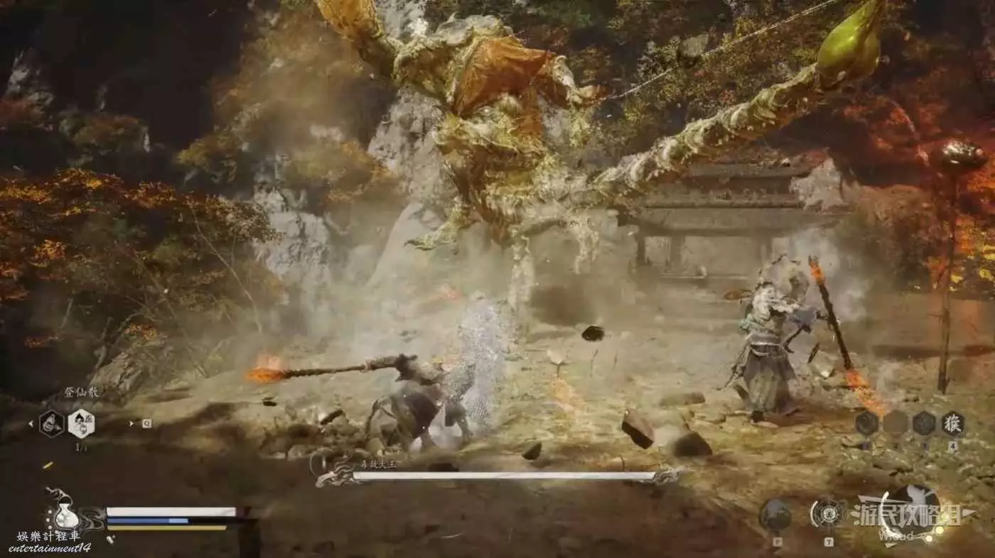 走到毒敵大王身旁變身馬猴,因為我們本來就攢好三棍勢了,立刻使用雲來技能,然後不停的對著毒敵大王AAA,基本能將毒敵大王困死在祭壇角落。
