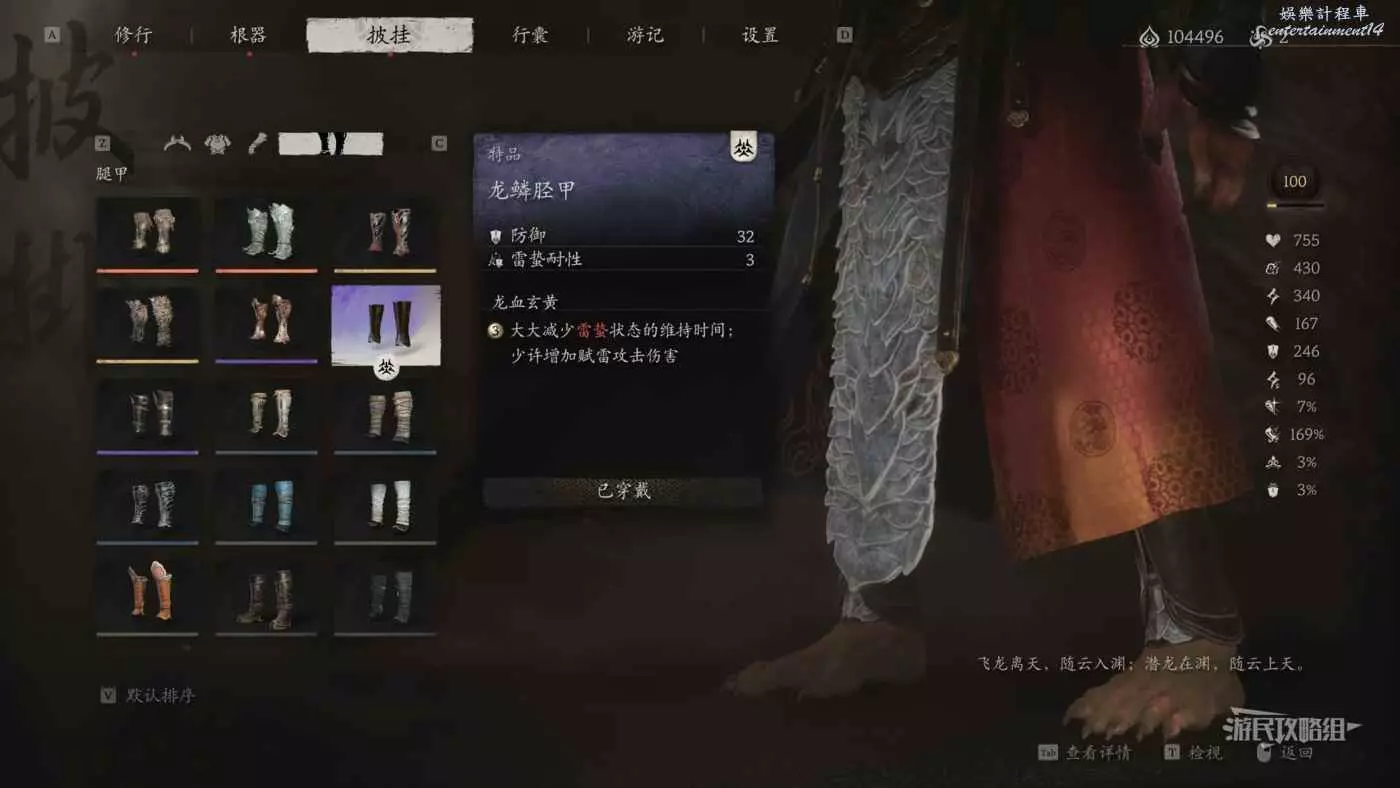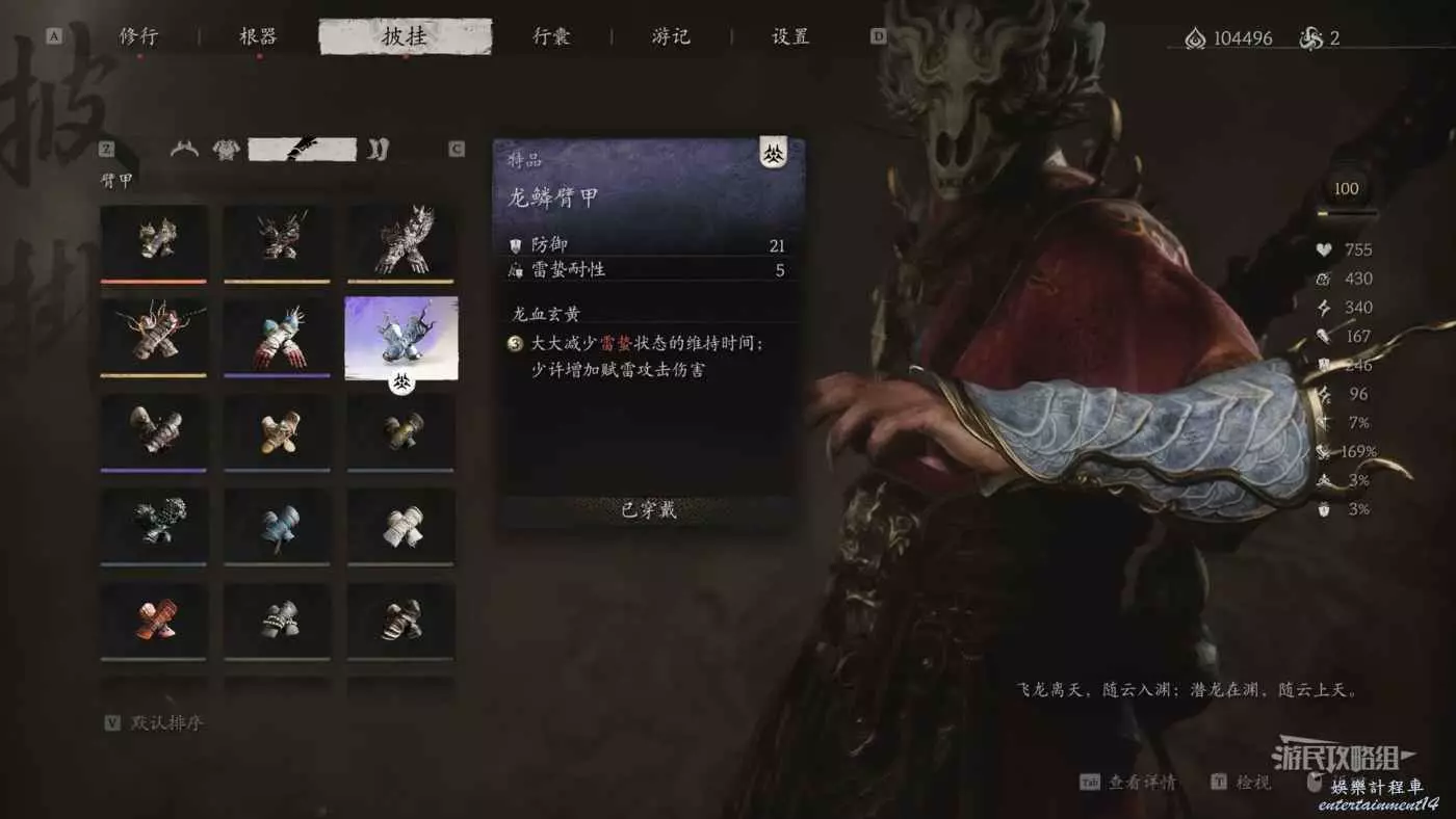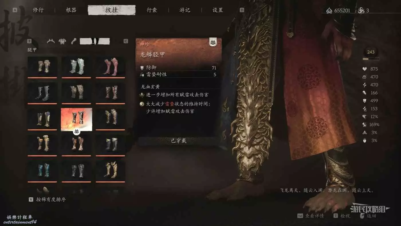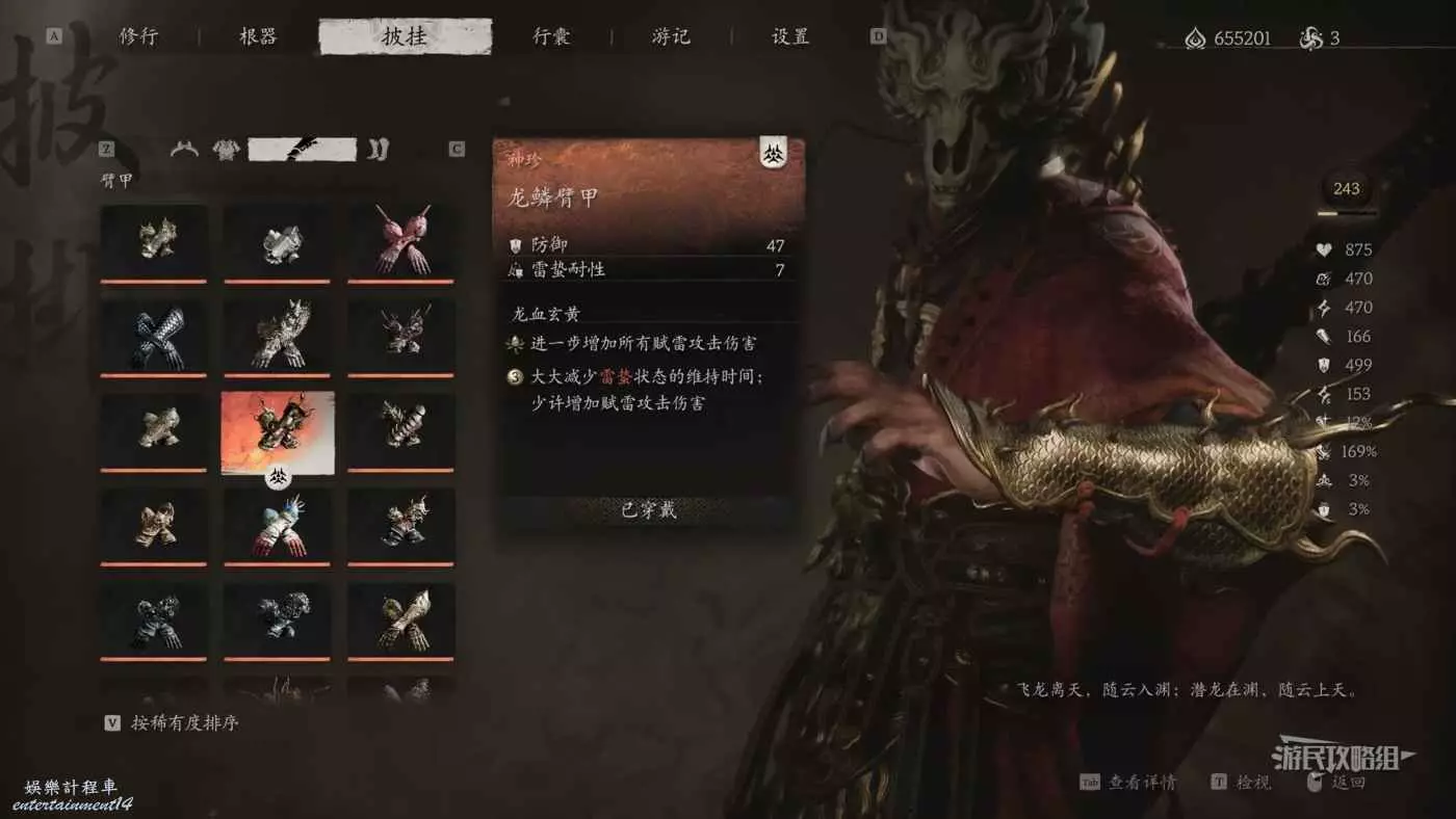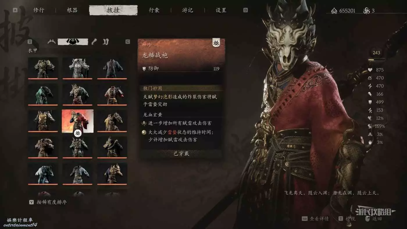 黑神話 悟空 龍鱗套裝滿級屬性及外觀一覽 18 9 月 2024-09-18 廣告 作者:瑞破受氣包 來源:遊民星空 套裝效果 初始防禦:106(衣甲53、臂甲21、腿甲32) 滿級防禦:237(衣甲119、臂甲47、腿甲71) 初始雷蟄耐性:8(臂甲5、腿甲3) 滿級雷蟄耐性:12(臂甲7、腿甲5) 獨門妙用【衣甲】 天賦夢幻泡影造成的炸裂傷害將賦予雷蟄災劫 龍血玄黃 滿級整套:進一步增加所有賦雷攻擊傷害 3件:大大減少雷蟄狀態的維持時間;少許增加賦雷攻擊傷害 套裝外觀 初始外觀 ※頭冠為鱉寶頭骨 滿級外觀 ※頭冠為鱉寶頭骨 部件屬性 初始屬性 滿級屬性