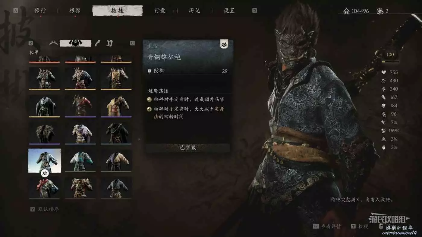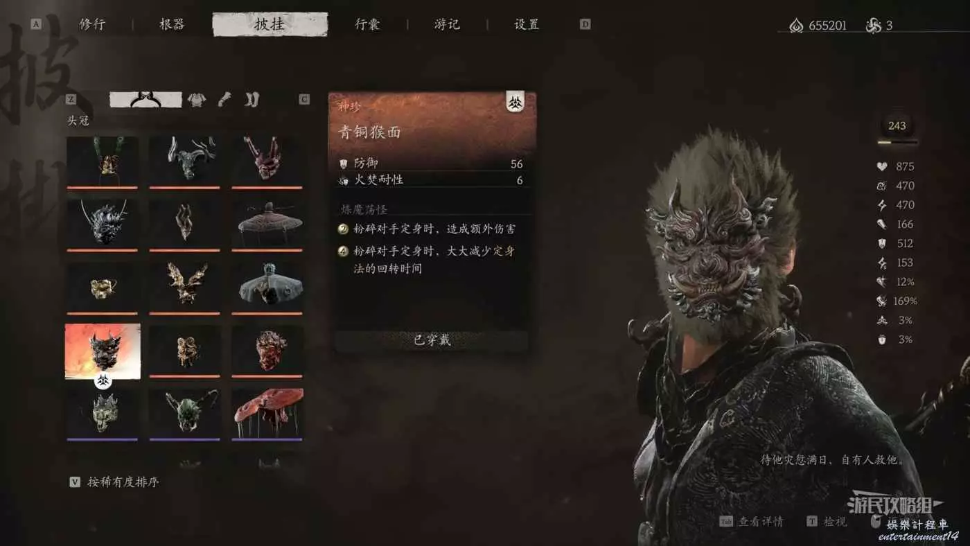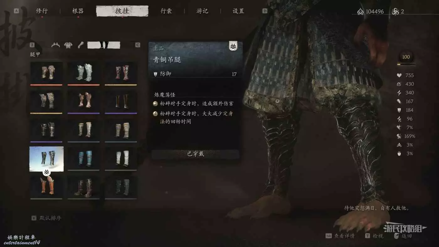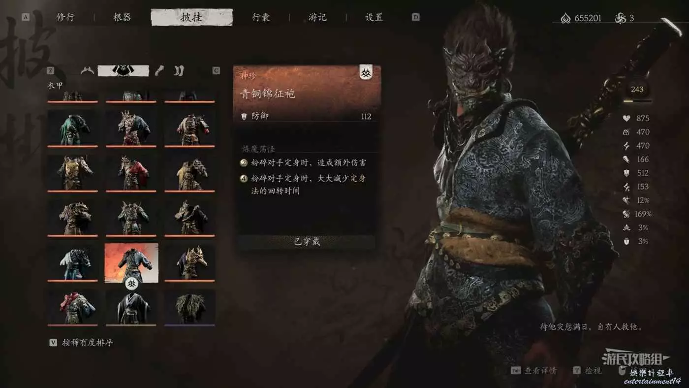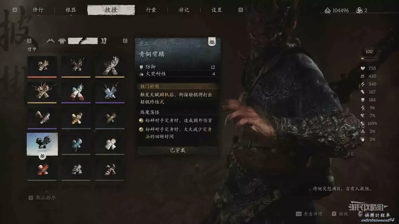 黑神話 悟空 青銅套裝滿級屬性及外觀一覽 18 9 月 2024-09-18 廣告 作者:瑞破受氣包 來源:遊民星空 套裝效果 初始防禦:74(頭冠16、衣甲29、臂甲12、腿甲17) 滿級防禦:280(頭冠56、衣甲112、臂甲45、腿甲67) 初始火焚耐性:7(頭冠3、臂甲4) 滿級火焚耐性:13(頭冠6、臂甲7) 獨門妙用【臂甲】 觸發天賦瞬機後,銜接輕棍將打出輕棍終結式 煉魔蕩怪 2件:粉碎對手定身時造成額外傷害 4件:粉碎對手定身時大大減少定身法的回轉時間 套裝外觀 ※滿級外觀無變化 部件屬性 初始屬性 滿級屬性