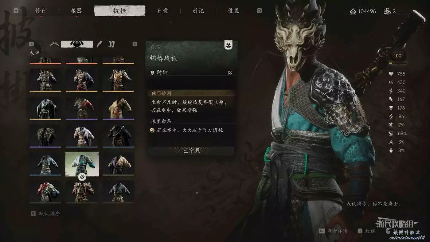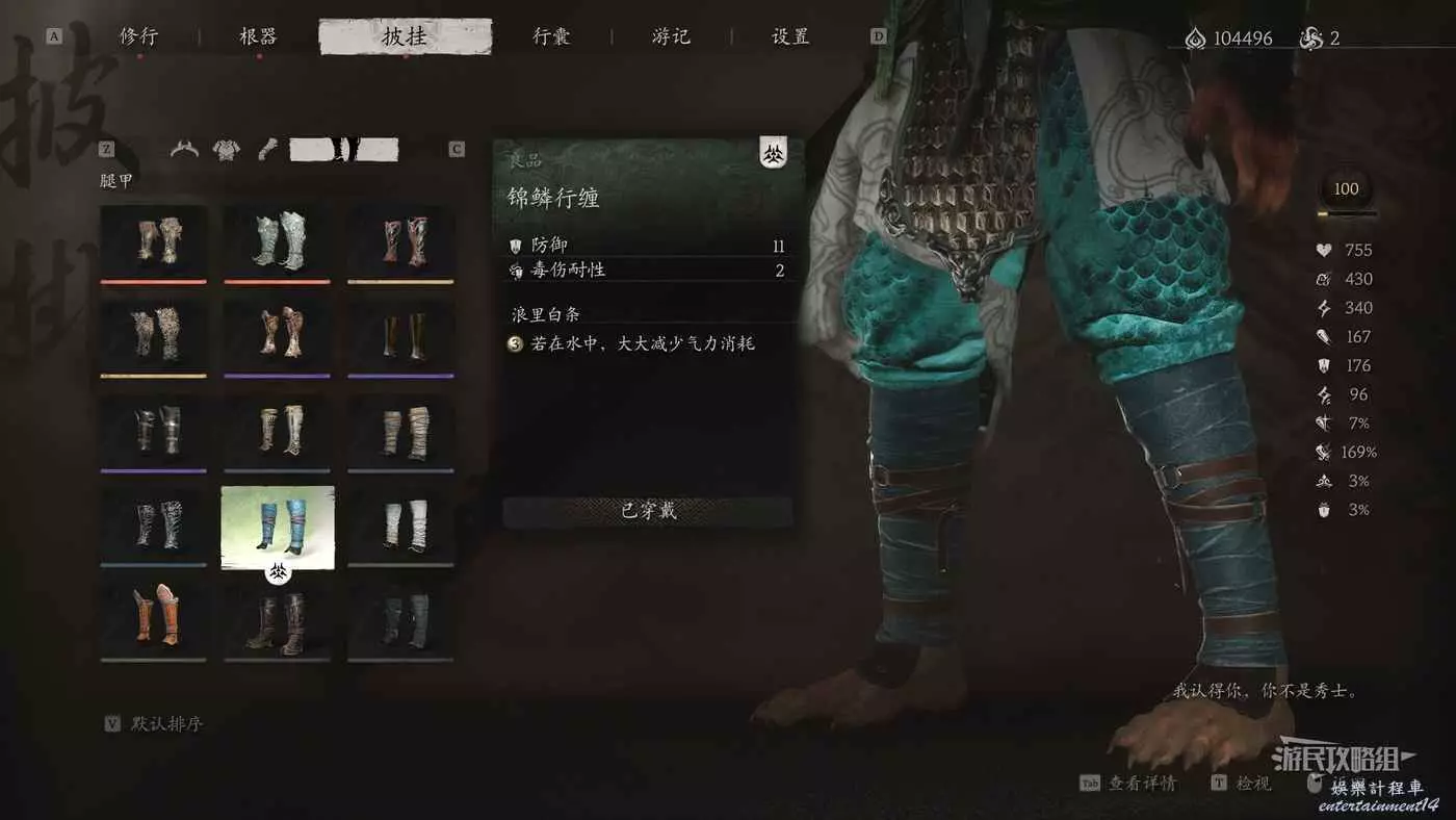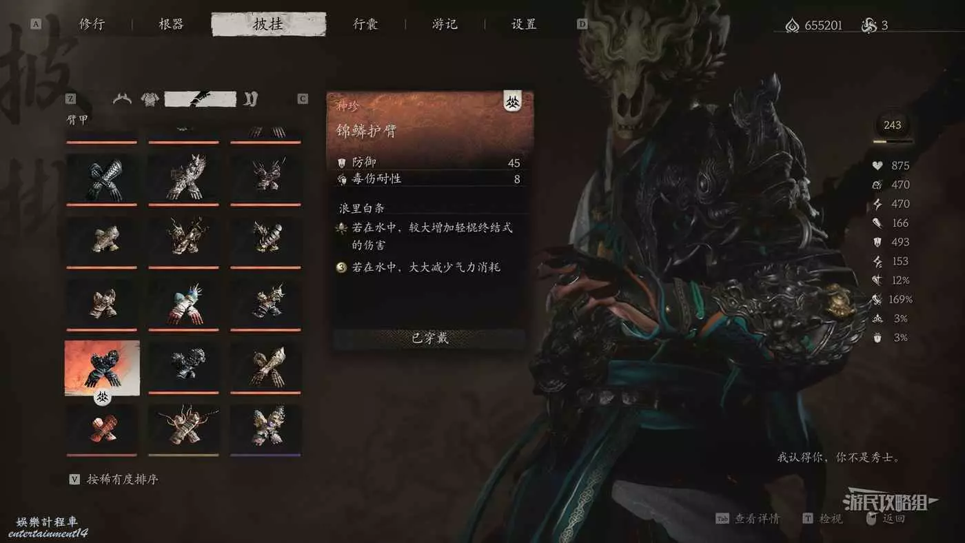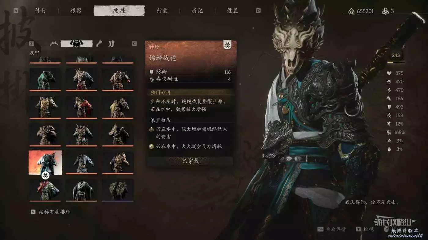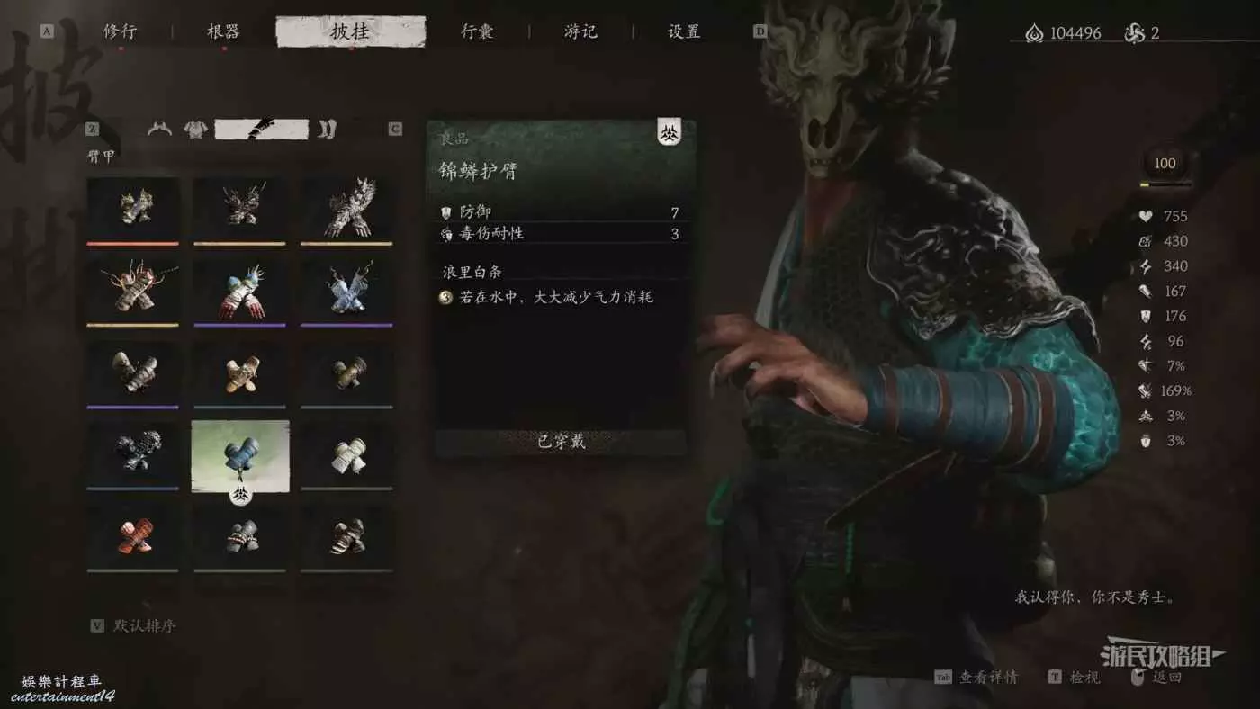 黑神話 悟空 錦鱗套裝滿級屬性及外觀一覽 18 9 月 2024-09-18 廣告 作者:瑞破受氣包 來源:遊民星空 套裝效果 初始防禦:36(衣甲18、臂甲7、腿甲11) 滿級防禦:231(衣甲116、臂甲45、腿甲70) 初始毒傷耐性:5(臂甲3、腿甲2) 滿級毒傷耐性:18(衣甲4、臂甲8、腿甲6) 獨門妙用【衣甲】 生命不足時,緩緩恢復些微生命,若在水中,效果增強 浪裡白條 滿級整套:若在水中,較大增加輕棍終結式的傷害 3件:若在水中大大減少氣力消耗 套裝外觀 初始外觀 ※頭冠為鱉寶頭骨 滿級外觀 ※頭冠為鱉寶頭骨 部件屬性 初始屬性 滿級屬性