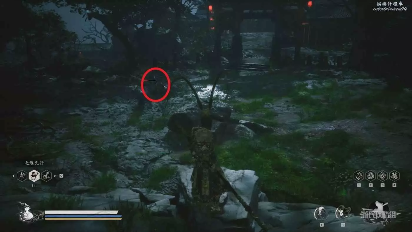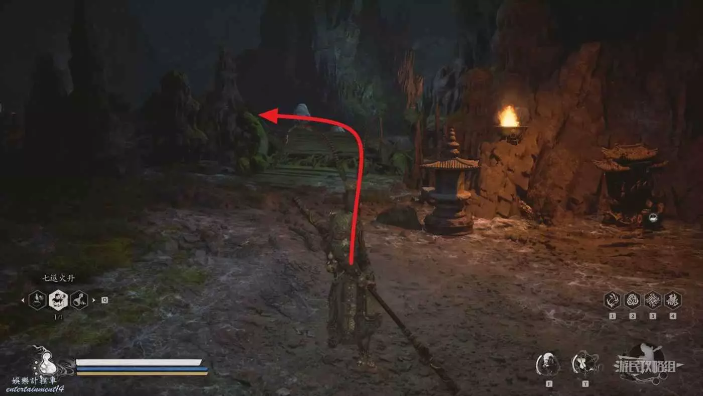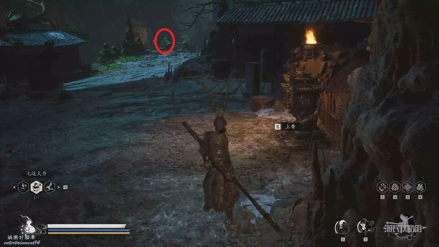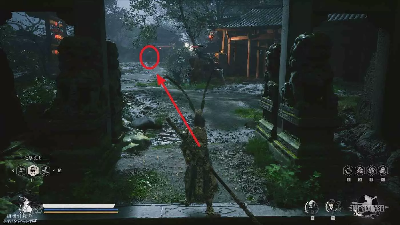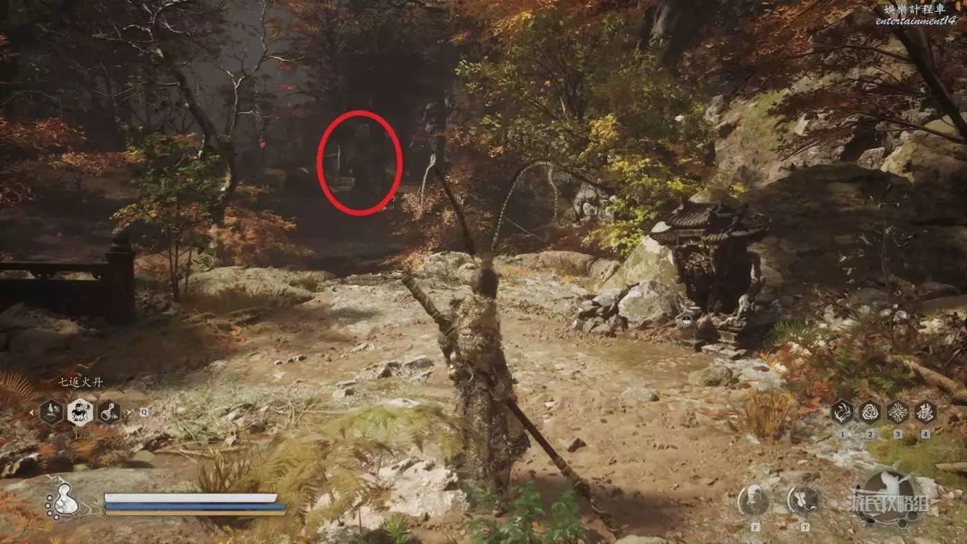 從【上層】的土地廟出發,往土地廟旁邊的懸崖走,參考下圖箭頭所示位置,就在懸崖邊可以看到這個敵人。後續地圖還可以拿到它的精魄。