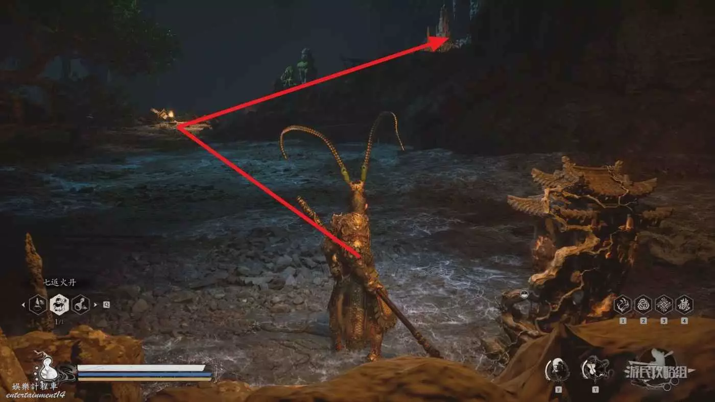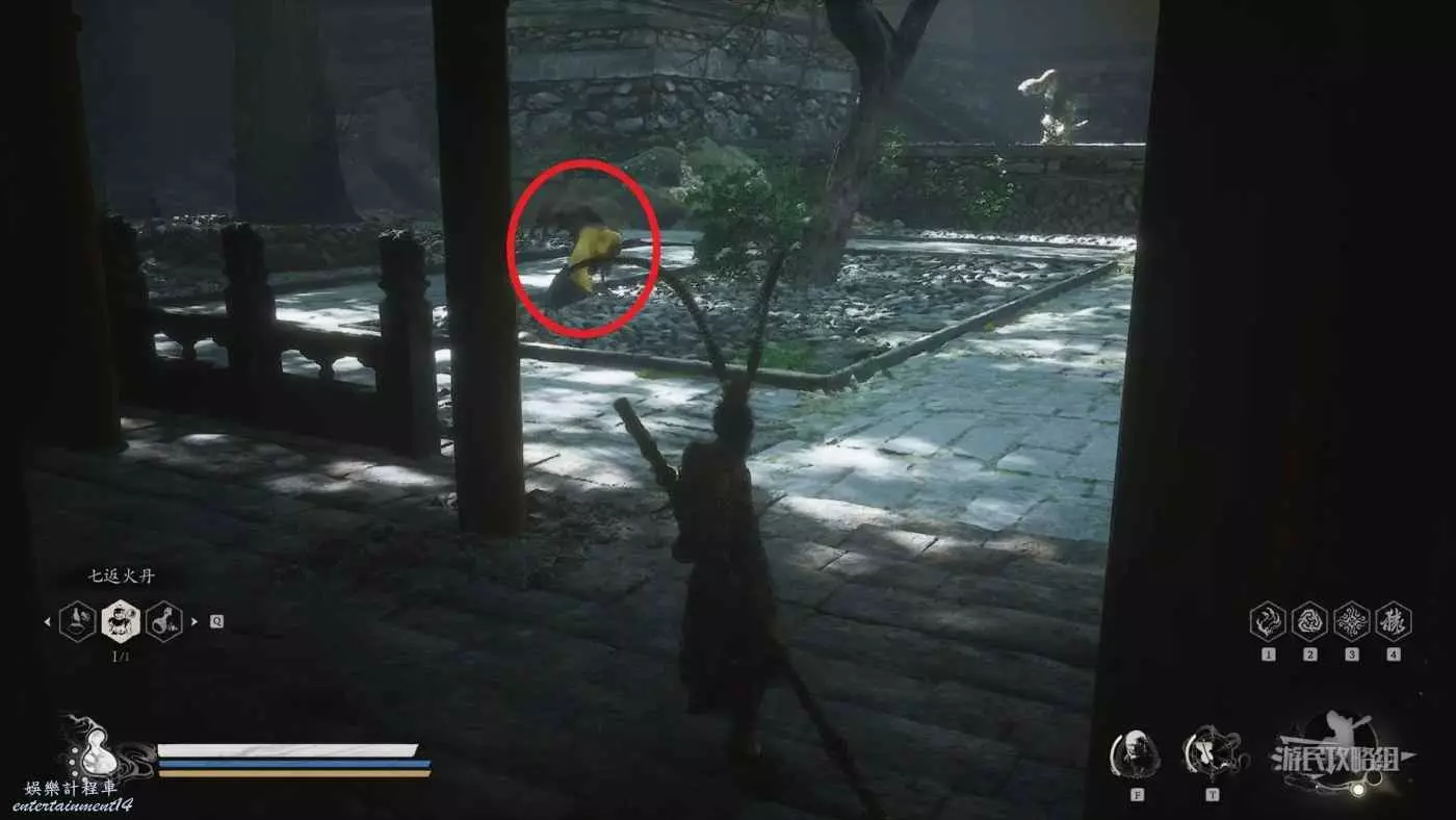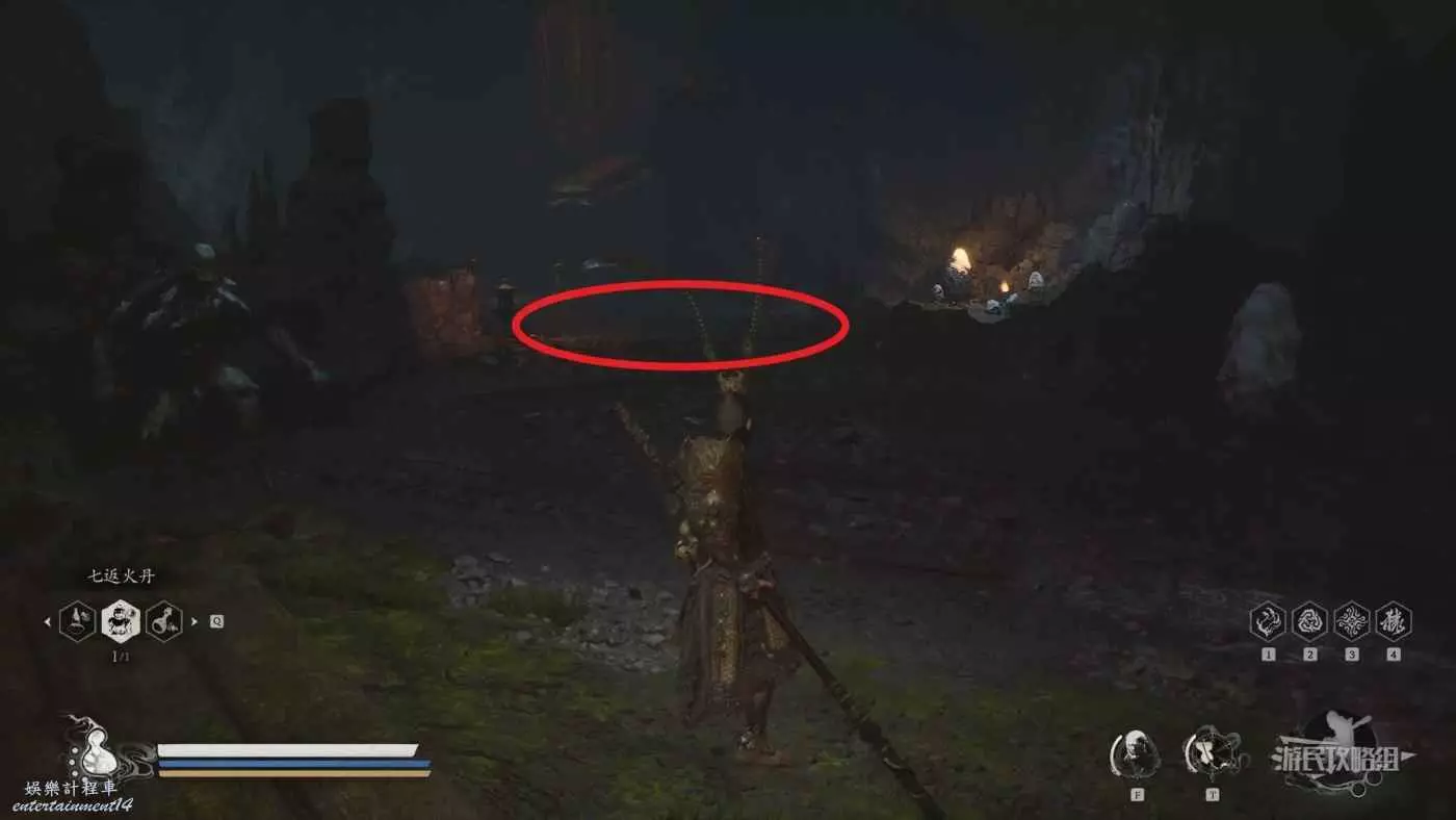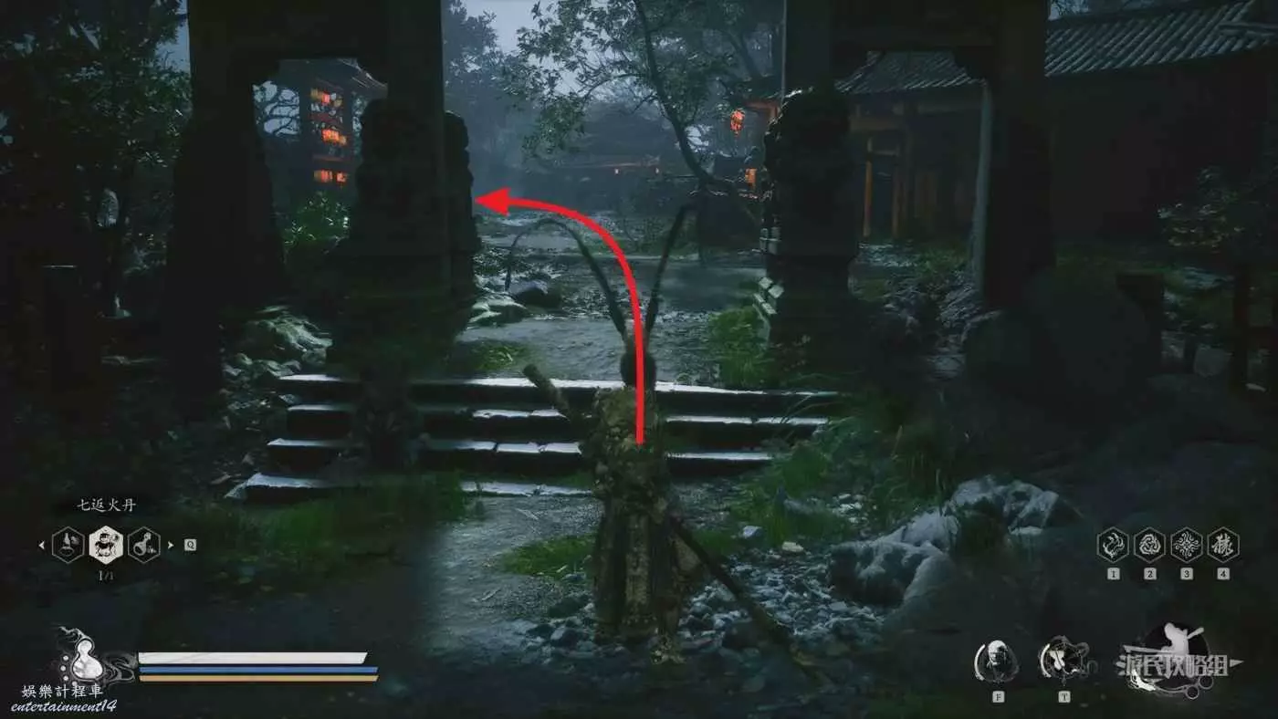 從【上層】的土地廟出發,往土地廟旁邊的懸崖走,參考下圖箭頭所示位置,就在懸崖邊可以看到這個敵人。後續地圖還可以拿到它的精魄。