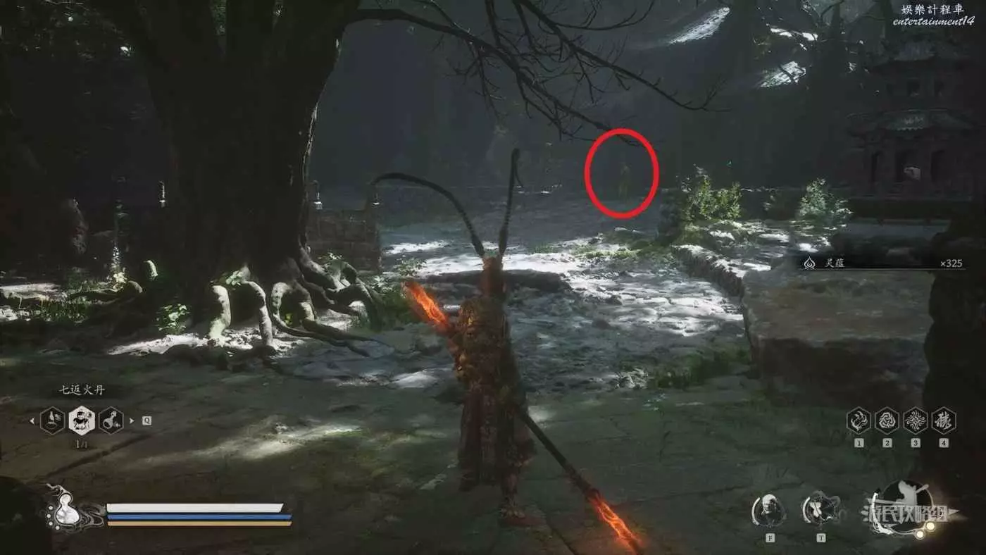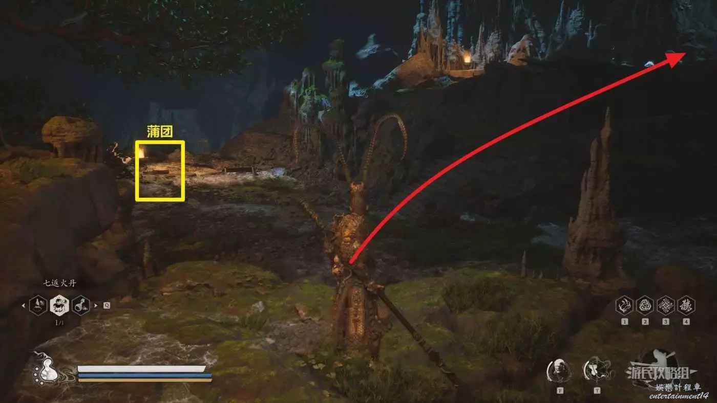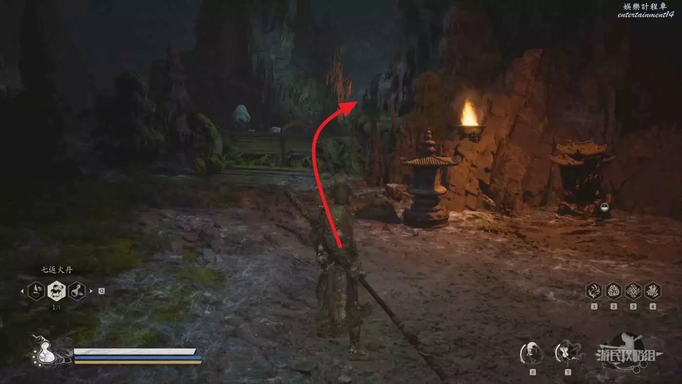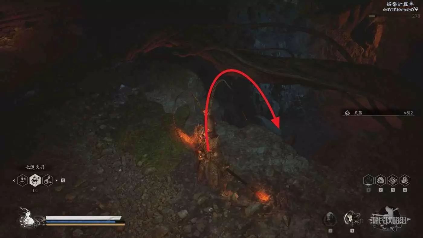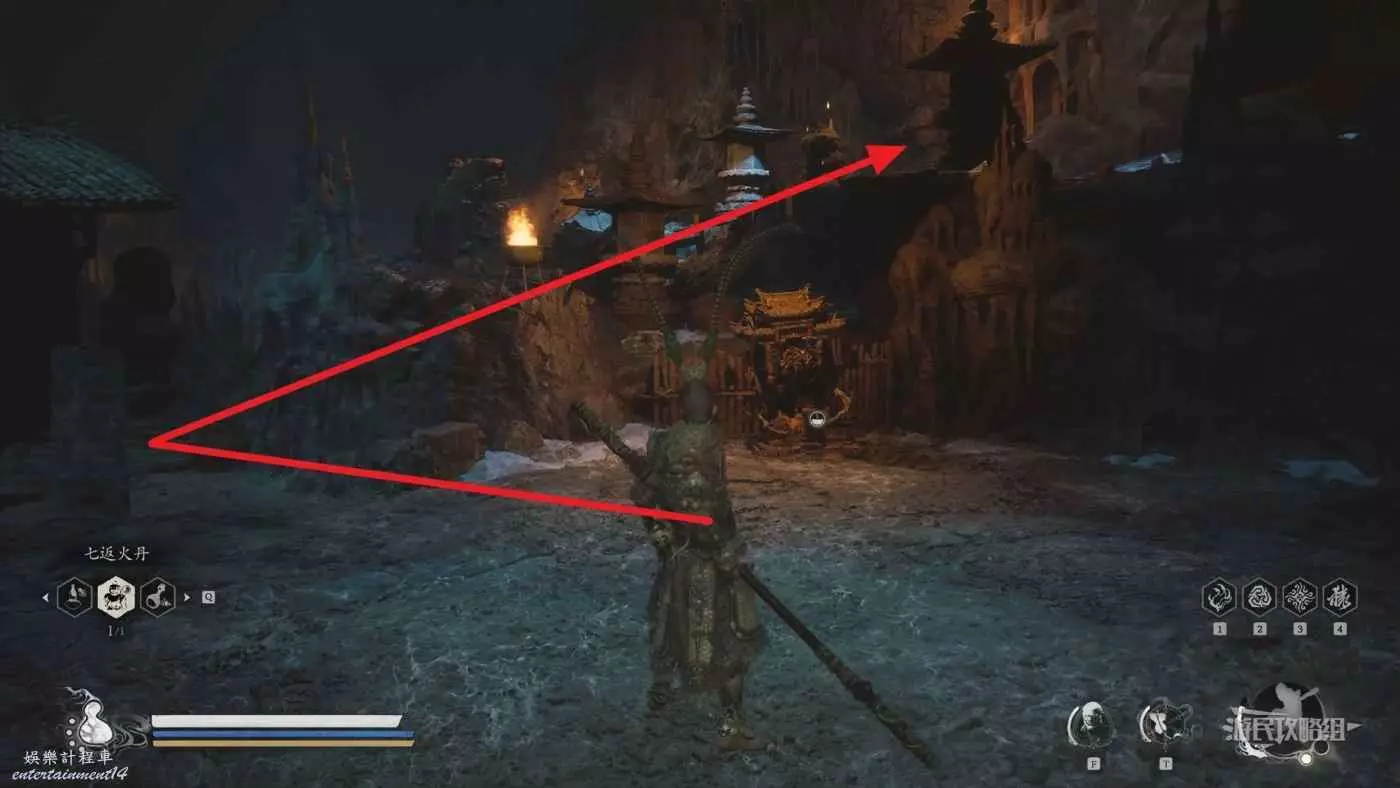 從【上層】的土地廟出發,往土地廟旁邊的懸崖走,參考下圖箭頭所示位置,就在懸崖邊可以看到這個敵人。後續地圖還可以拿到它的精魄。