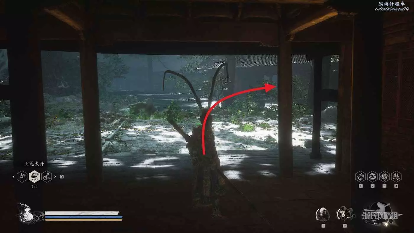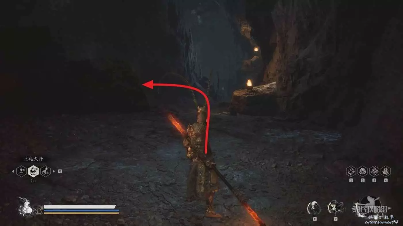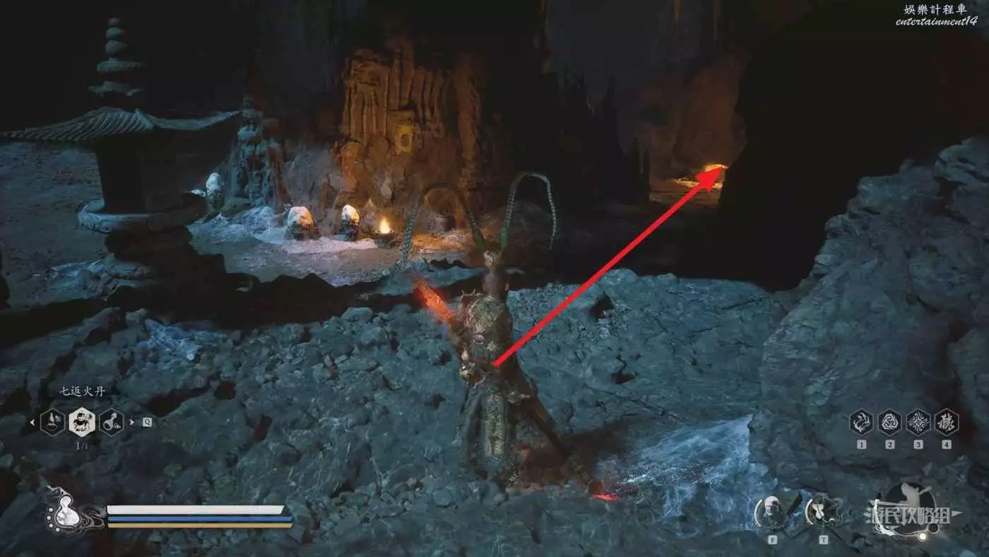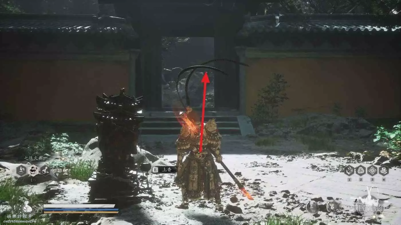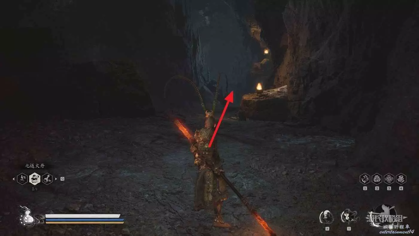 從【上層】的土地廟出發,往土地廟旁邊的懸崖走,參考下圖箭頭所示位置,就在懸崖邊可以看到這個敵人。後續地圖還可以拿到它的精魄。