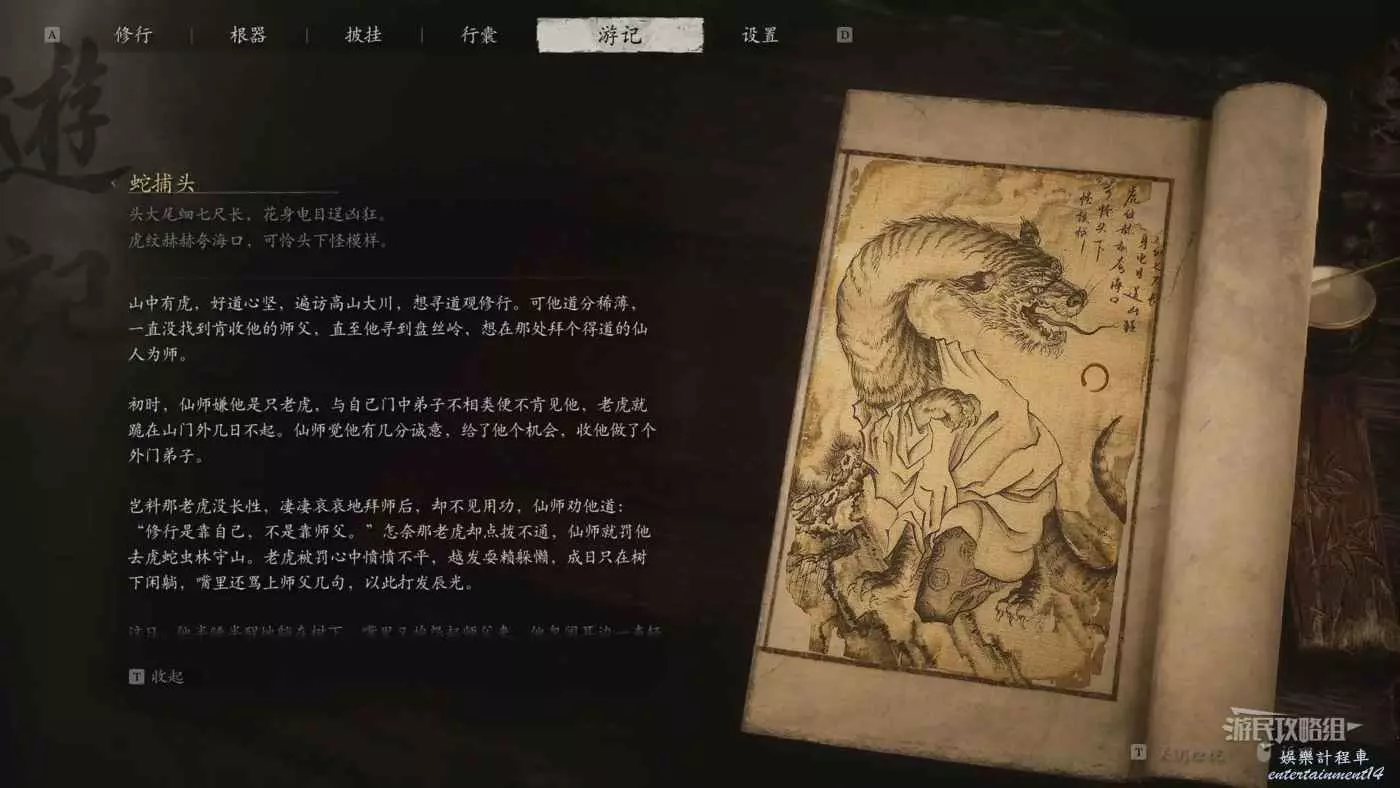 從【山道】土地廟出發,沿著唯一的路往前走,走到頭在一個棺材前可以看到這個敵人。擊殺蛇捕頭有幾率掉落仙品珍玩虎筋絛子。並且後續地圖中還可以拿到它的精魄。