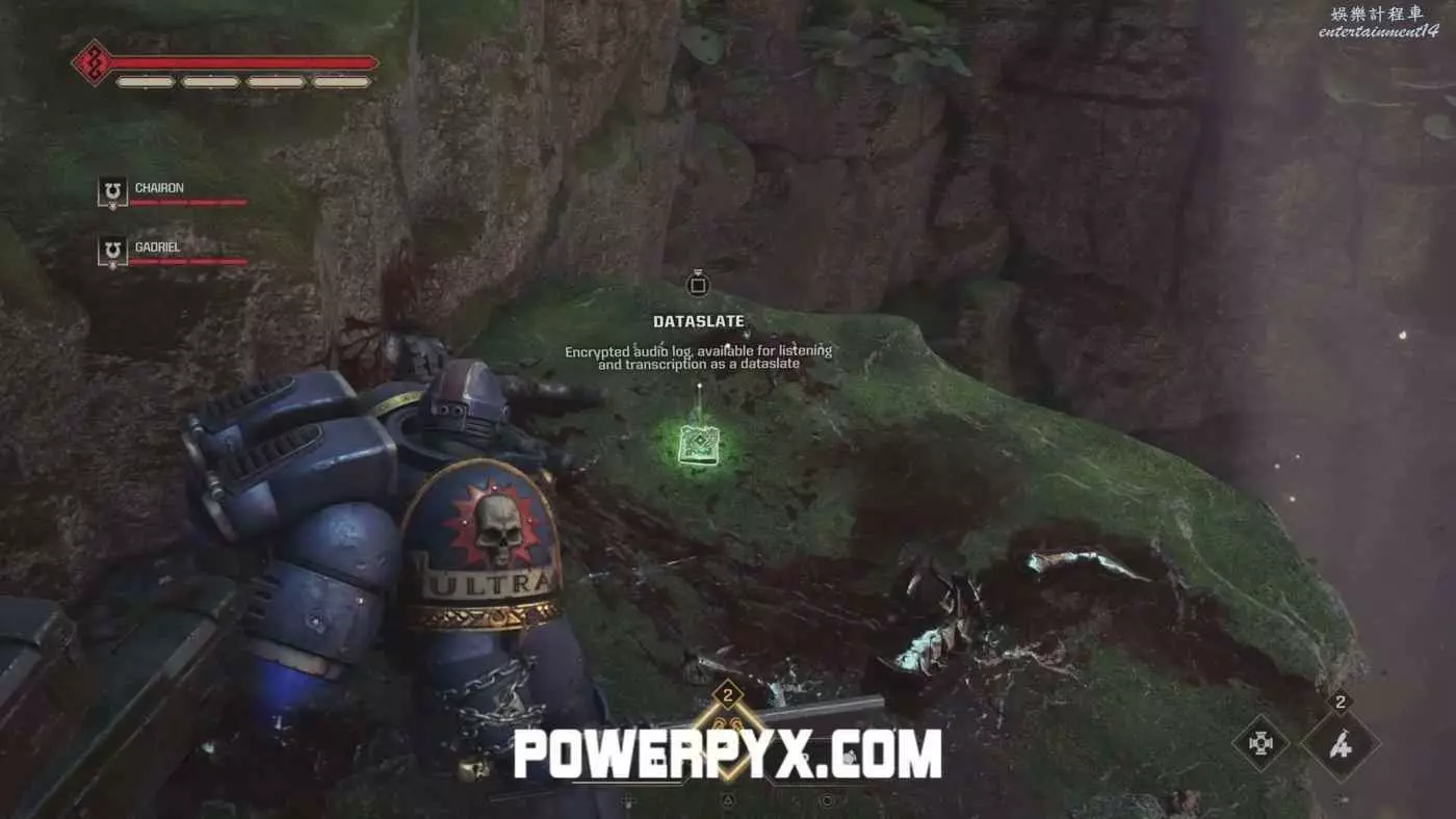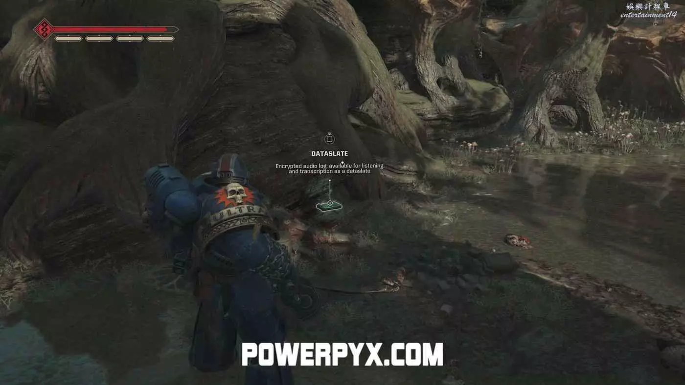 在沼澤區域的初始位置,在“穿過沼澤”任務目標左側,射擊左側的爆炸植物會顯出一條道路,沿路走到盡頭即可看到資料板。