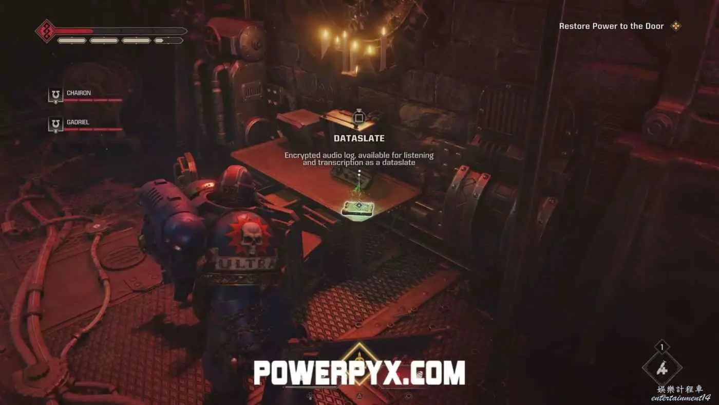 與牆板互動打開一扇紅色大鐵門,之後需要進入建築並穿過幾條隧道。從第一條路往右走,然後一直向左走直到盡頭,在角落的桌子上即可看到這個資料板,就在需要恢復電力的大門左邊。