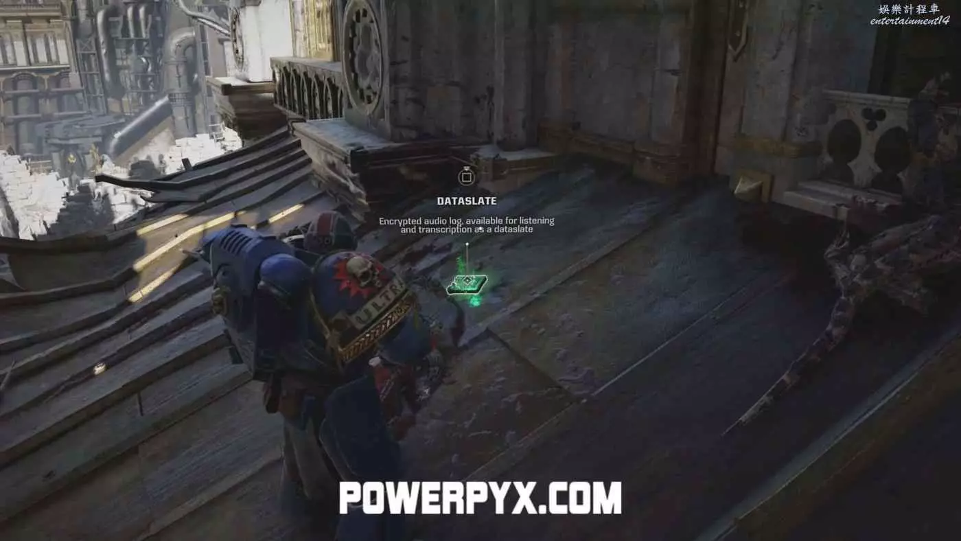 在前往任務目標“前往大教堂”的路上,使用噴氣背包跳過牆壁平台後,沿著彈藥箱的左側前進,資料板就在廢墟裡。