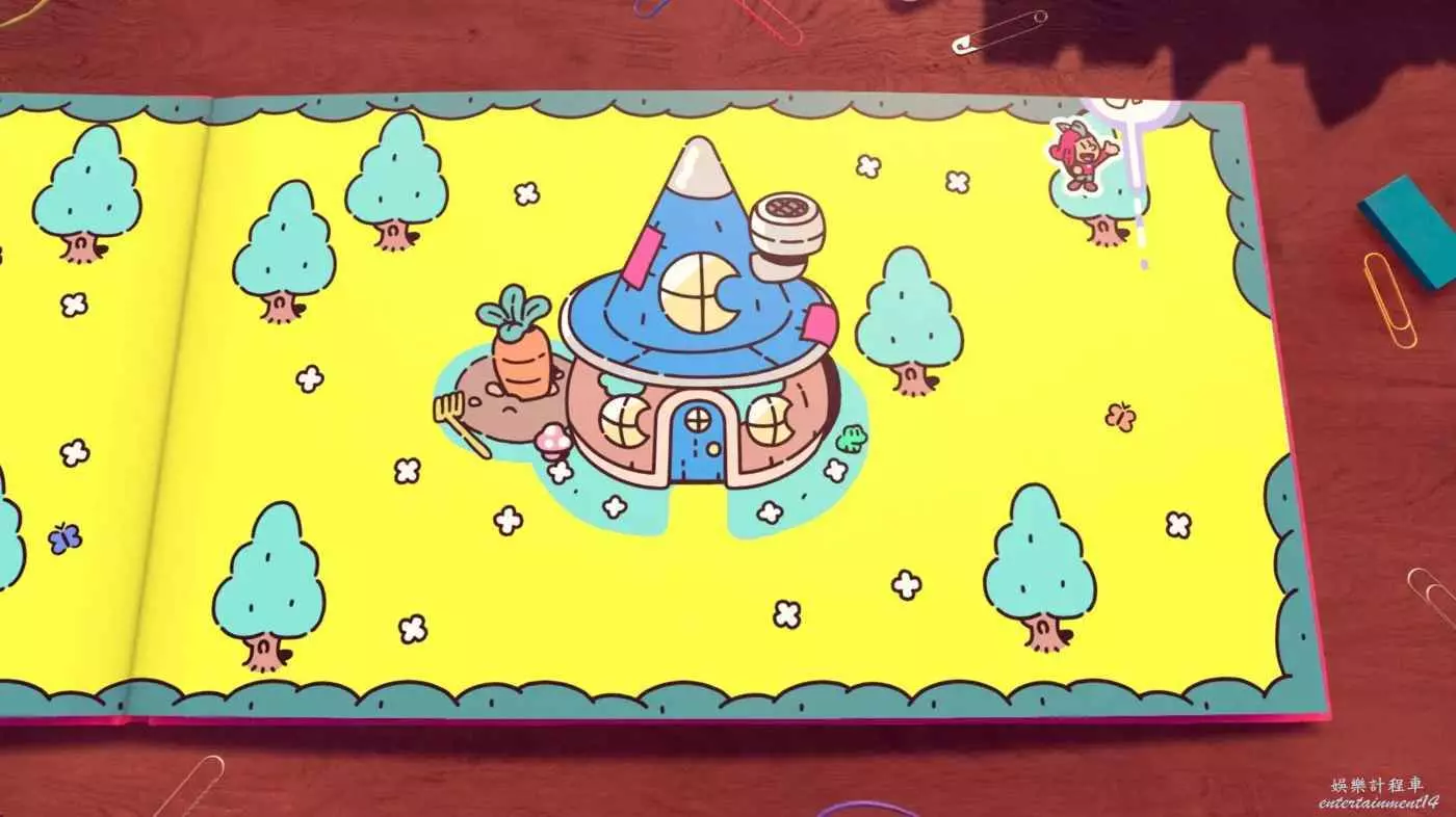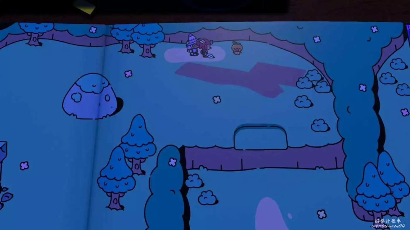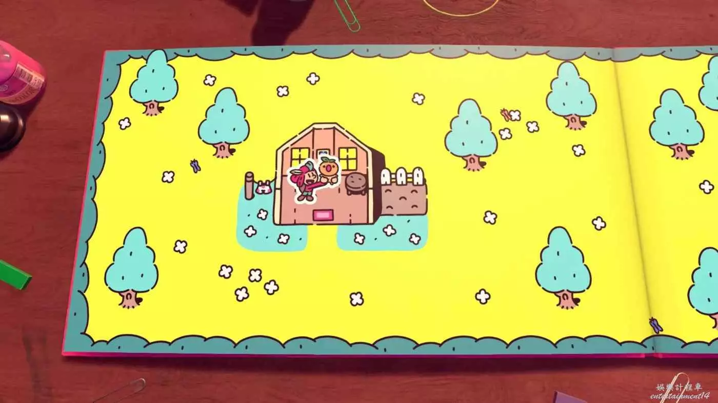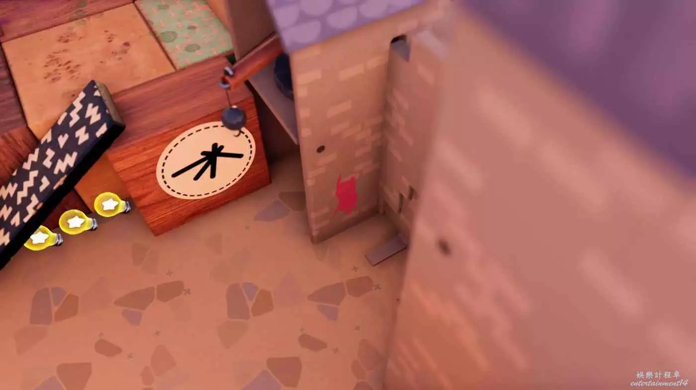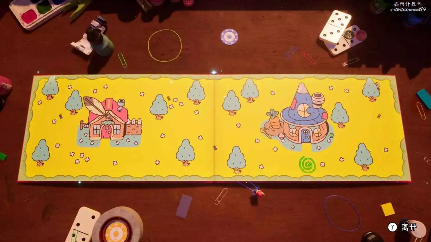 進入城鎮後,回到3D世界並往前翻兩頁,左側的空白處有傳送門,回到書本中進入房間