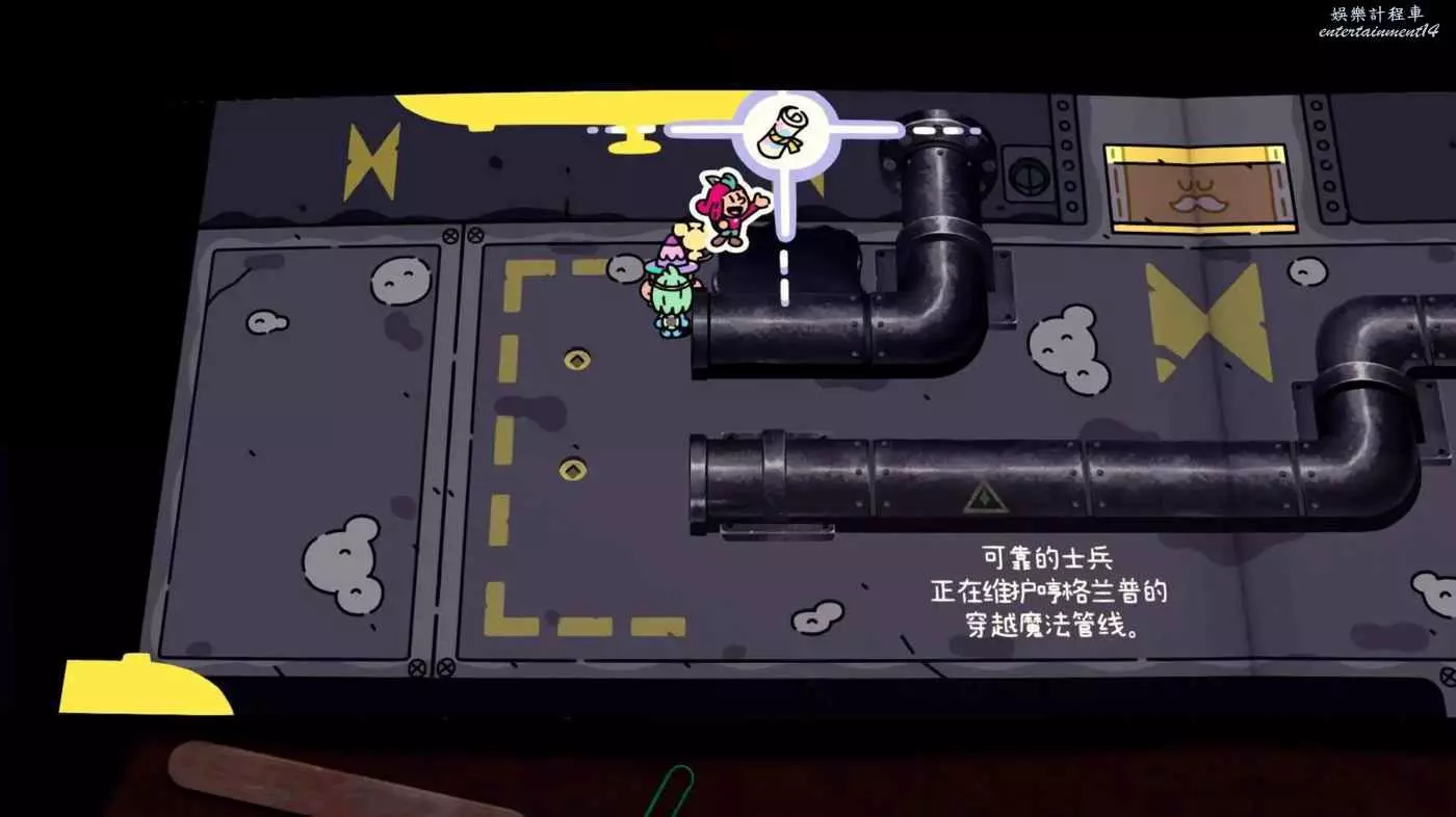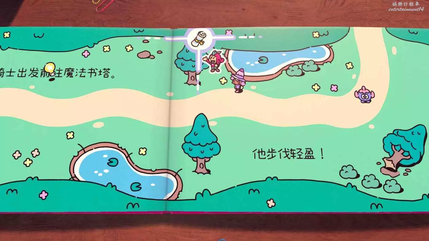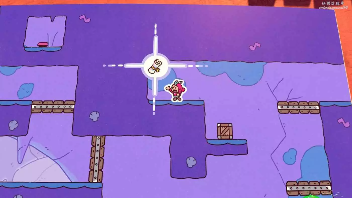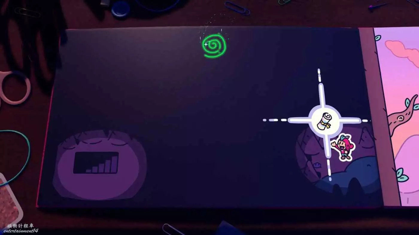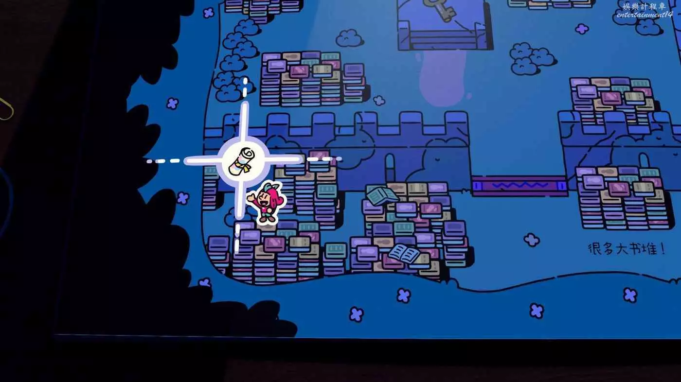 進入城鎮後,回到3D世界並往前翻兩頁,左側的空白處有傳送門,回到書本中進入房間