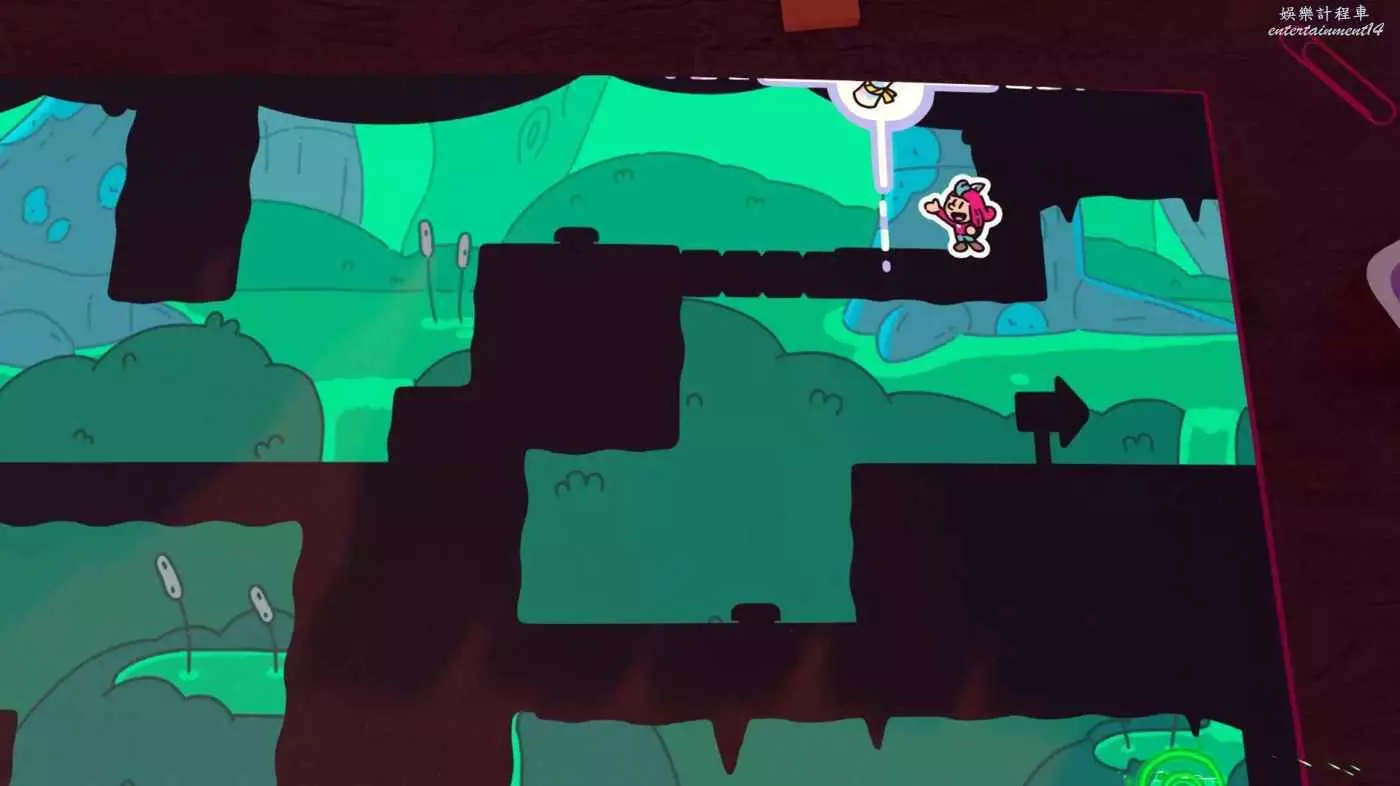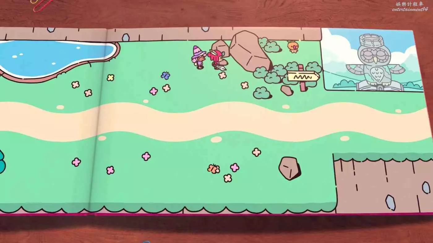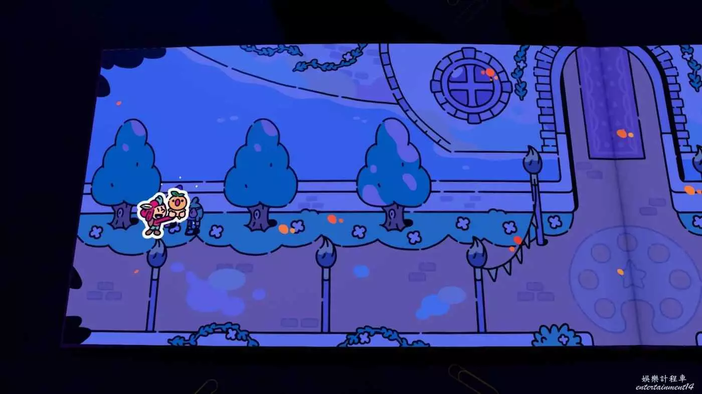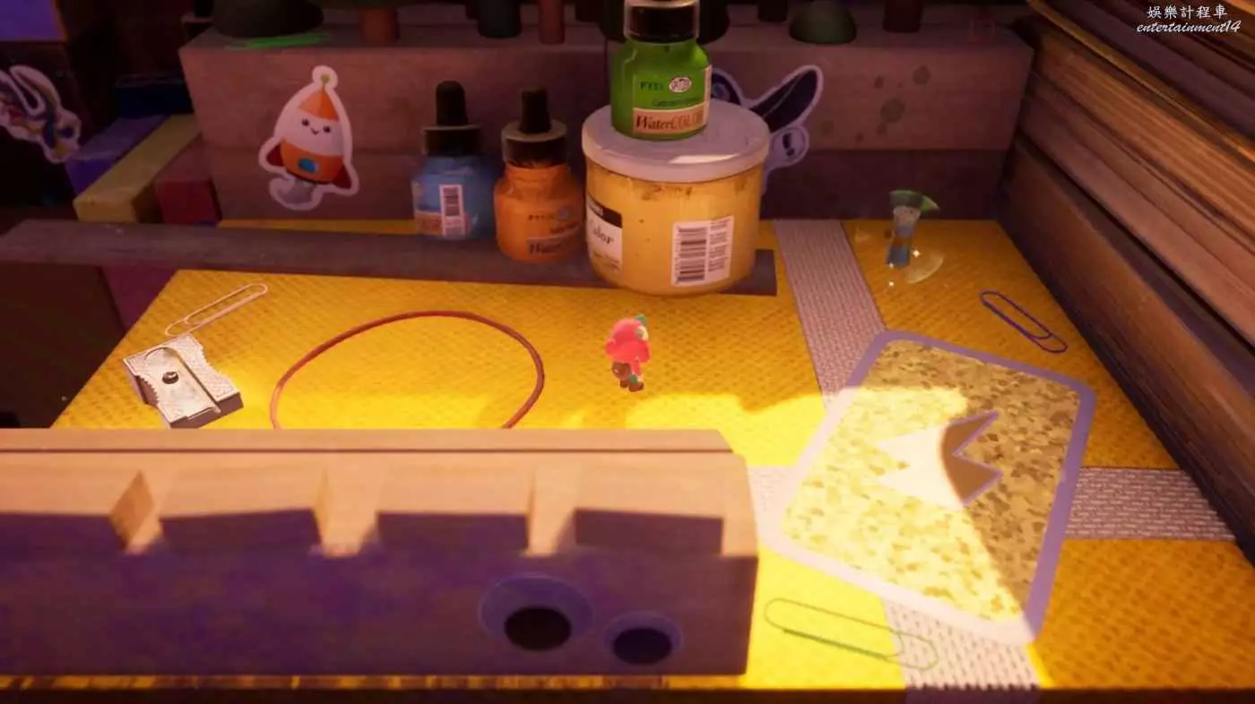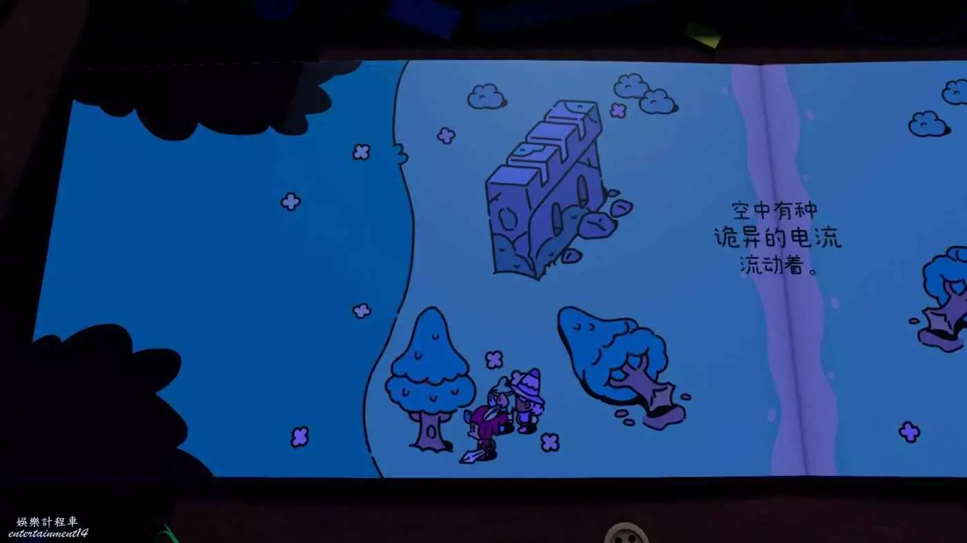 進入城鎮後,回到3D世界並往前翻兩頁,左側的空白處有傳送門,回到書本中進入房間