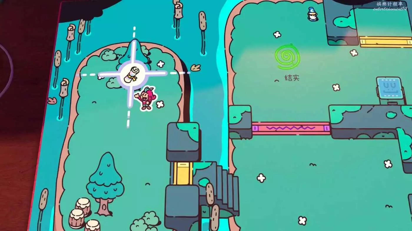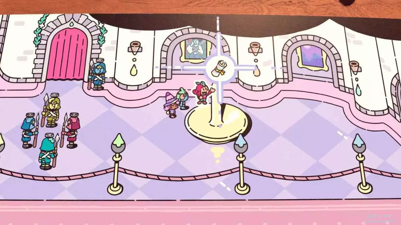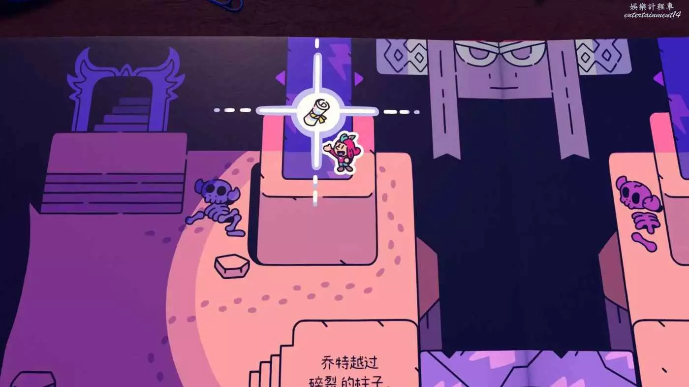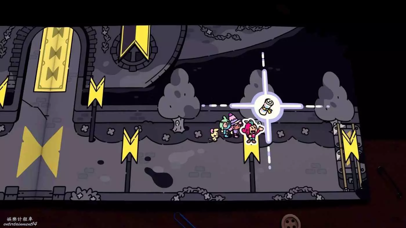進入城鎮後,回到3D世界並往前翻兩頁,左側的空白處有傳送門,回到書本中進入房間