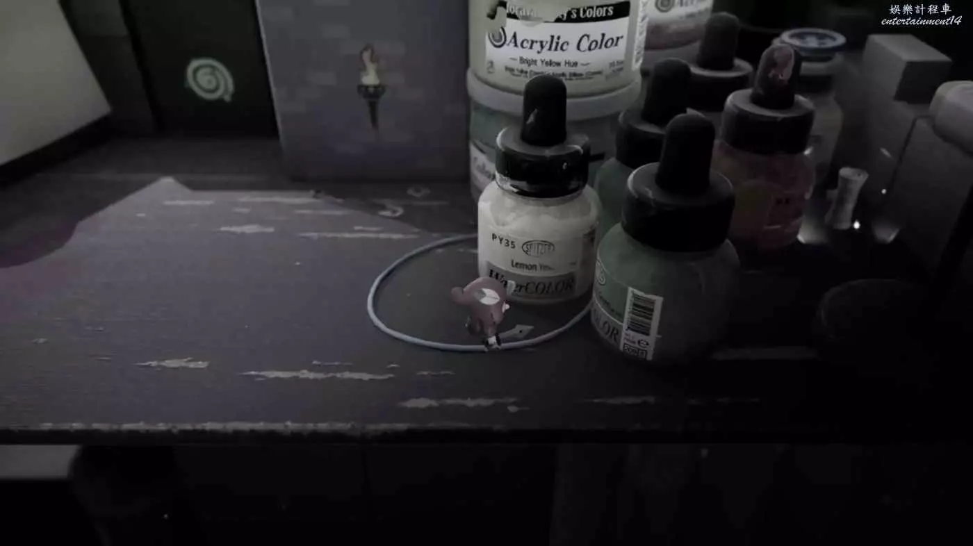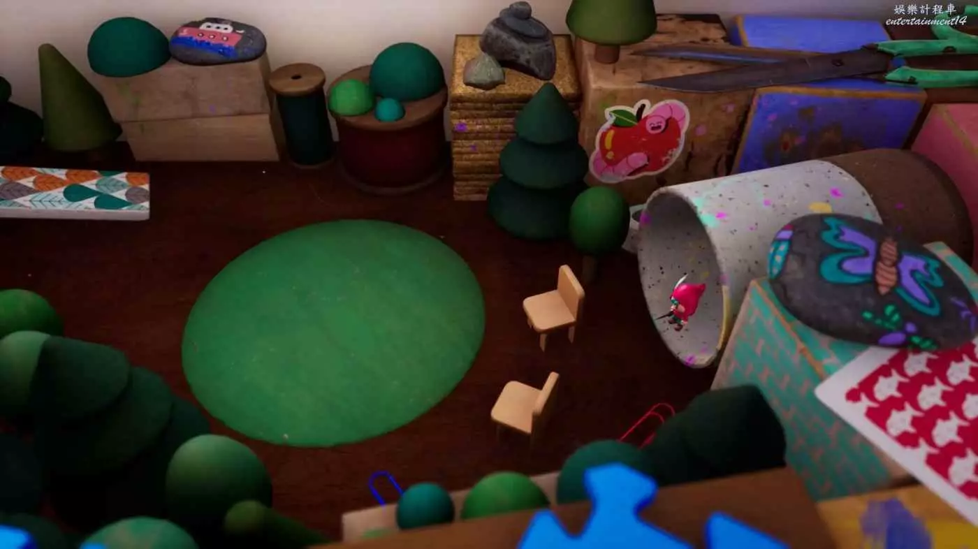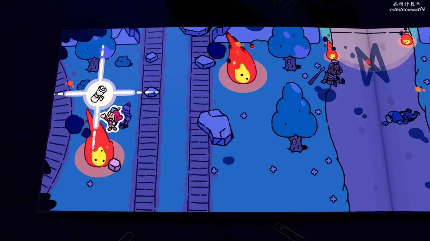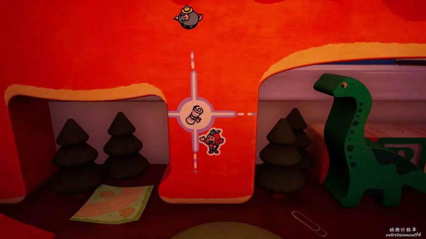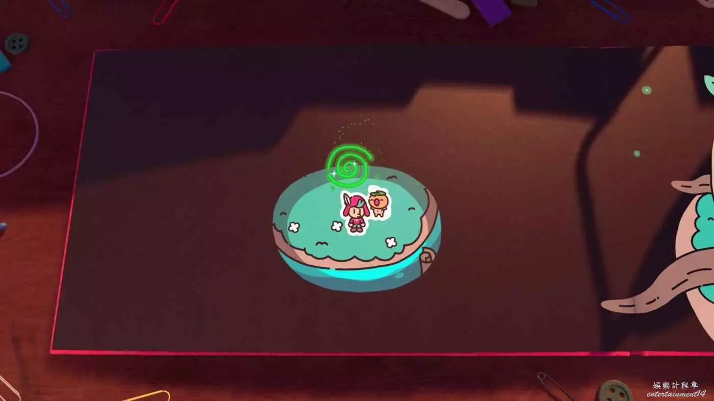 進入城鎮後,回到3D世界並往前翻兩頁,左側的空白處有傳送門,回到書本中進入房間