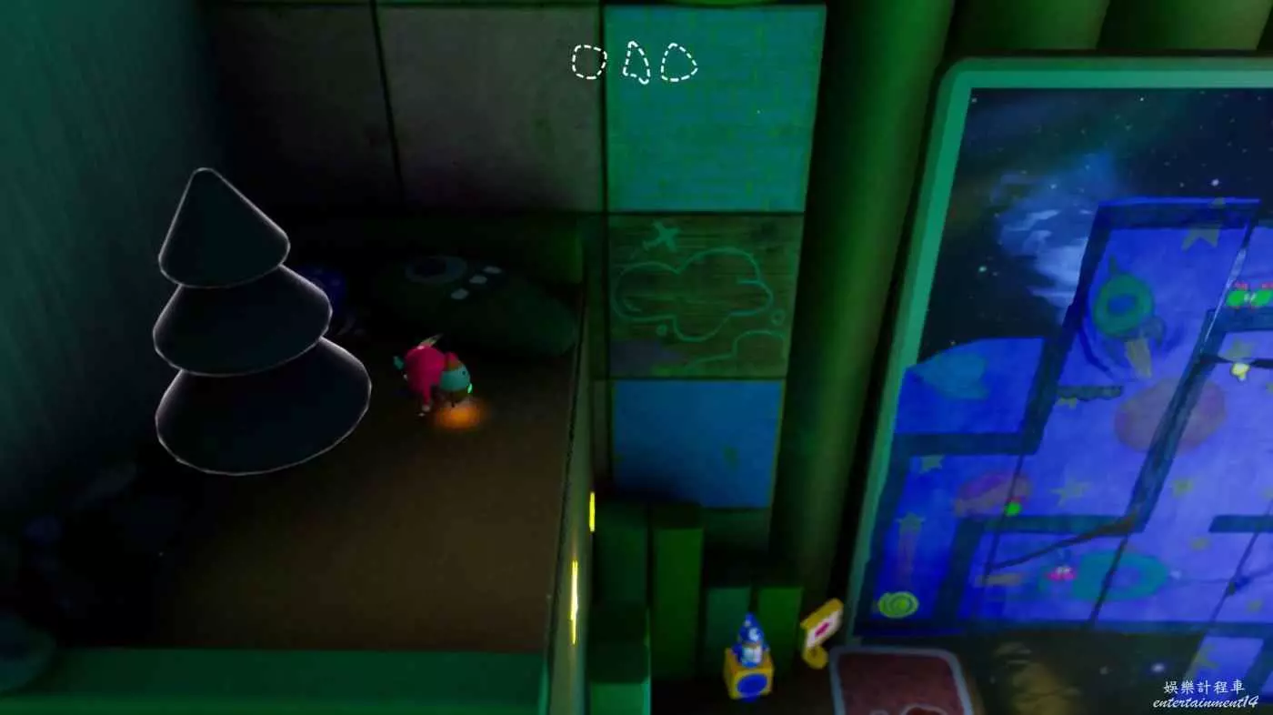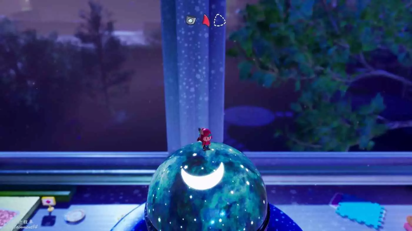 獲得小火箭背包後,書桌左側,在劇情路線讓你轉換成2D時,繼續向左飛上平台的樹