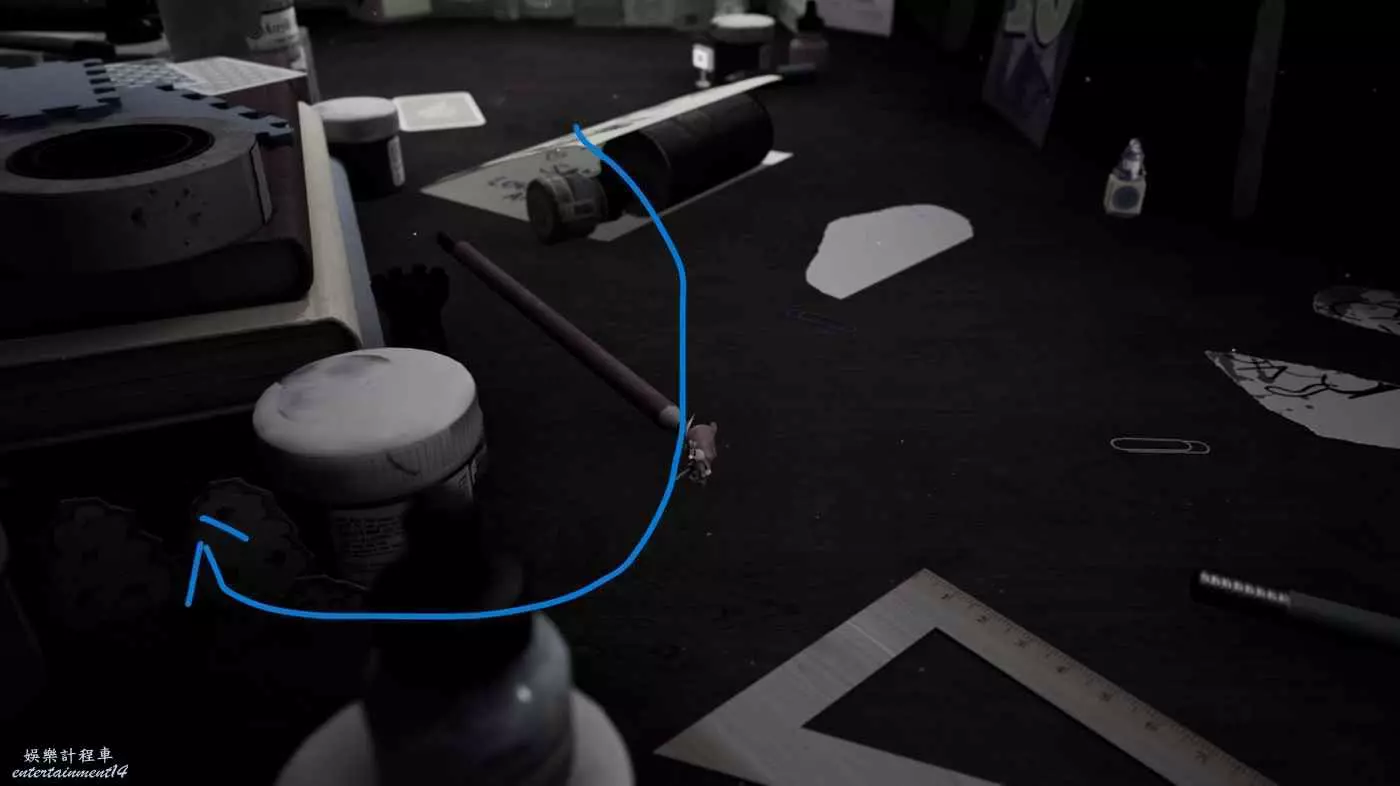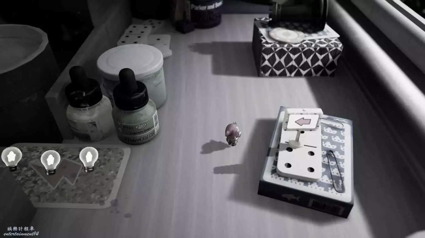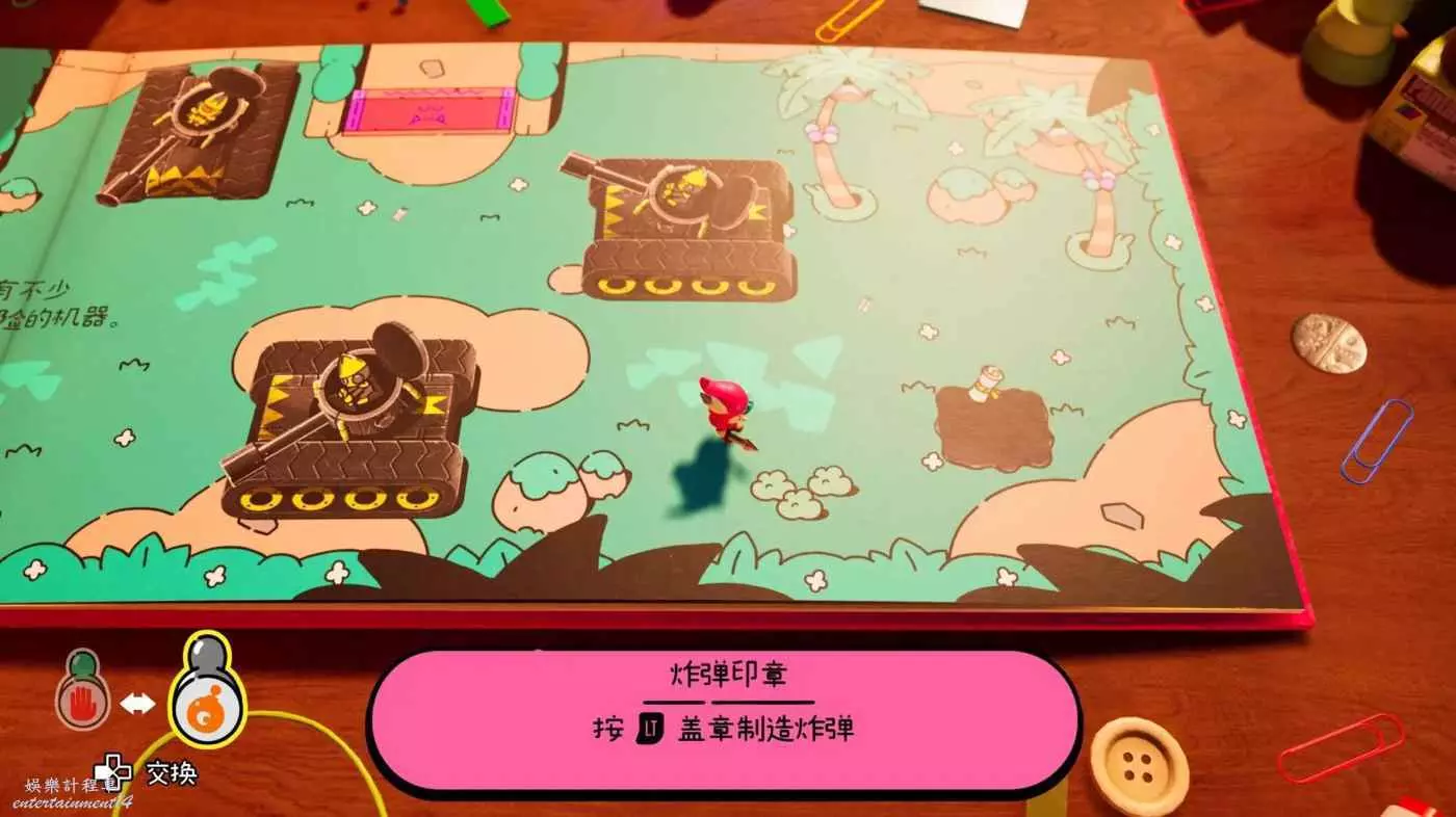 章節第二頁,進入3D世界後(劇情需要用炸彈印章摧毀坦克),在桌子的右側書堆後