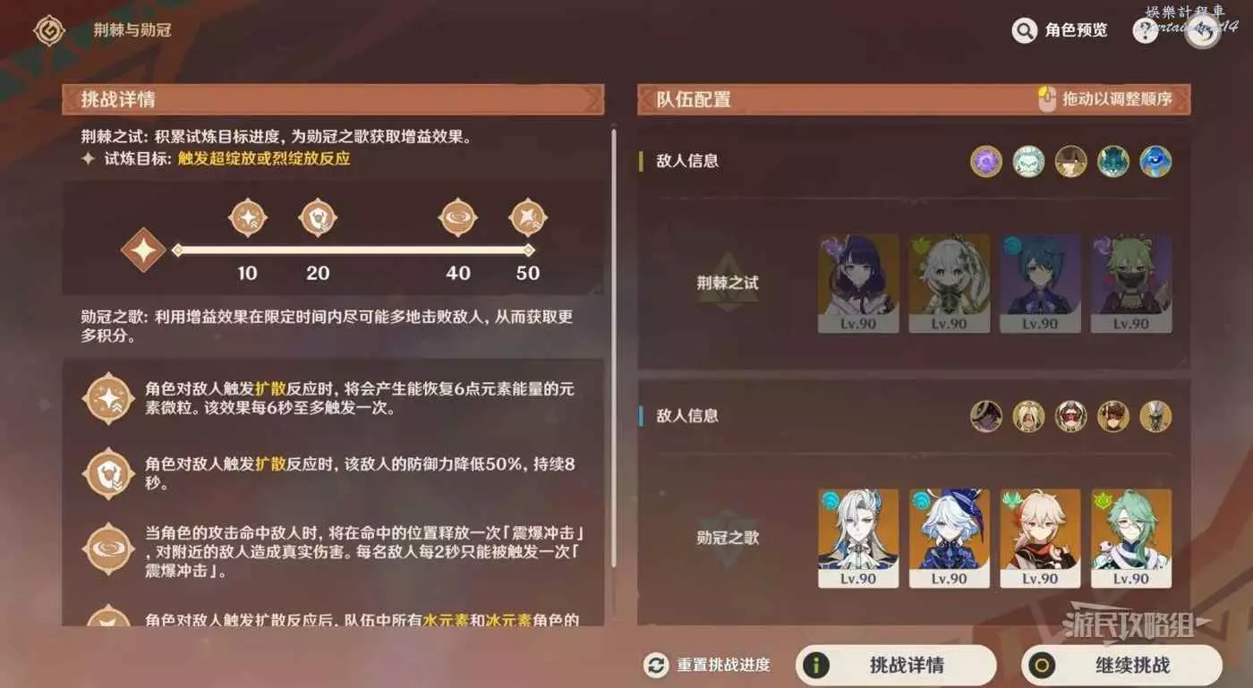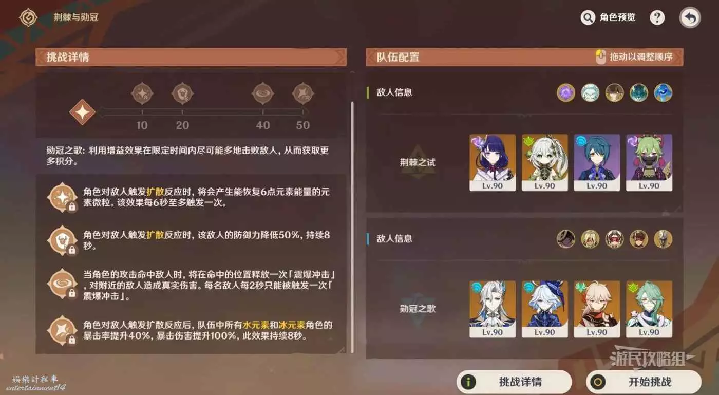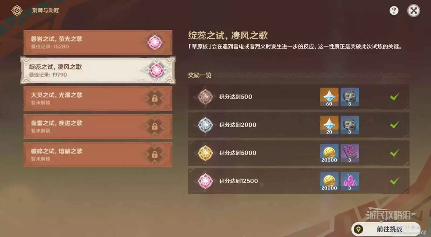 第二關積分倍率選擇無畏10倍。上半場【荊棘之試】需要儘量多地出發超綻放或烈綻放反應,根據觸發反應的次數啟動增益效果,下半場【勳冠之歌】根據增益效果推薦用風擴水或冰的打法,簡單來說就是上半用超綻放/烈綻放拿滿增益,下半注意元素選擇自己已經培養好的成型隊伍儘量多地擊敗敵人即可。