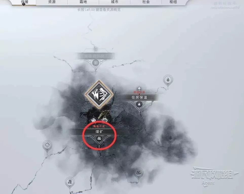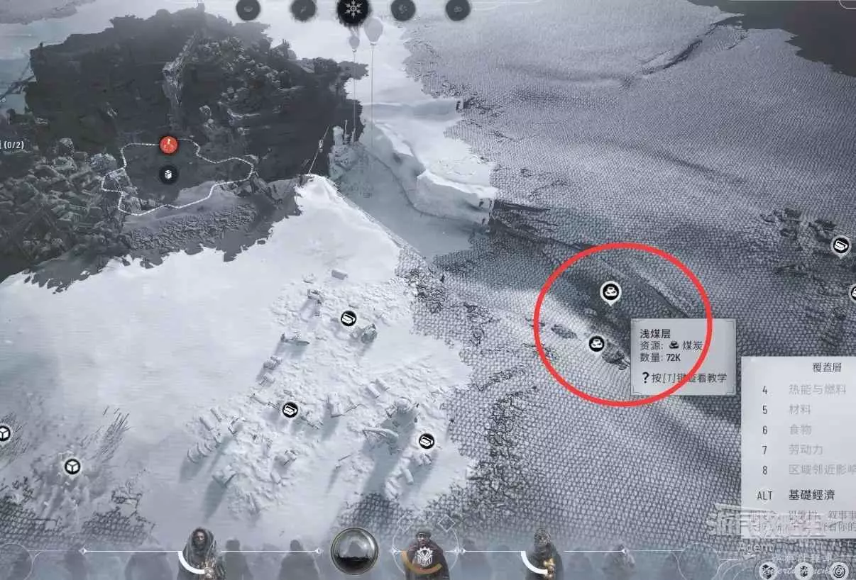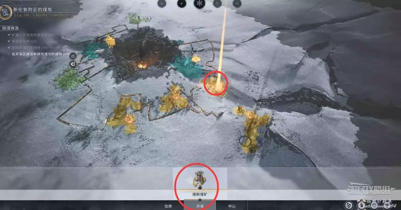 按左ALT查看城市周邊,找到淺煤層,破霜過去,建造開採區挖煤。