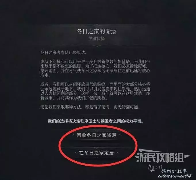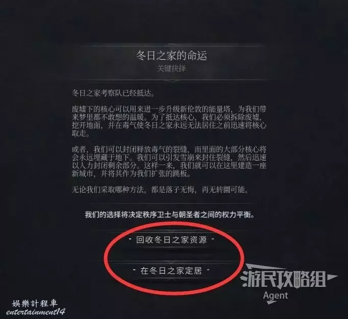 在冬日之家定居:堵住釋放毒氣的裂縫,而裡面的大部分核心將會永遠理藏於地下。然後就能在這裡建造一座新城市,並將其作為我們擴張的跳板。朝聖者將支持這個決定,秩序衛士將反對這個決定。