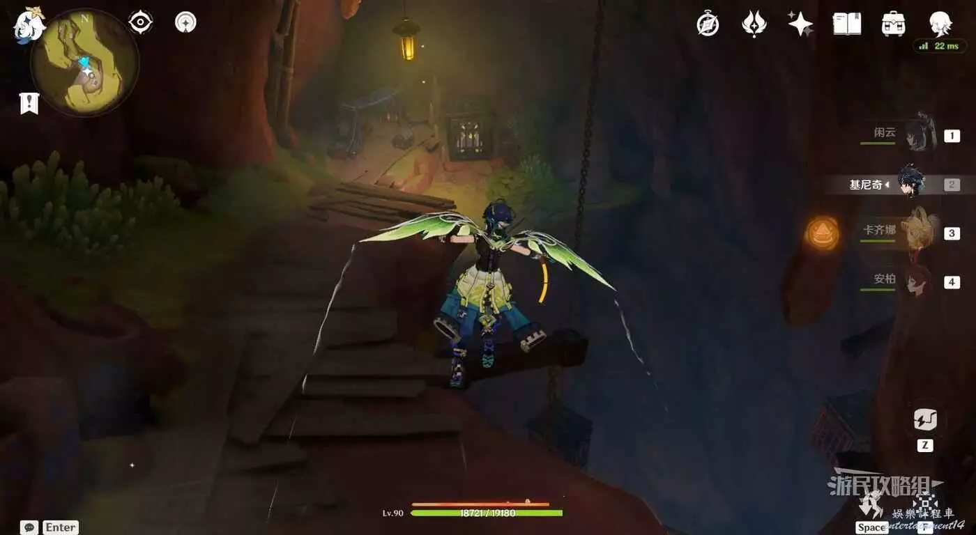 站在懸崖邊往底部看,可以看到一個水胖守著一個普通寶箱。右側空中還有一個火神瞳,如果拾取的話記得做好標記以免後續遺漏。