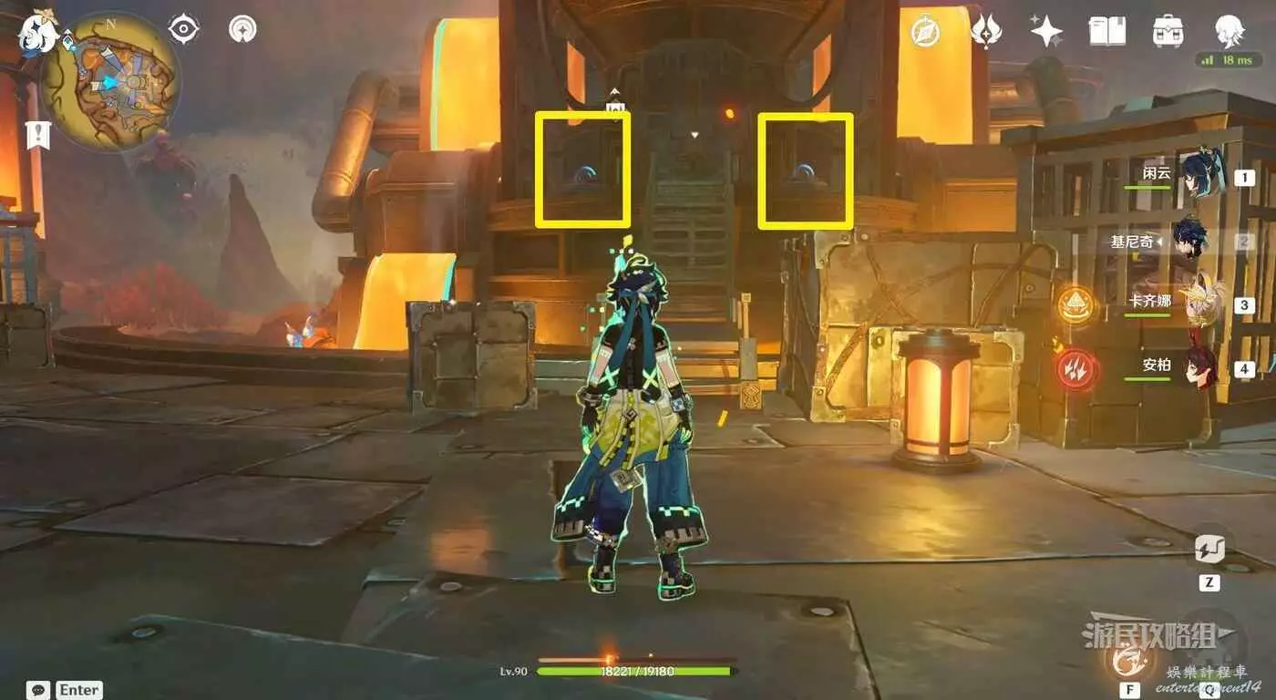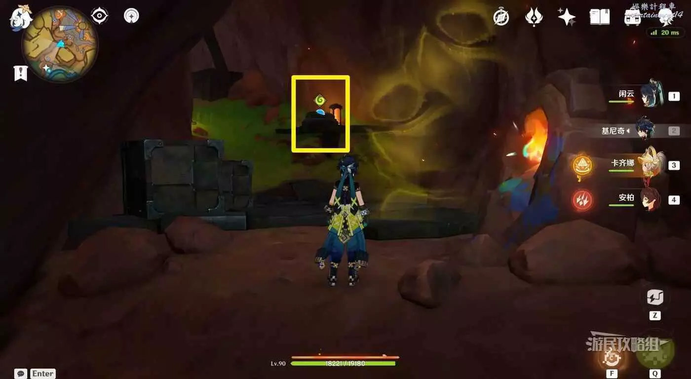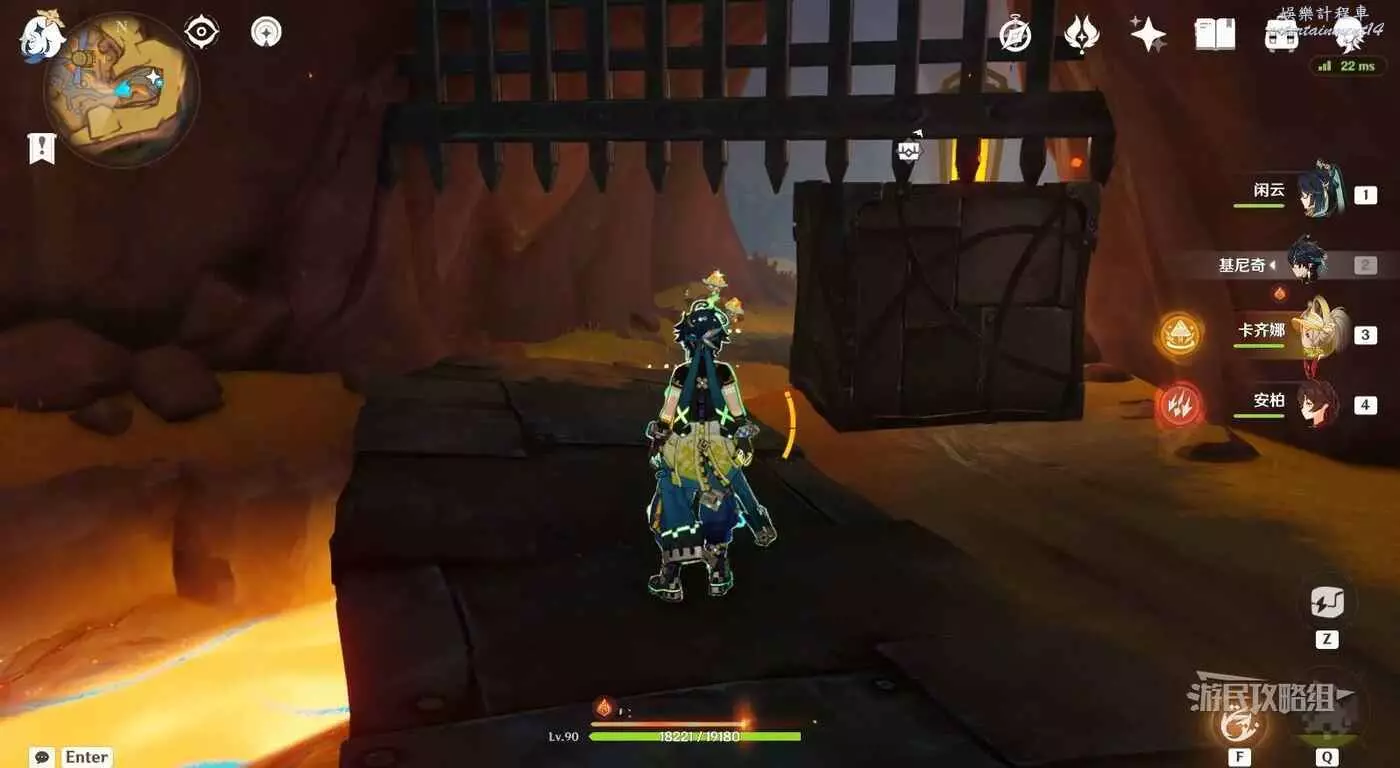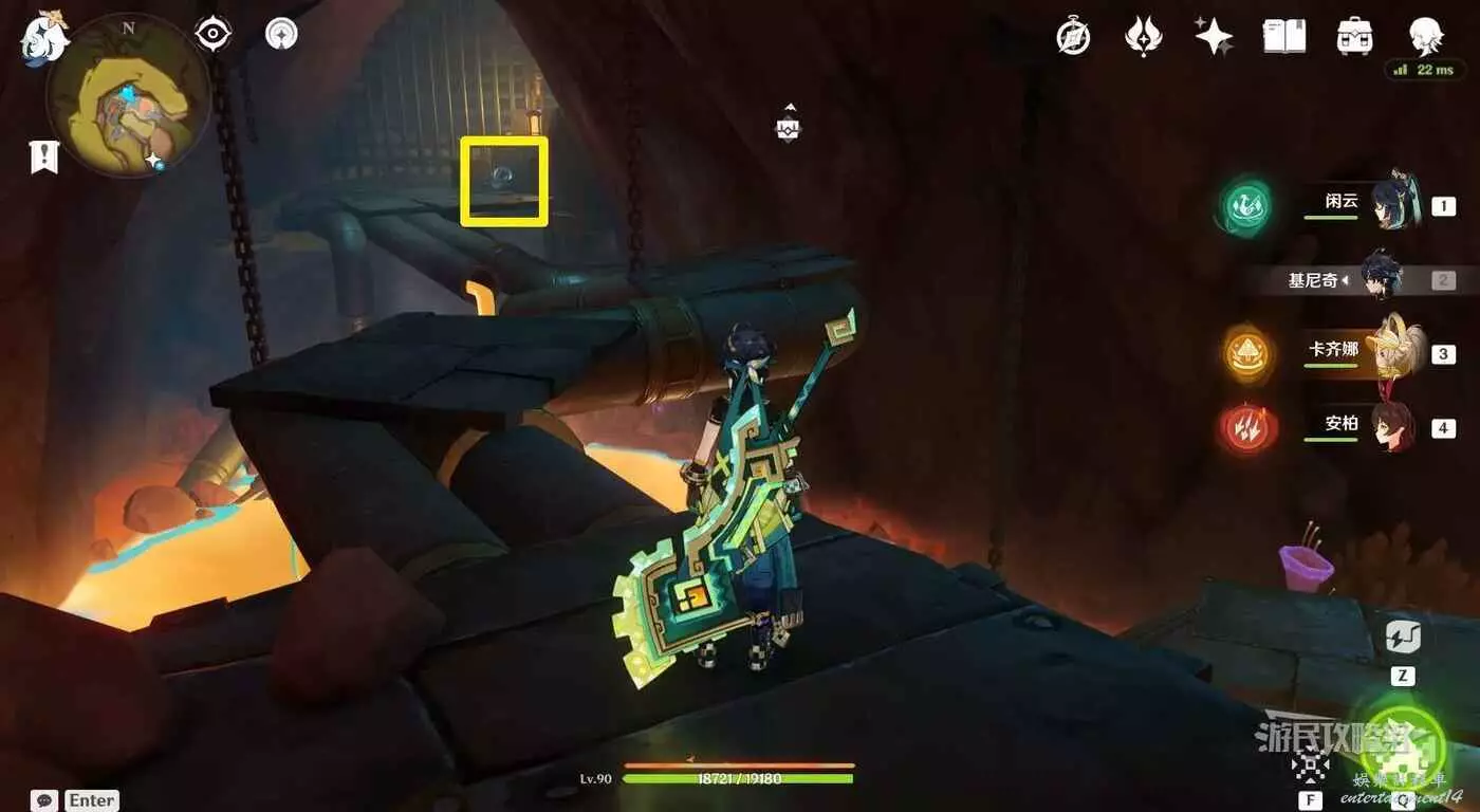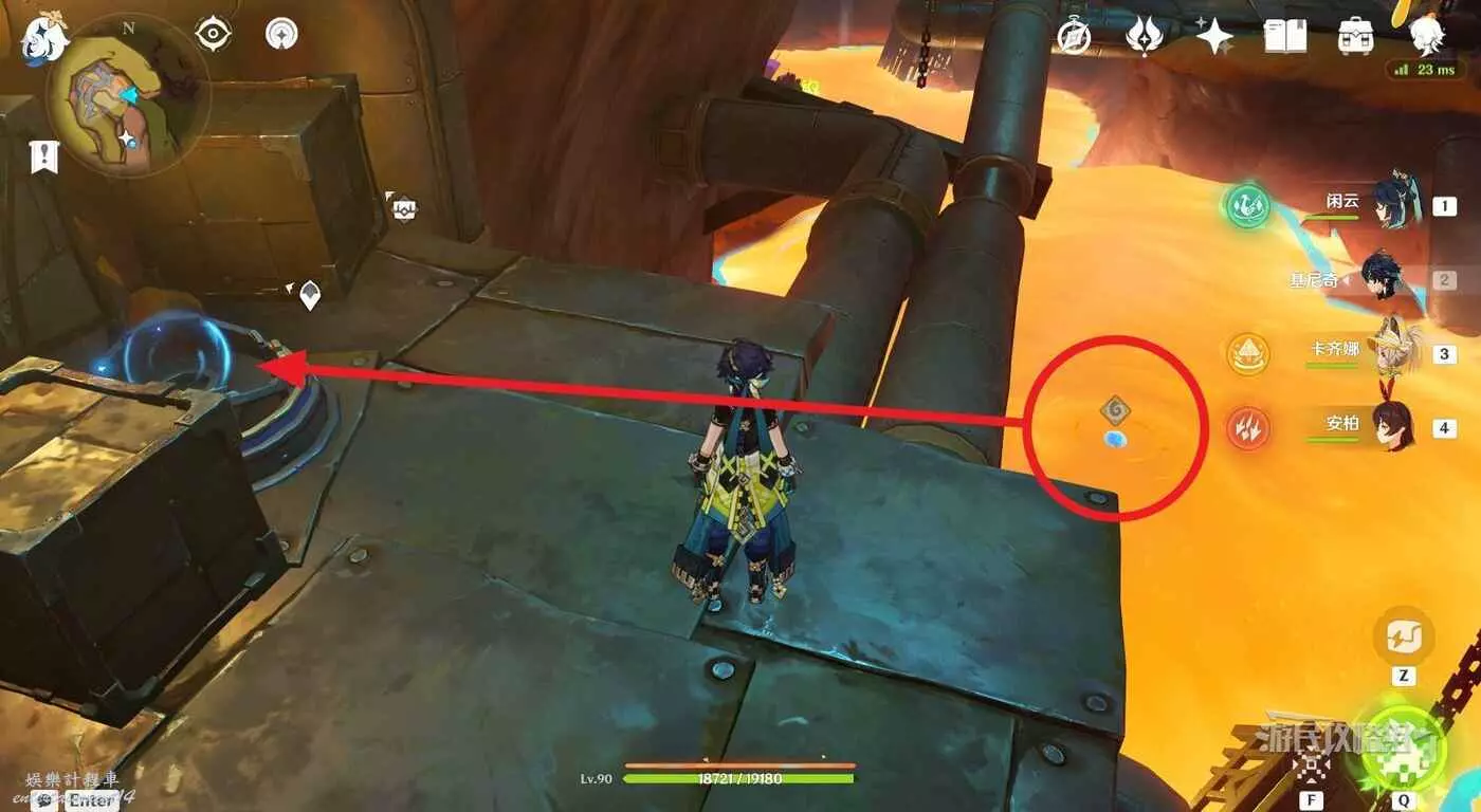 站在機關旁邊,轉身往岩漿中間看,可以看到漂浮著一個藍色的球,使用基尼奇或匿葉龍的能力拾取岩漿中的球,放到機關中,開啟鐵門。