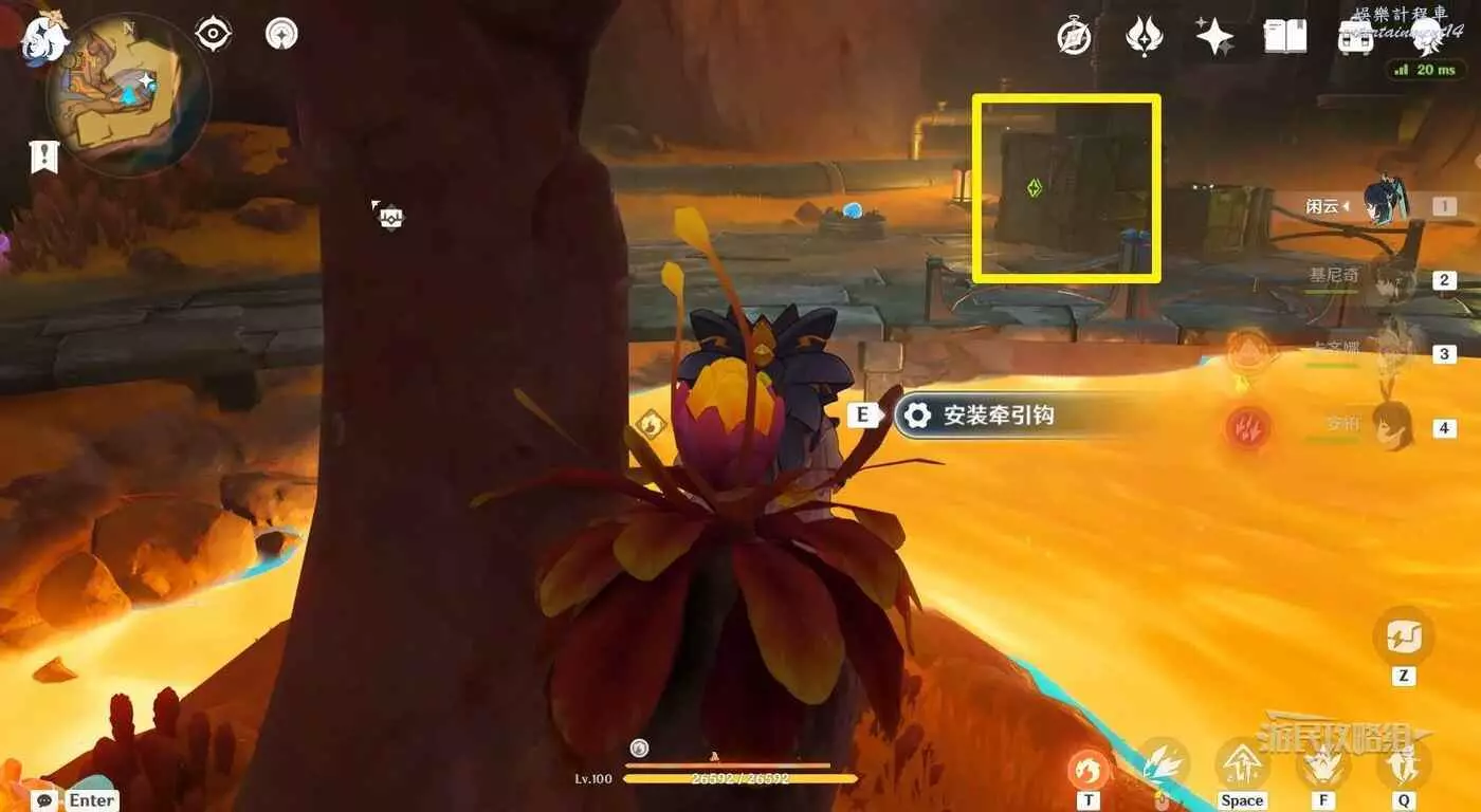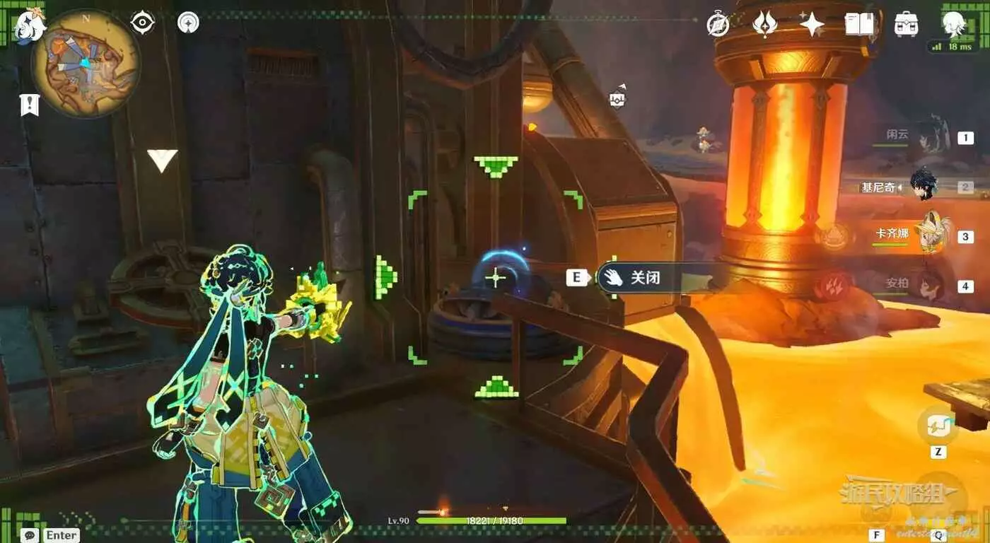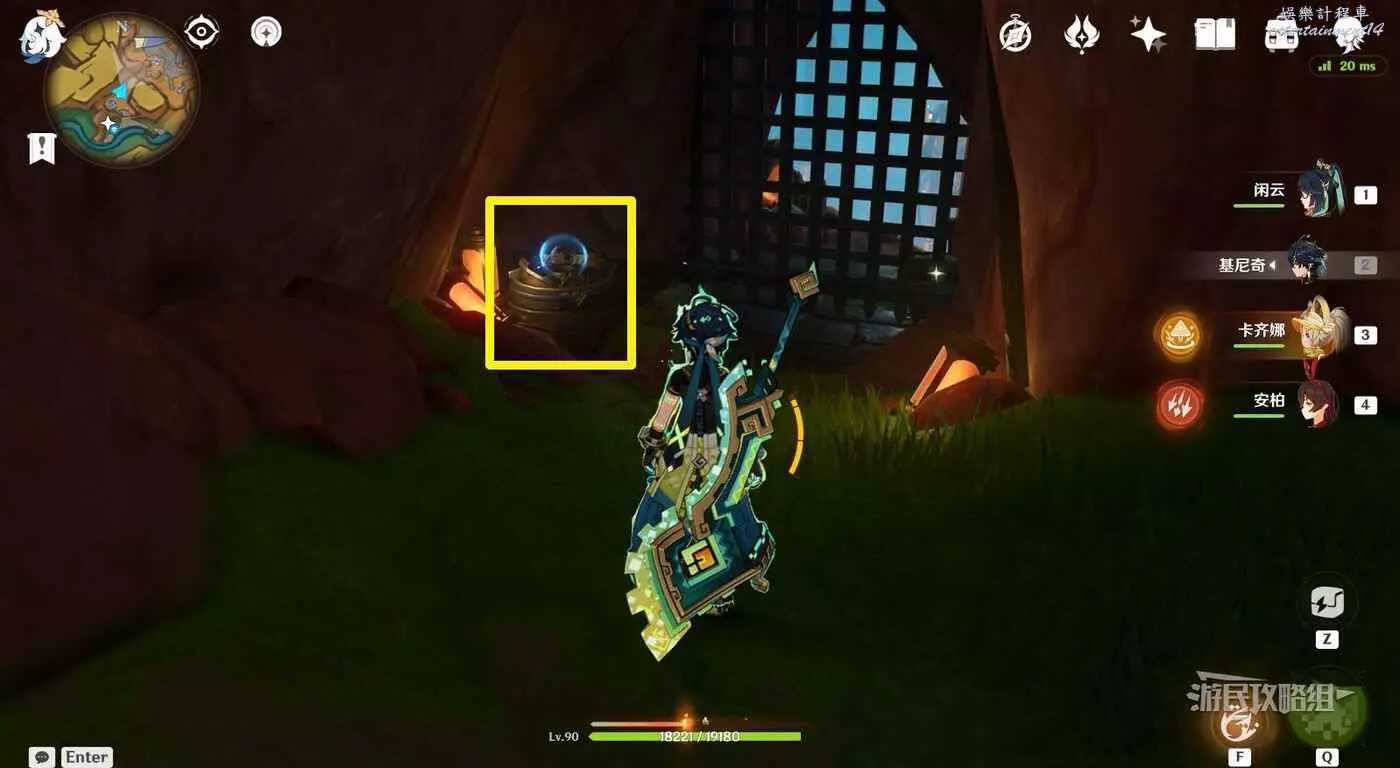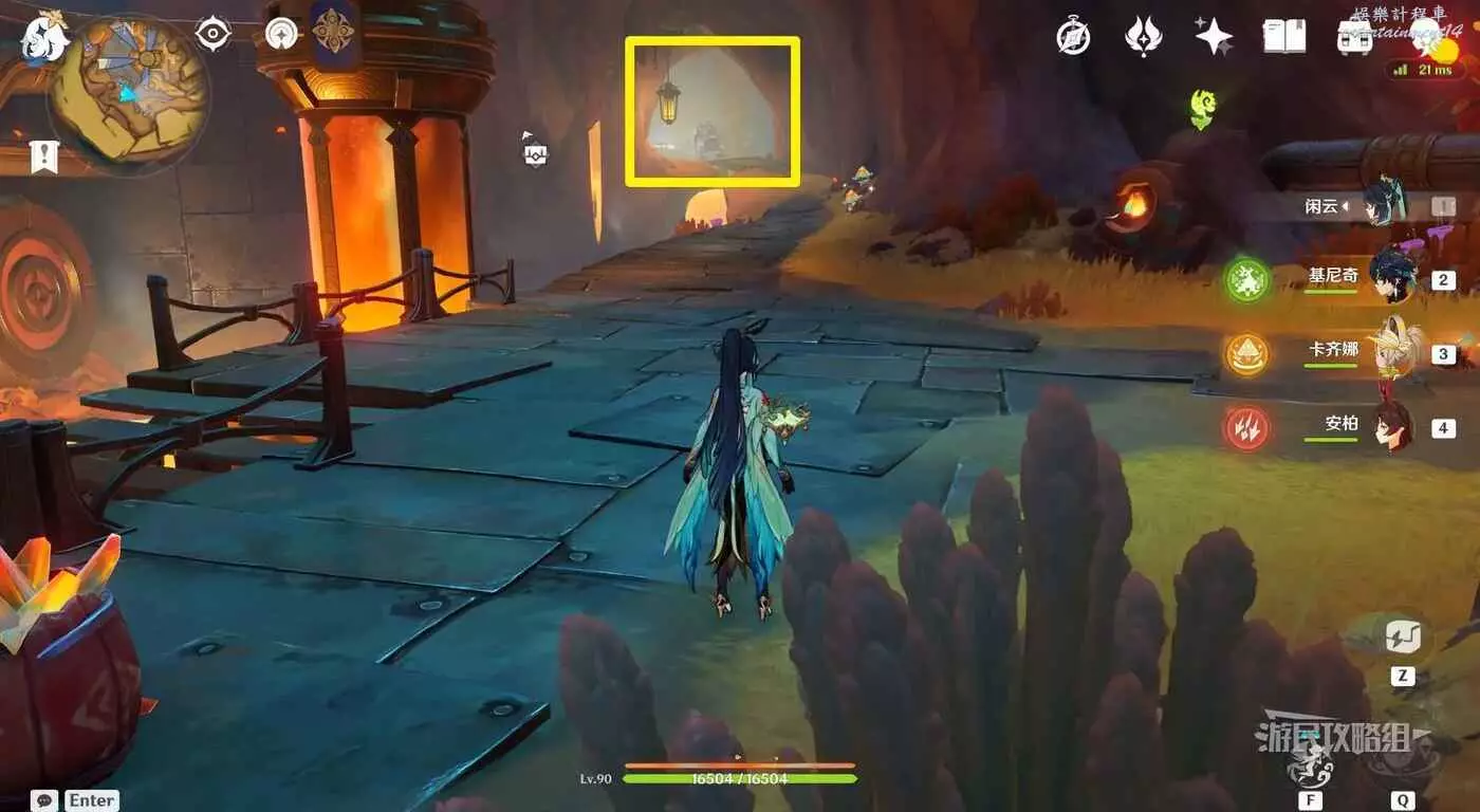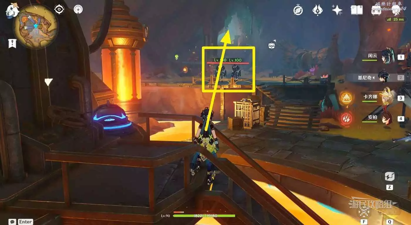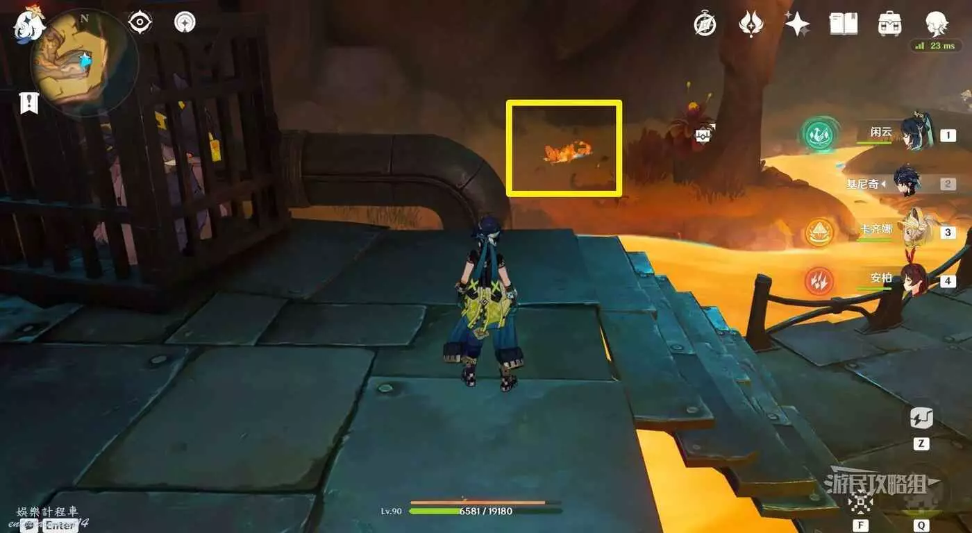 站在機關旁邊,轉身往岩漿中間看,可以看到漂浮著一個藍色的球,使用基尼奇或匿葉龍的能力拾取岩漿中的球,放到機關中,開啟鐵門。