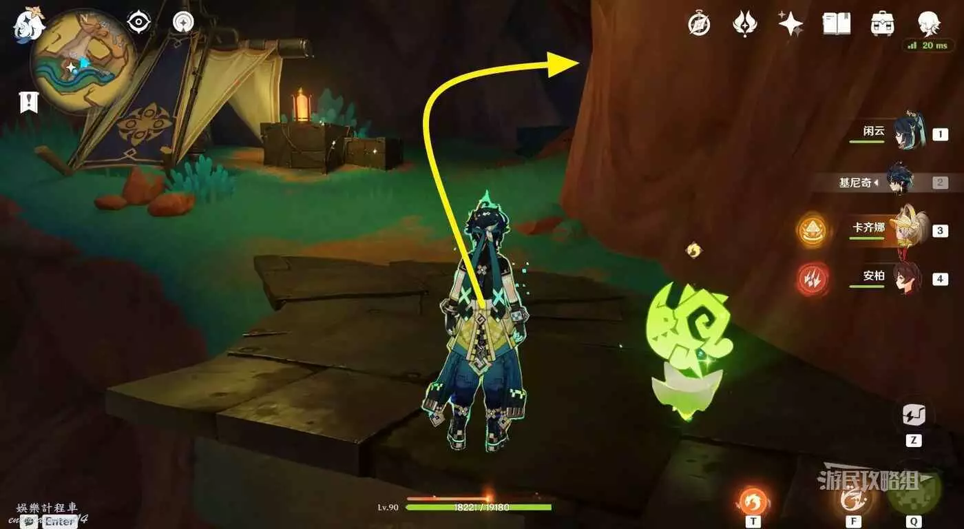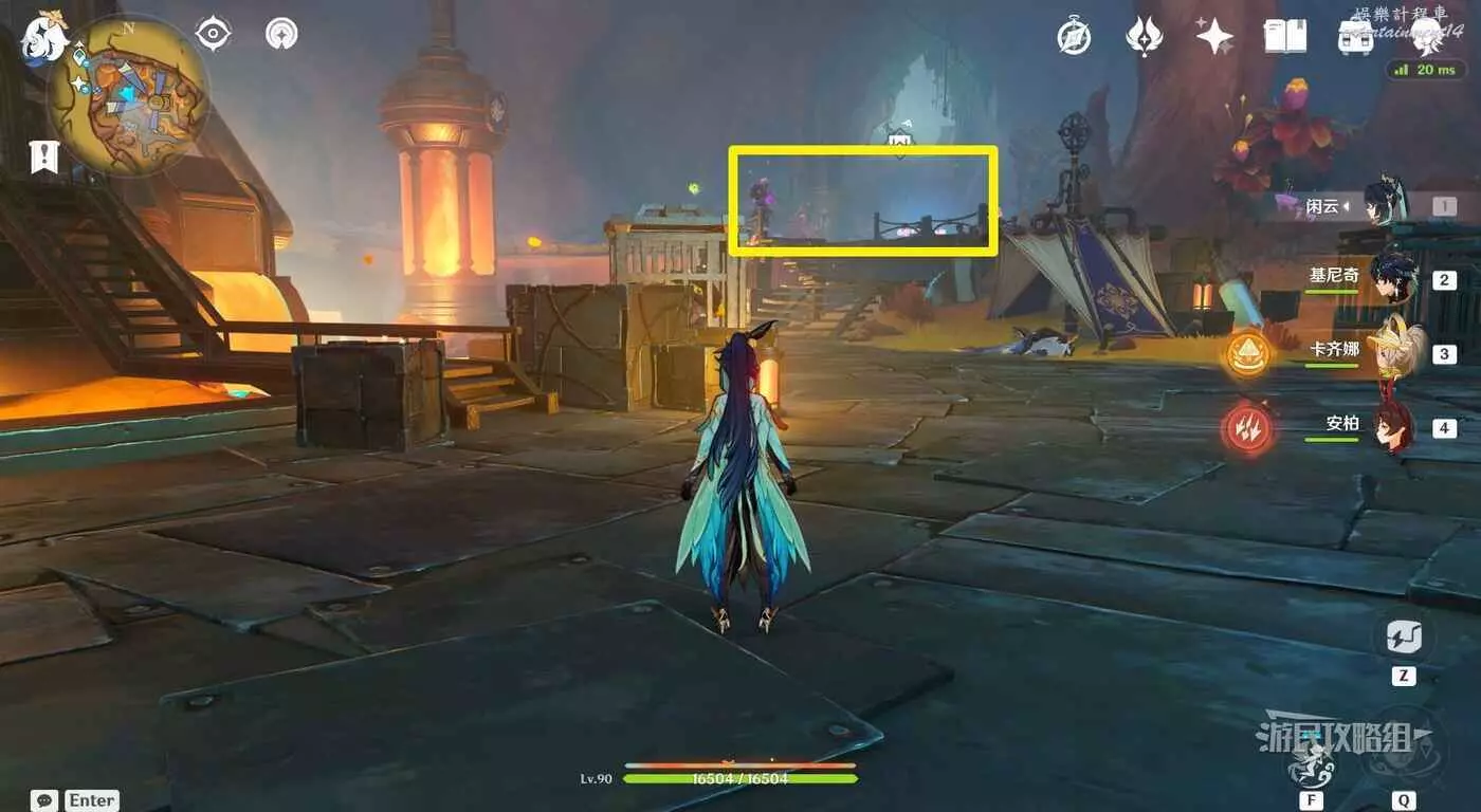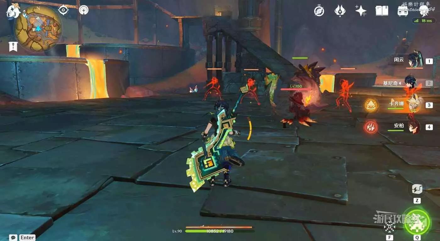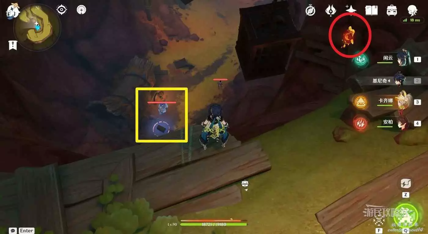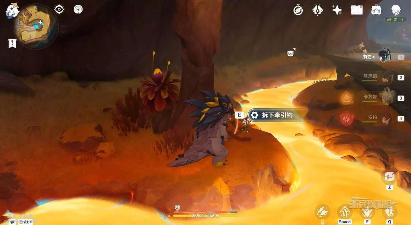 站在機關旁邊,轉身往岩漿中間看,可以看到漂浮著一個藍色的球,使用基尼奇或匿葉龍的能力拾取岩漿中的球,放到機關中,開啟鐵門。