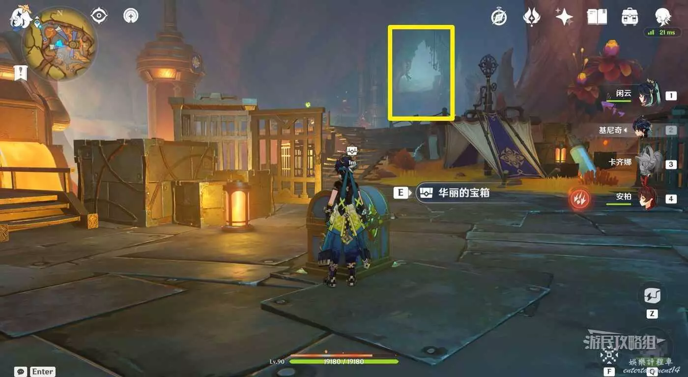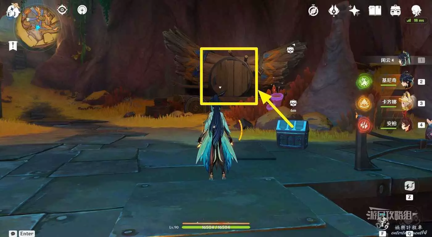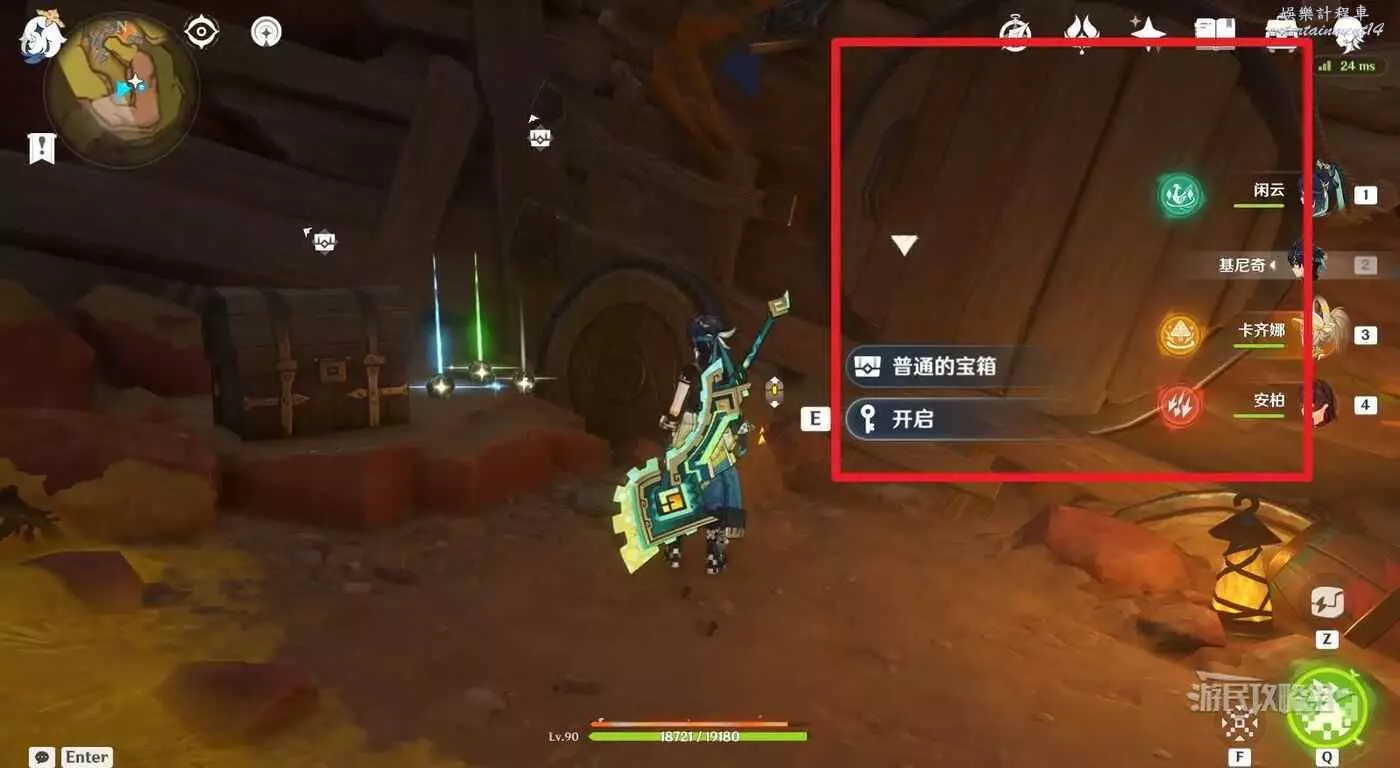 擊敗愚人眾,開啟普通的寶箱獲得【豁口在前的鑰匙】,用鑰匙開啟旁邊圓形的木板門。
