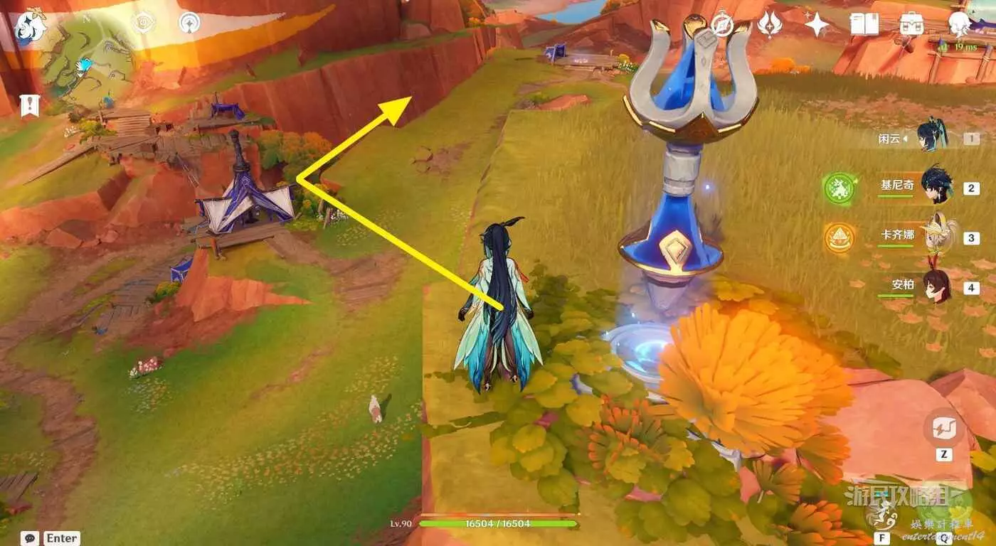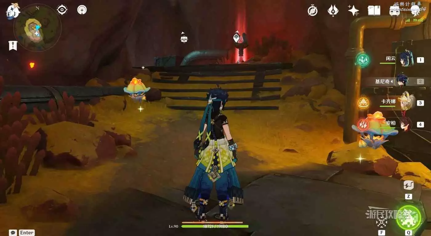 觸發劇情後,前方會出現變身匿葉龍的標記,前方需要使用基尼奇或匿葉龍來進行探索。沿著巨大的管子一直走到盡頭(途中需要爬一個梯子),會觸發派蒙的提示,前方有一個鐵柵欄門,門前有個機關。
