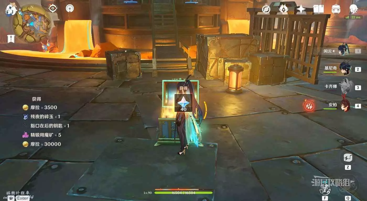 擊敗愚人眾後,獲得華麗的寶箱,開啟寶箱獲得【豁口在後的鑰匙】和【殘夜的碎玉】。