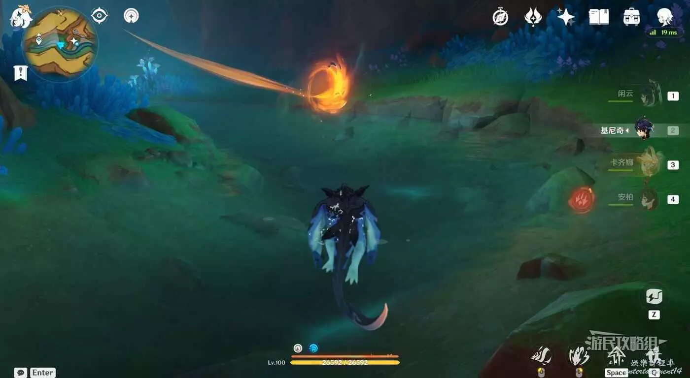 救出鰭游龍後,水邊會出現變身鰭游龍的標識,變身鰭游龍沿著水面上的遊隙靈道往外走,途中可以拾取到一個火神瞳。