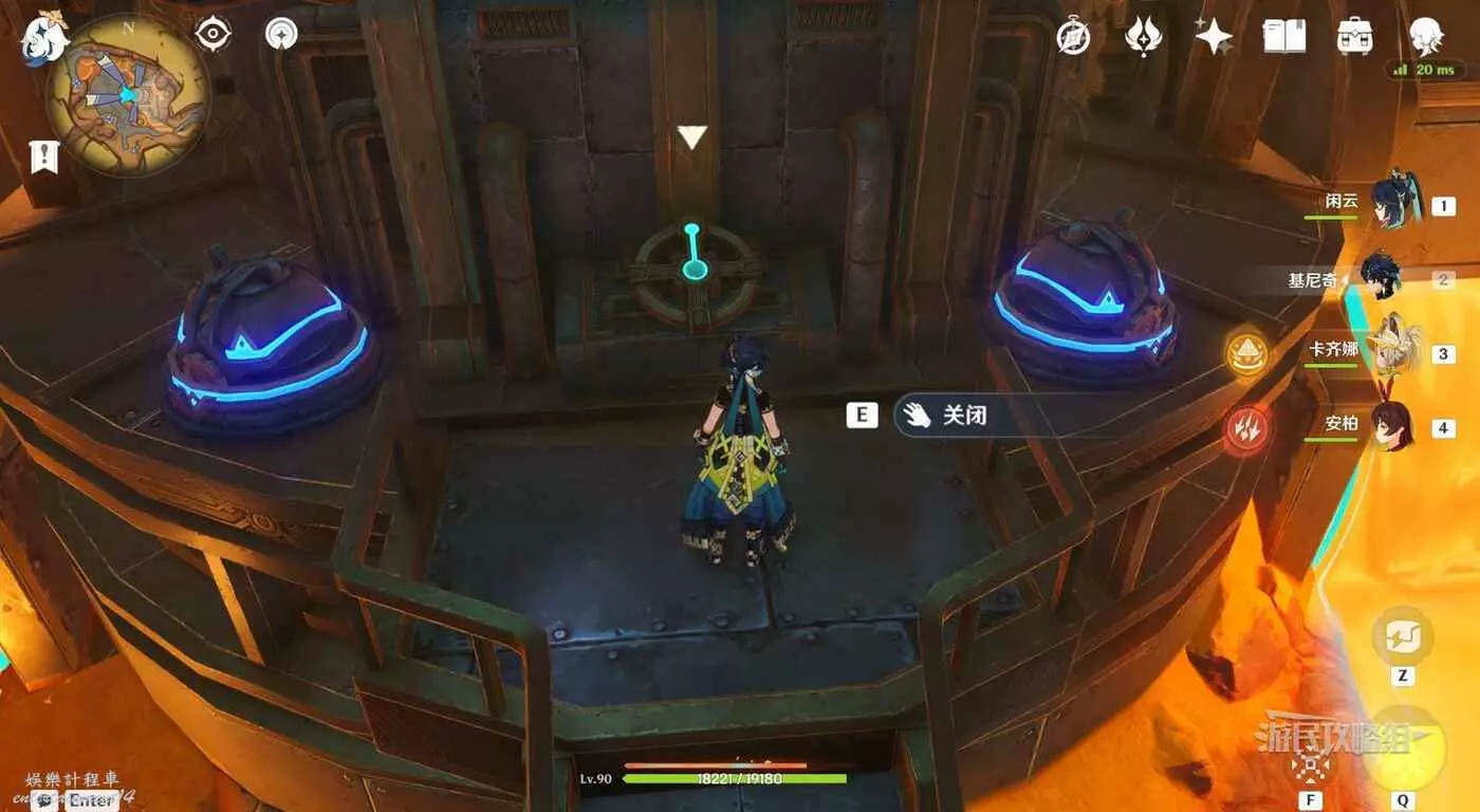 與中間的圓盤互動,關閉2次,會開始倒計時,在倒計時內保持存活。注意關閉之後會觸發與許多愚人眾的戰鬥,記得提前調整好戰鬥陣容。