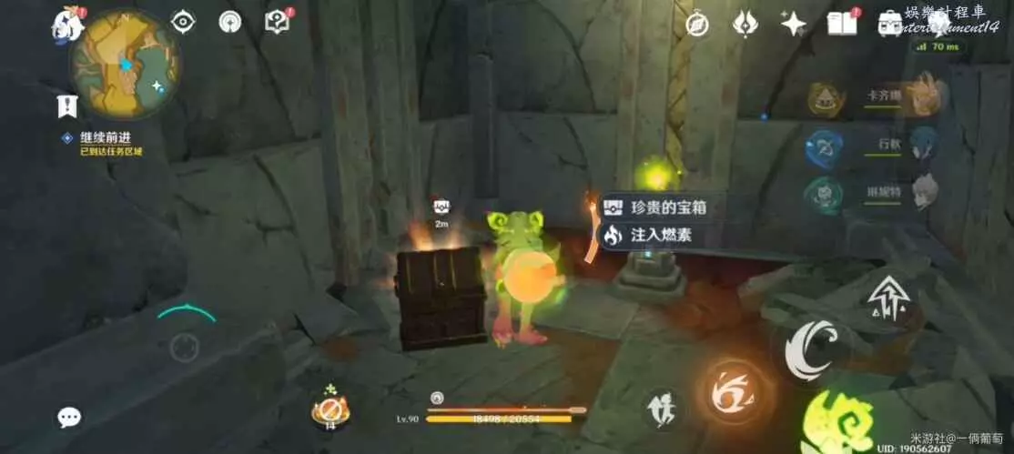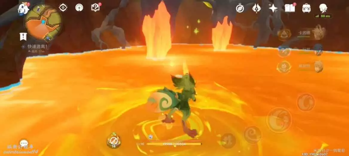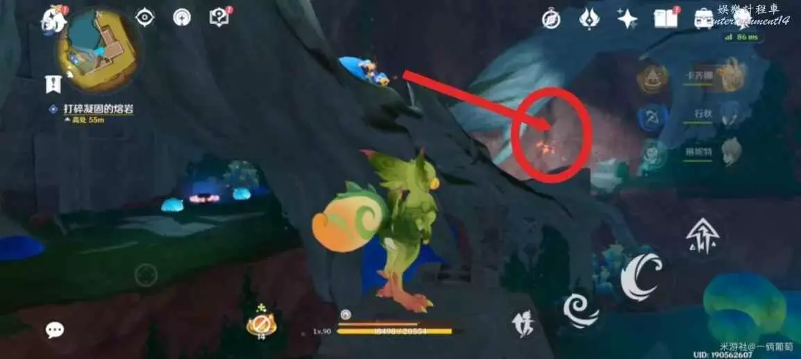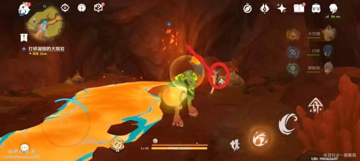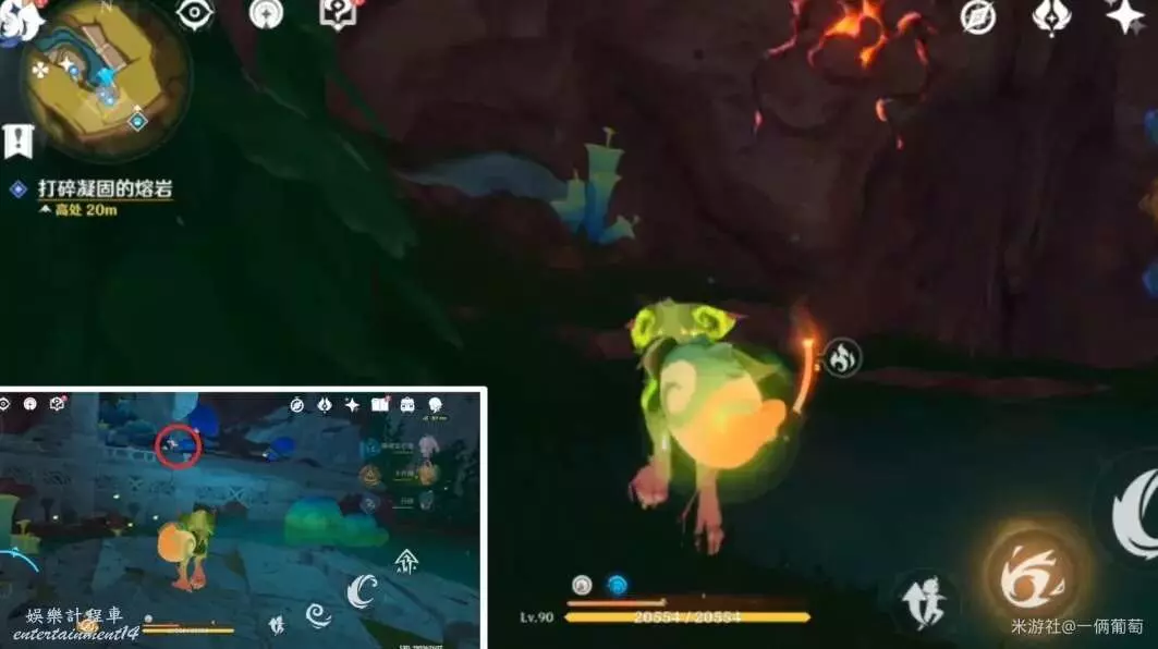 來到地下熔漿層,往最細長(小地圖右上角)深入,找到堵住的大熔岩再次用果實炸。