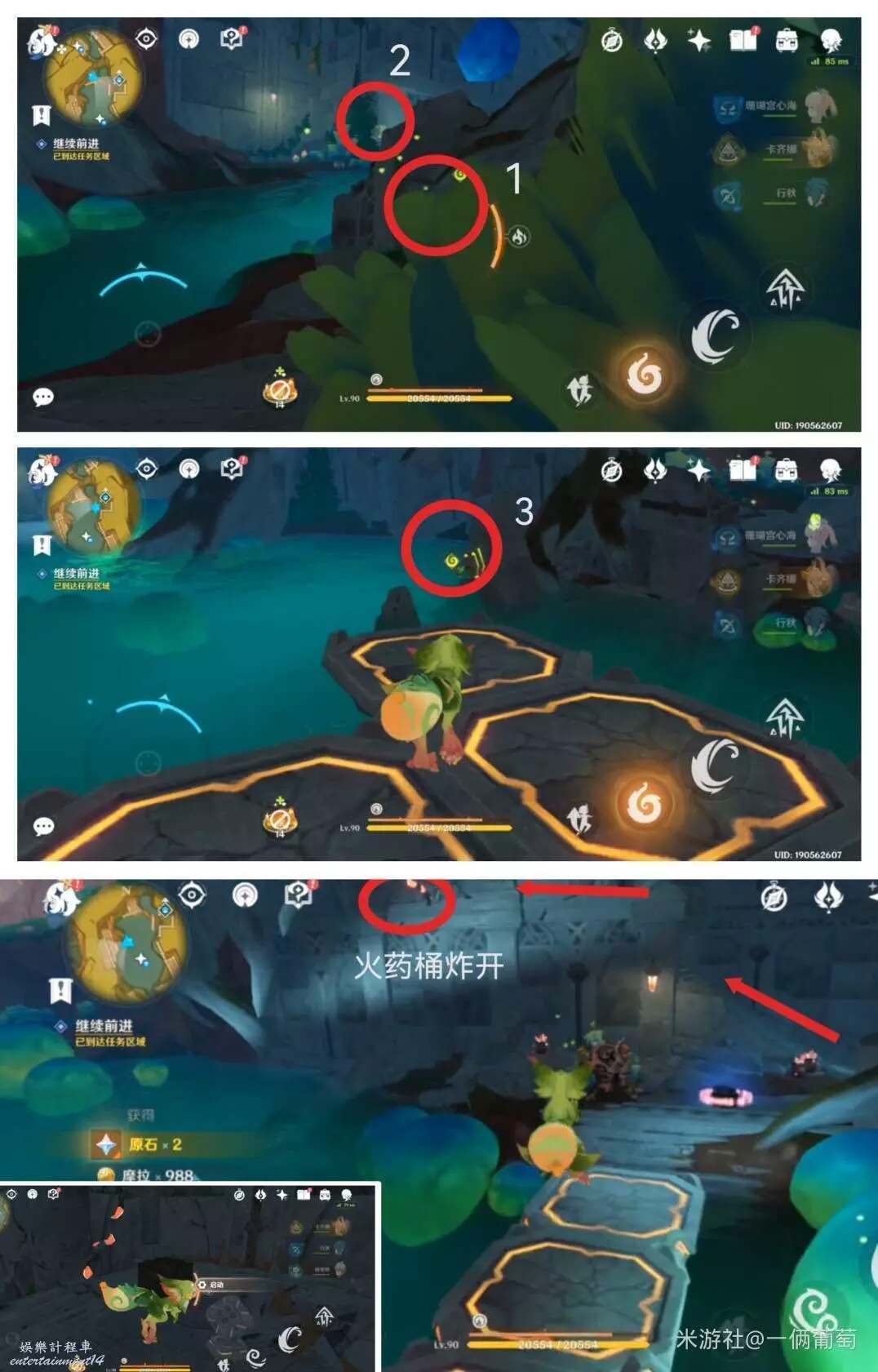 利用出現的鉤索點過去,再次用樹上的果實炸洞口。