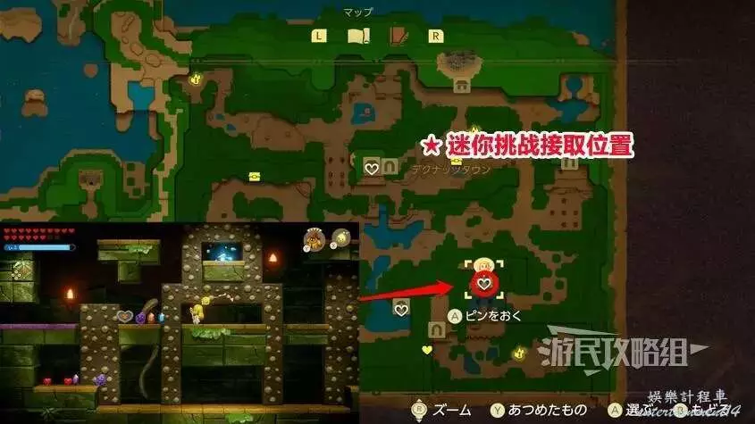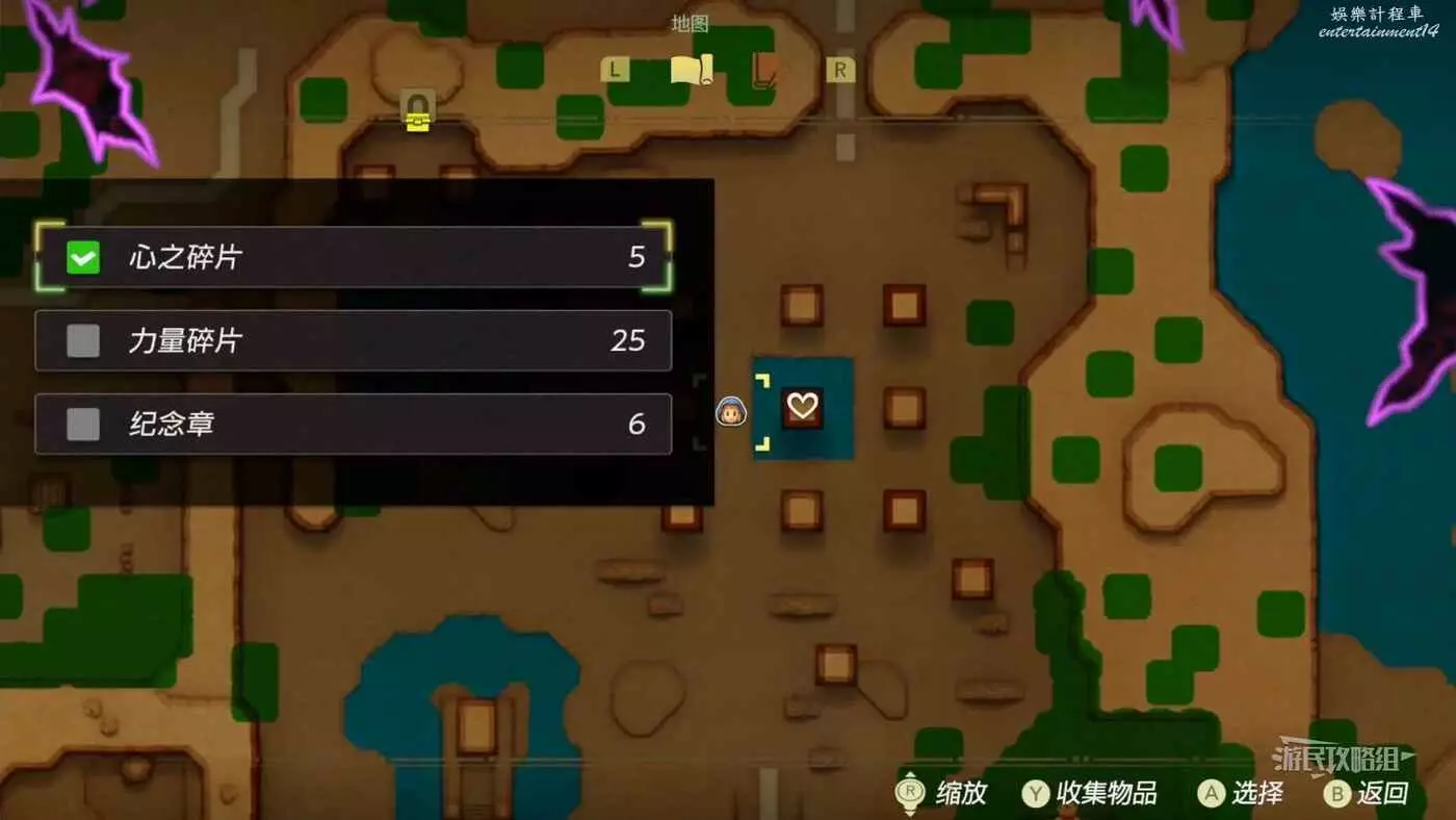 按【-鍵】打開地圖,然後按【Y鍵】勾選心之碎片,可以查看已經拿到的心之碎片的位置。按【+鍵】打開功能表後按【LR鍵】選擇收集時,可以通過左上角的當前合成一顆完整紅心缺少的碎片數量。