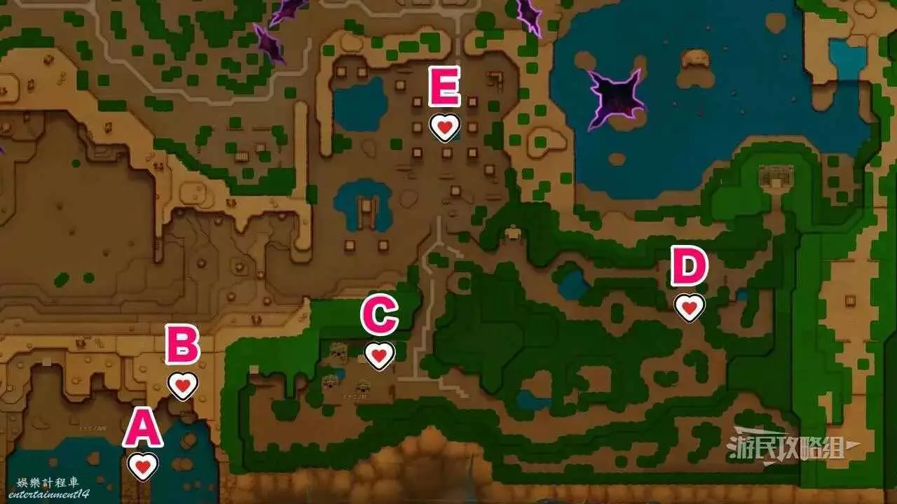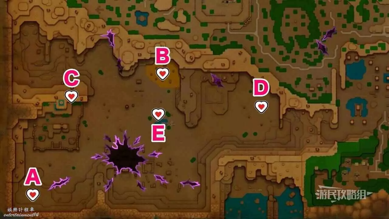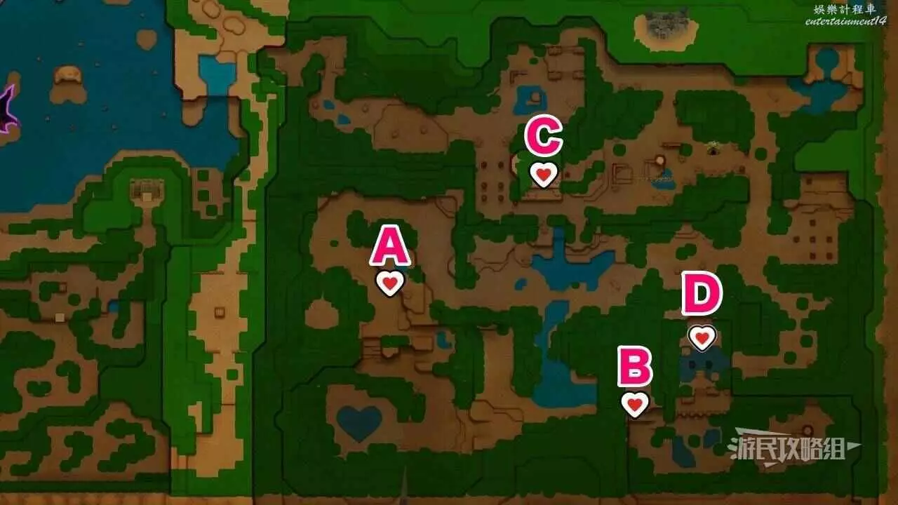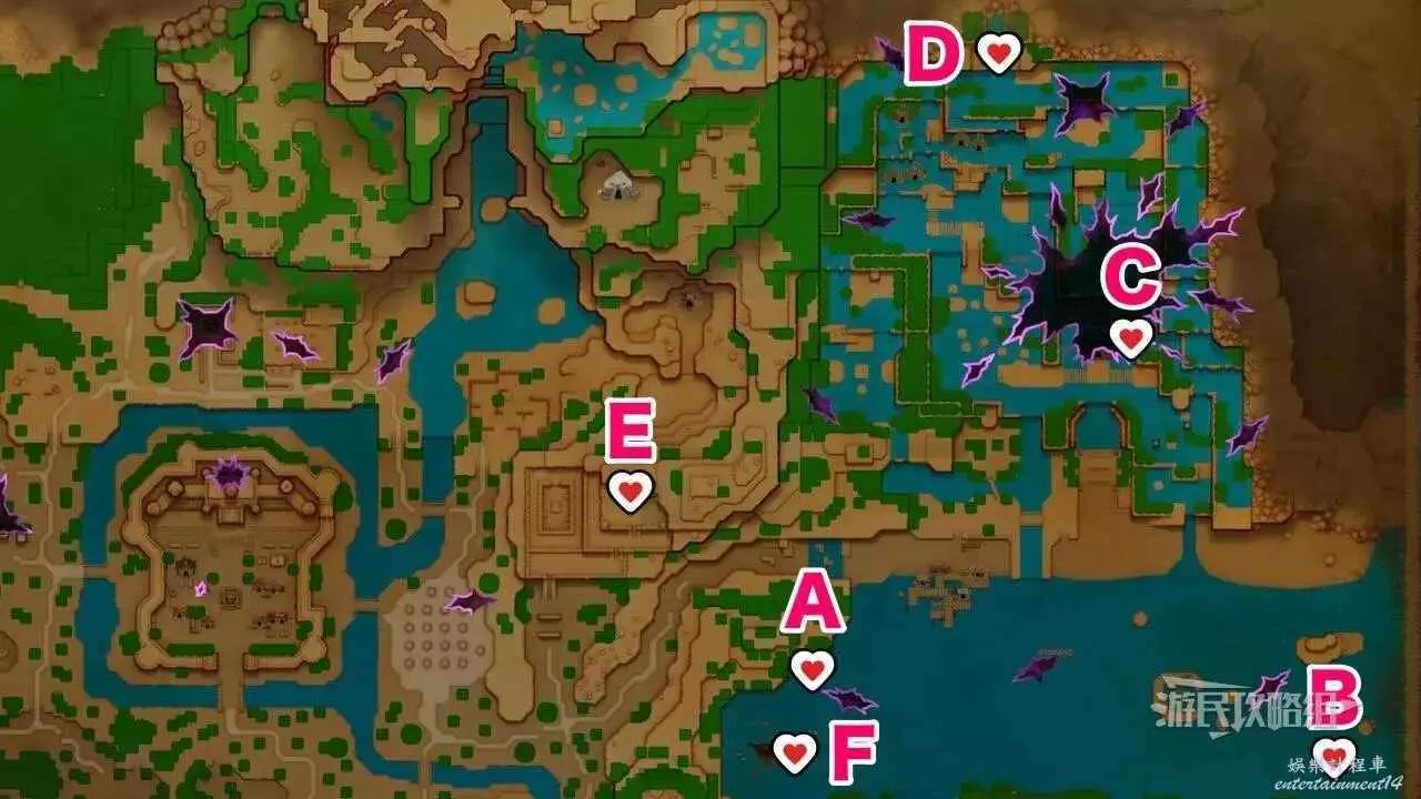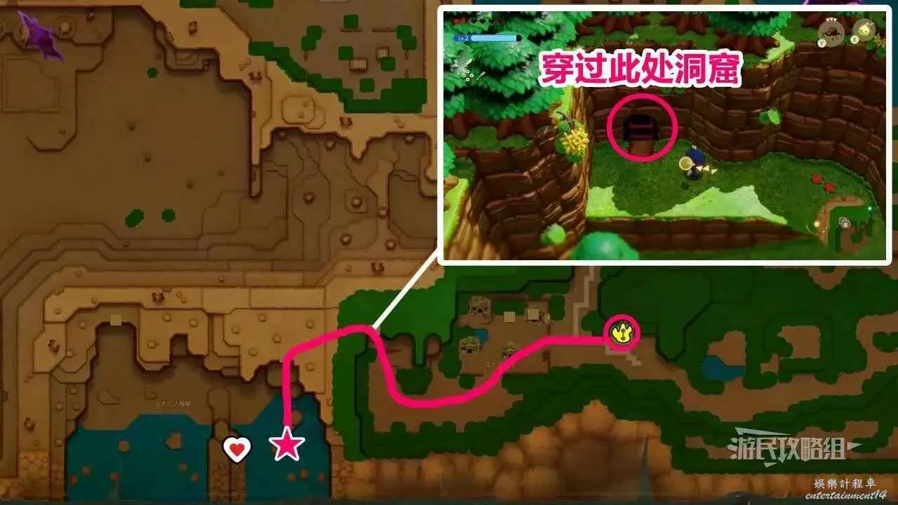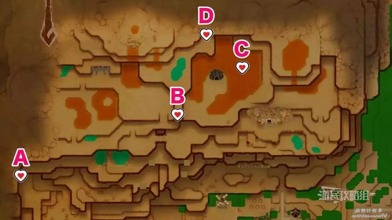 ※上文地圖中的B點標記為洞窟入口位置,遊戲內的心之碎片標記為心之碎片所在的具體位置。