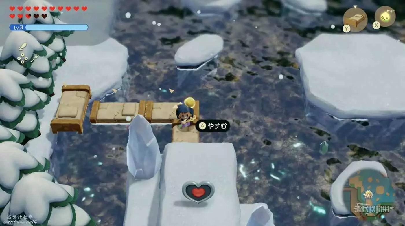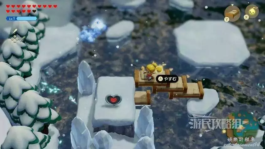 前往海布拉山,沿著西邊狹窄的懸崖小路前進,注意避開途中的雪球。利用老舊的床爬上高台然後往中間跳即可拾取心之碎片。