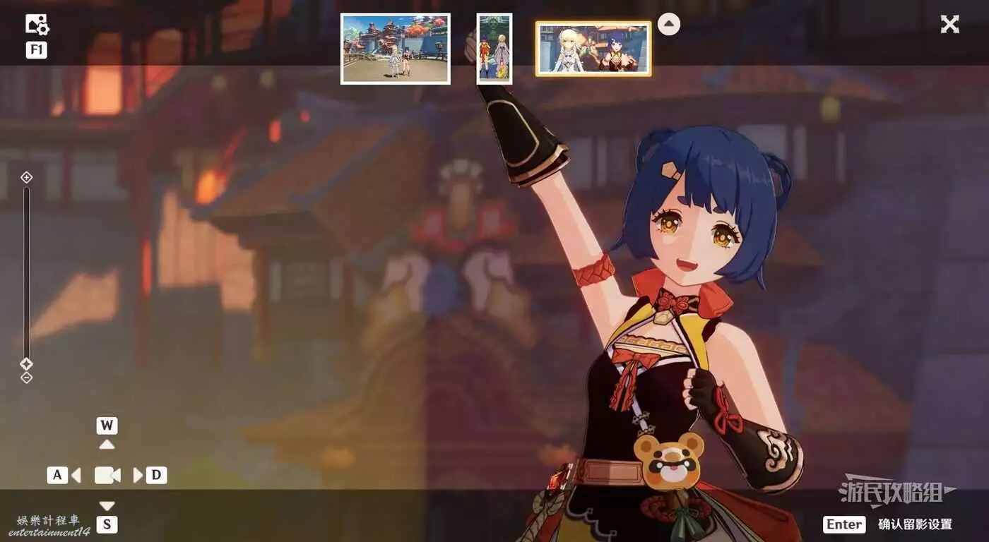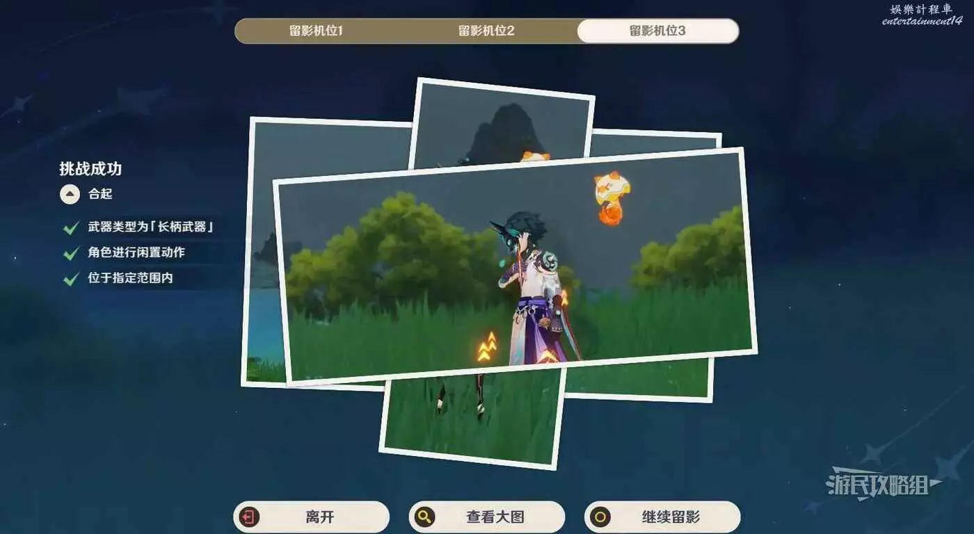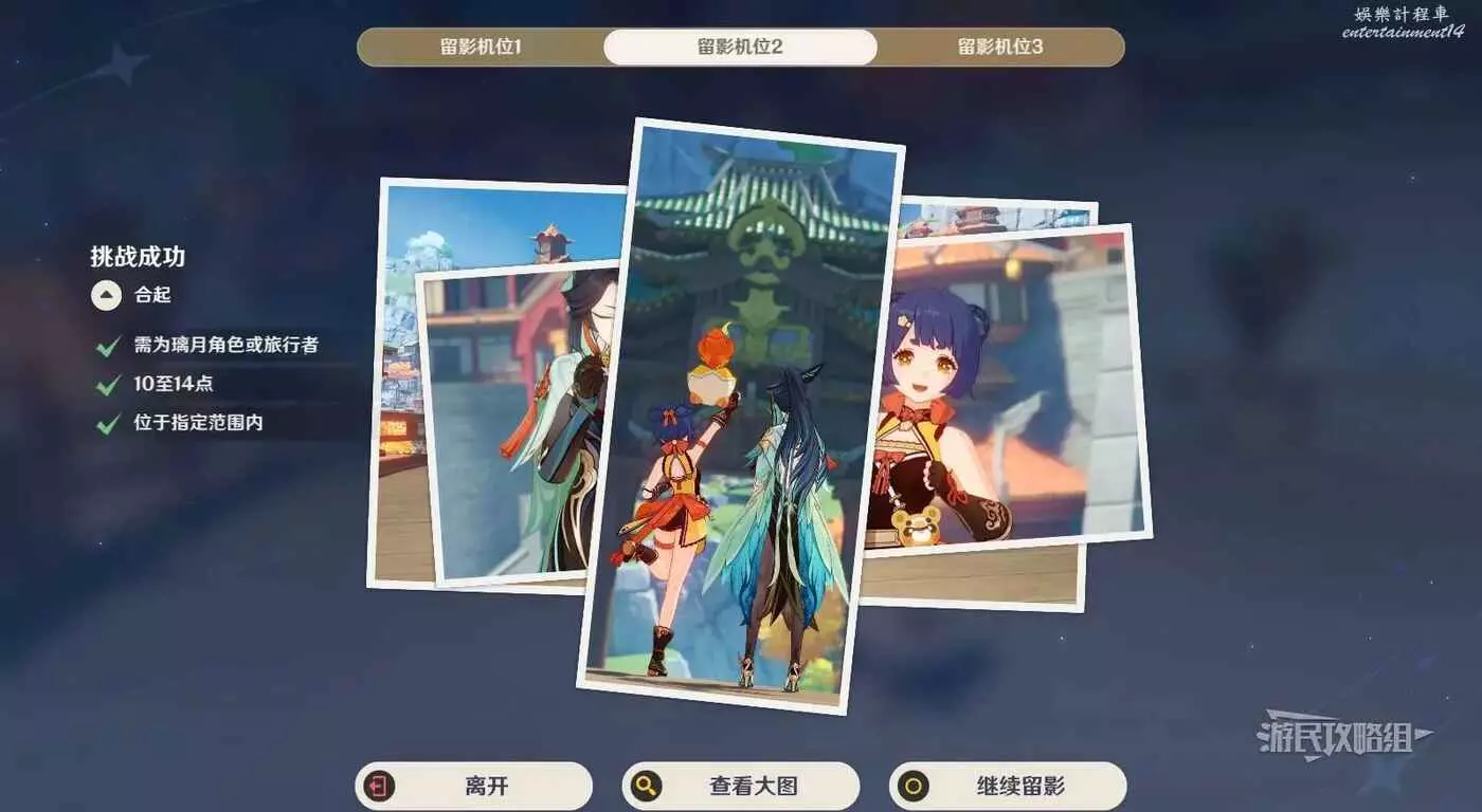 互動開始留影,進入留影設置介面後,點擊上方的三個畫面可以查看各個角度的效果並手動進行調整,調整完畢後確認留影設置。