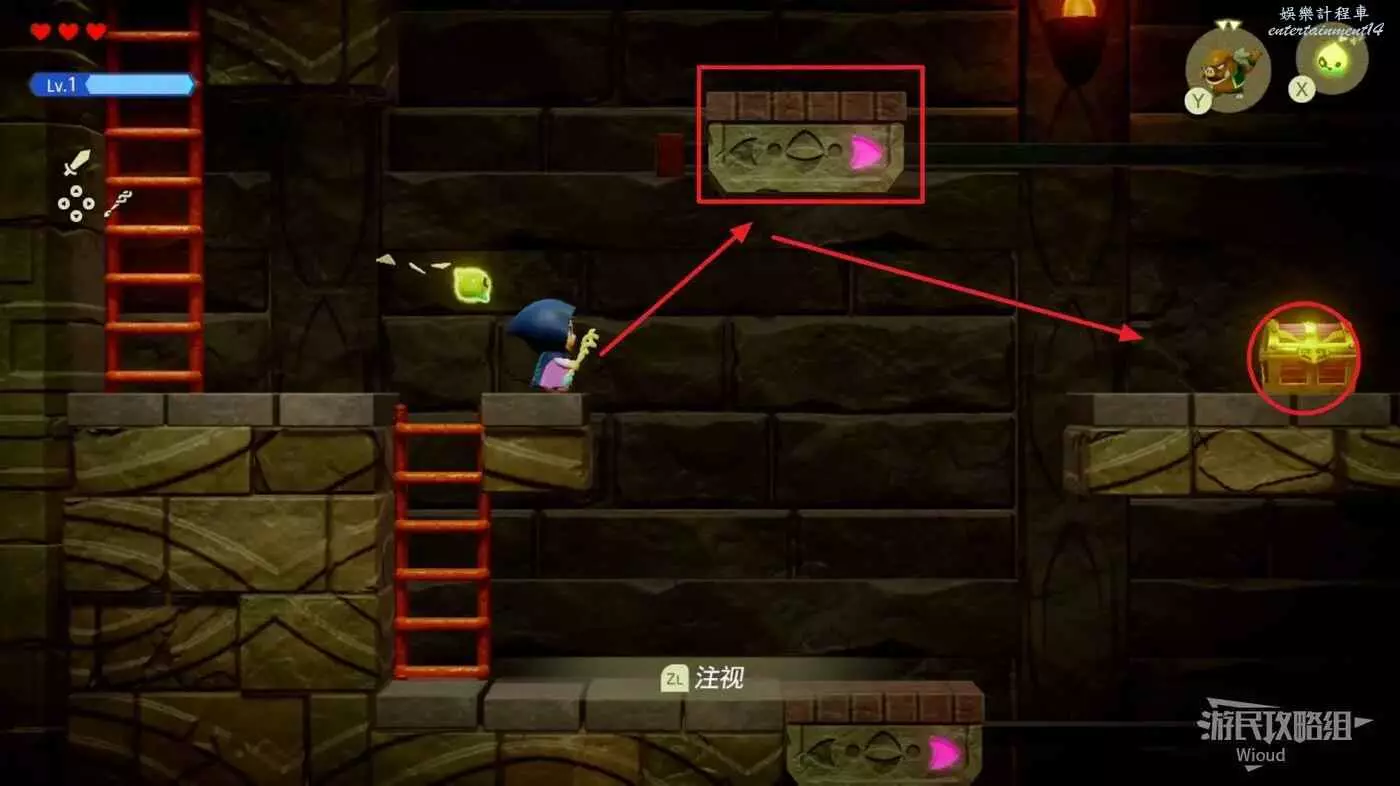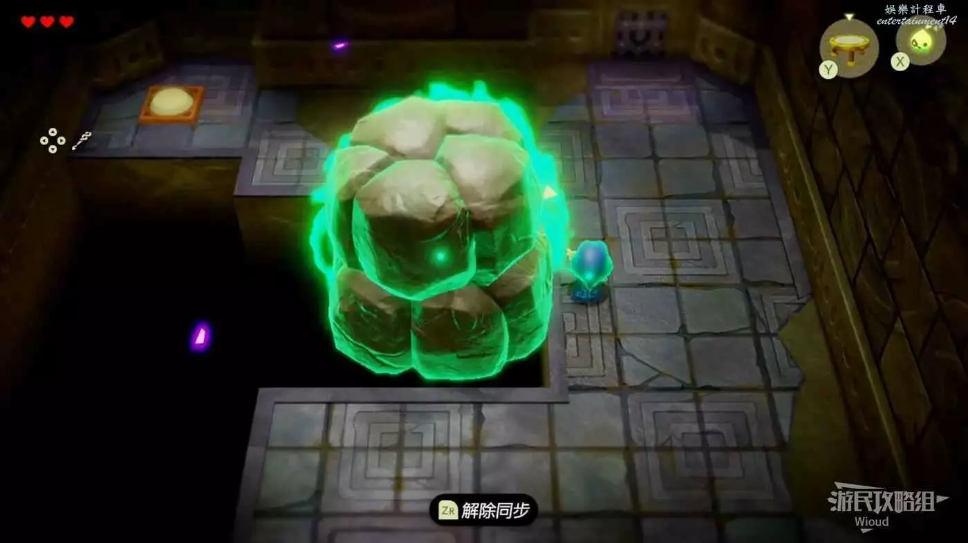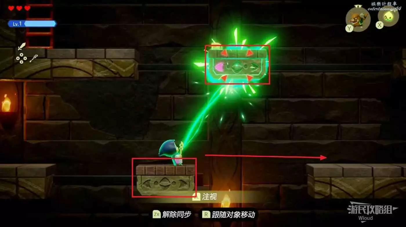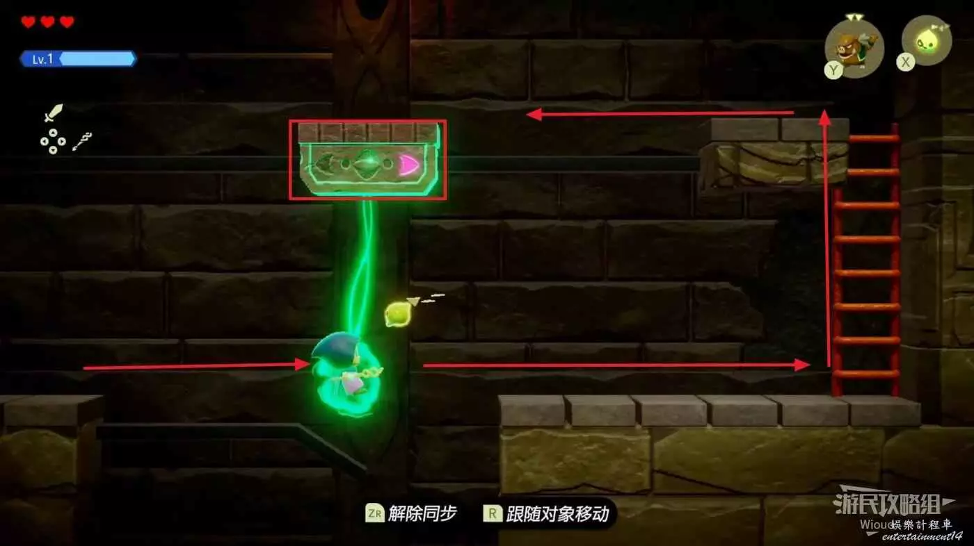 往上推動左搖杆,讓塞爾達看牆,等待上面的板塊移動到正上方直接使用同步對調能力,讓板塊帶我們移動到右側。