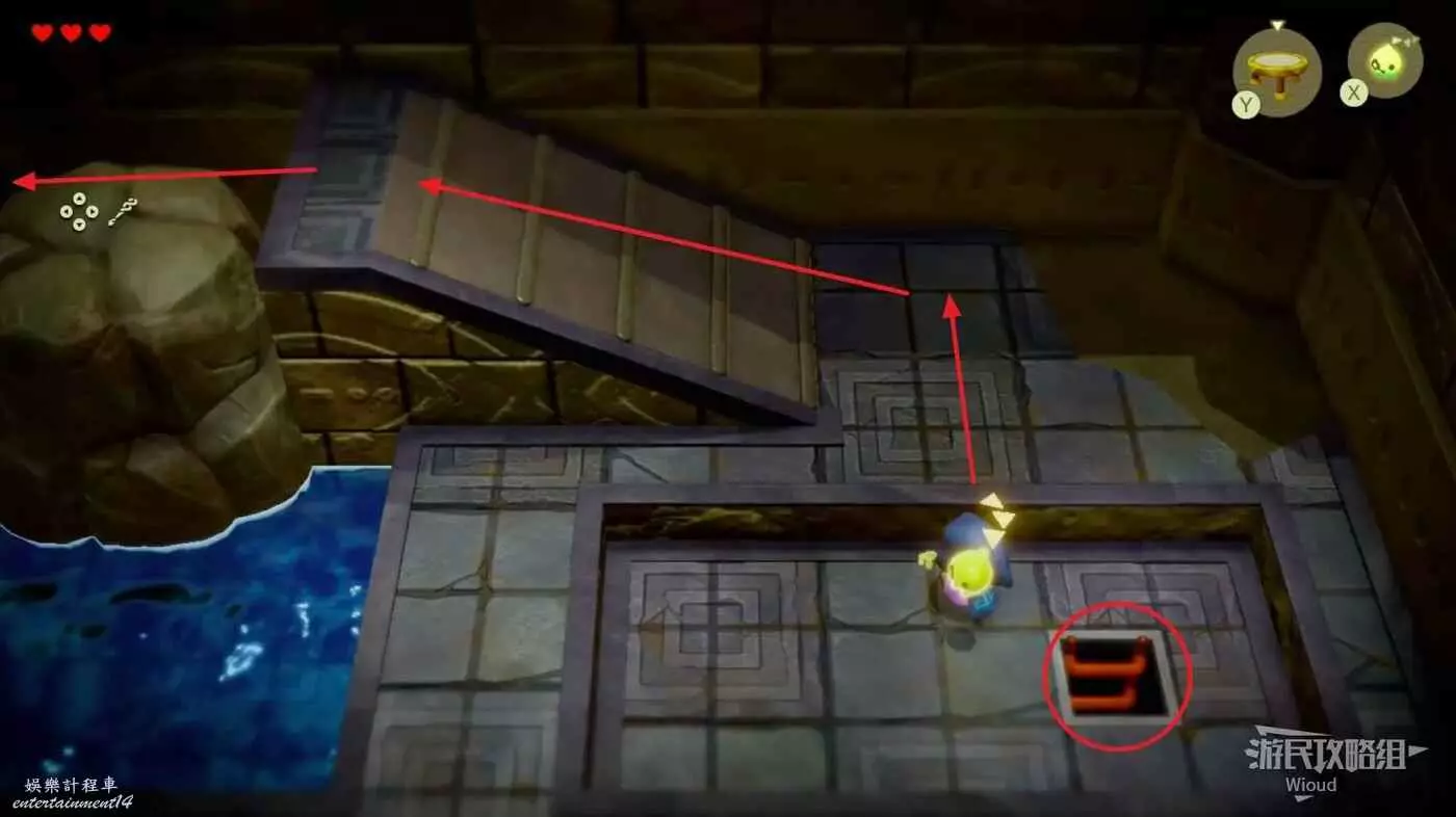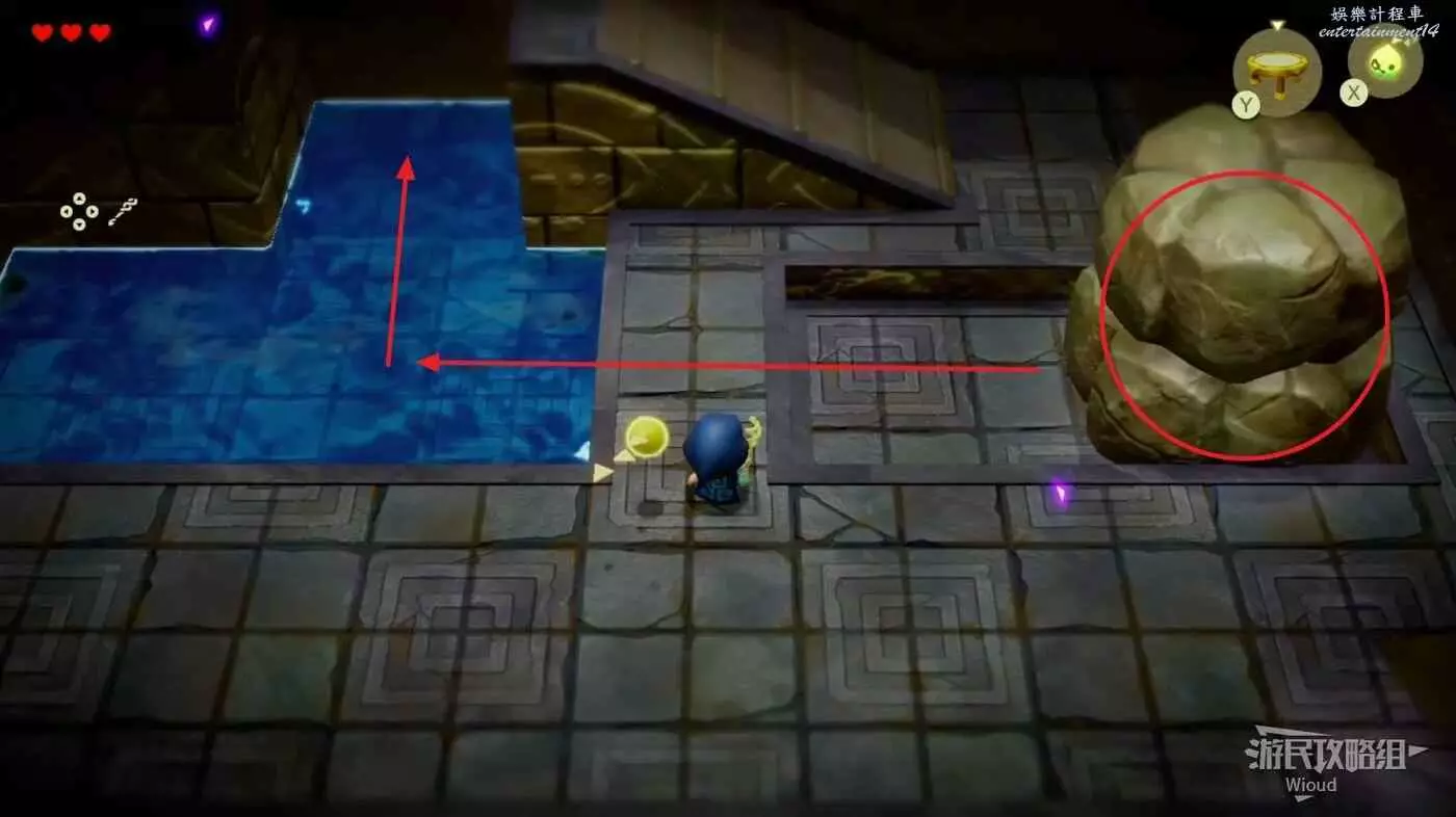 下一個房間與右側的巨石同步,將其移動到上方樓梯中間的缺口位置。