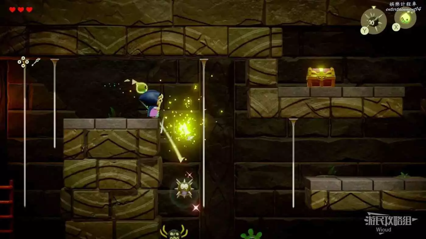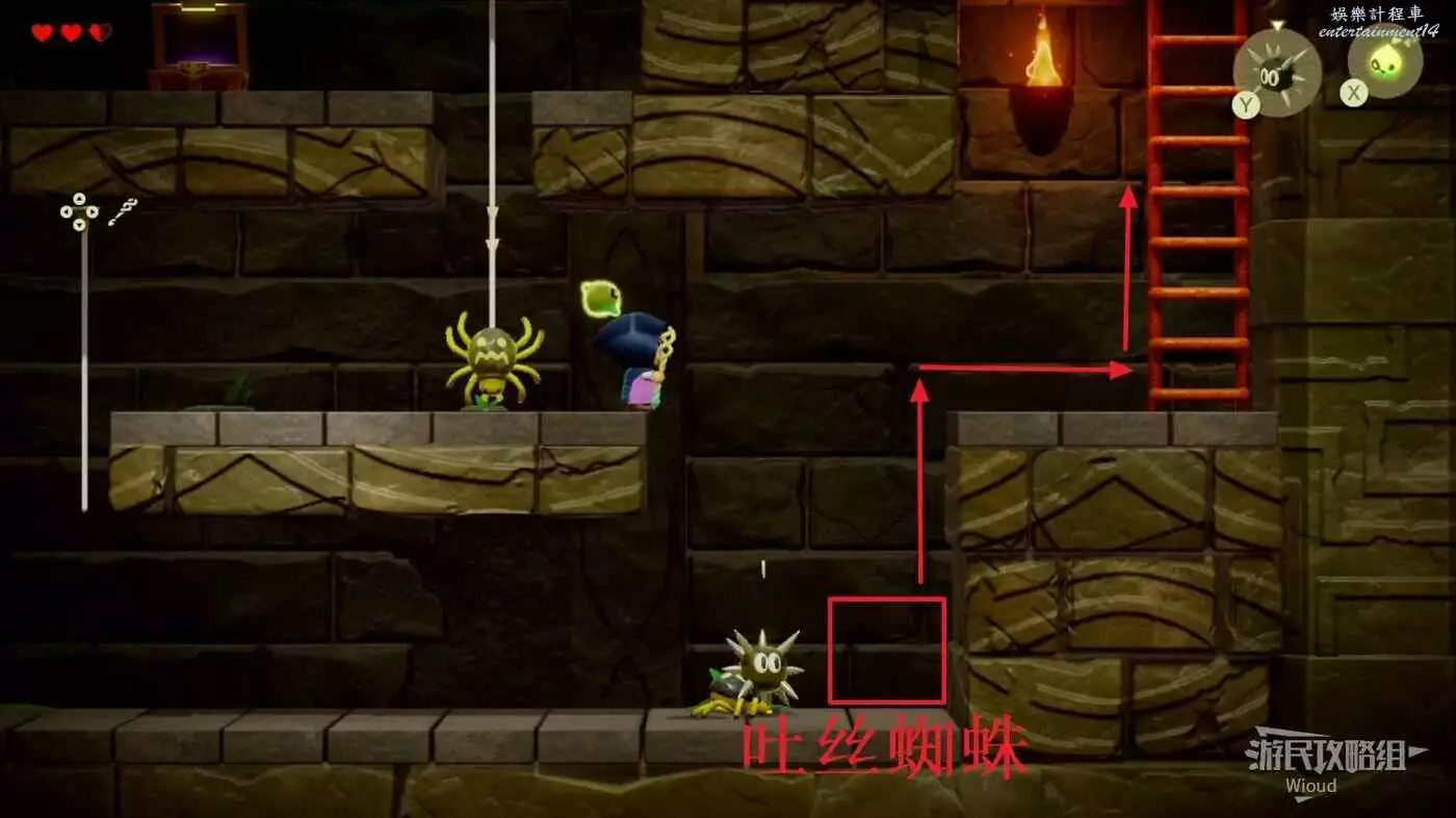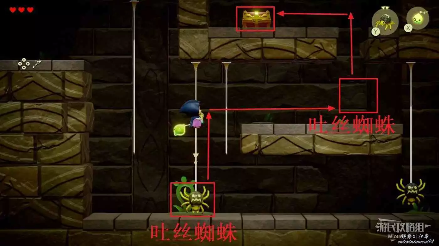 走到寶箱下方平台邊緣放置海膽幹掉野生的蜘蛛,通過吐絲蜘蛛+樓梯離開這個迷宮。