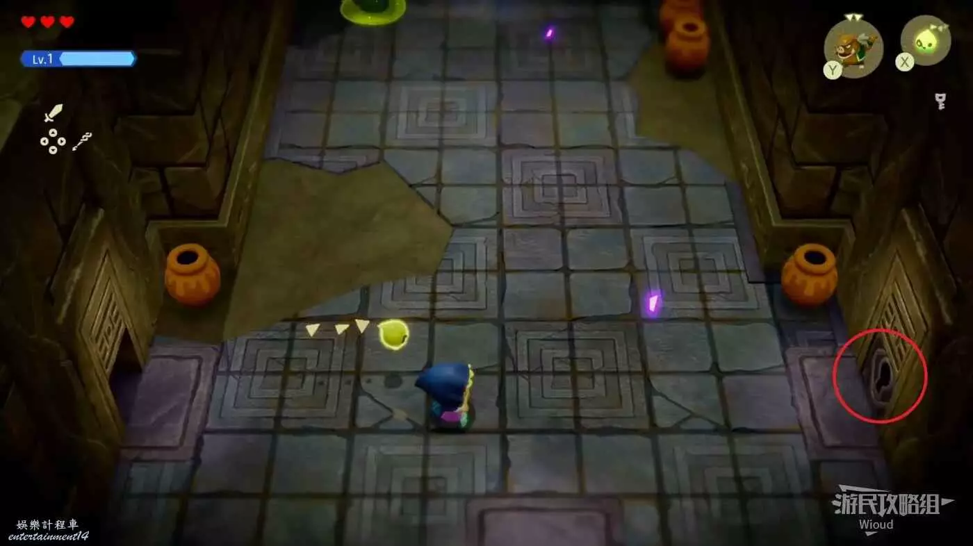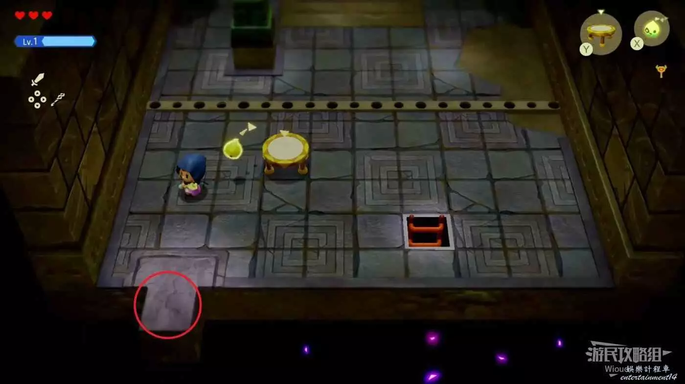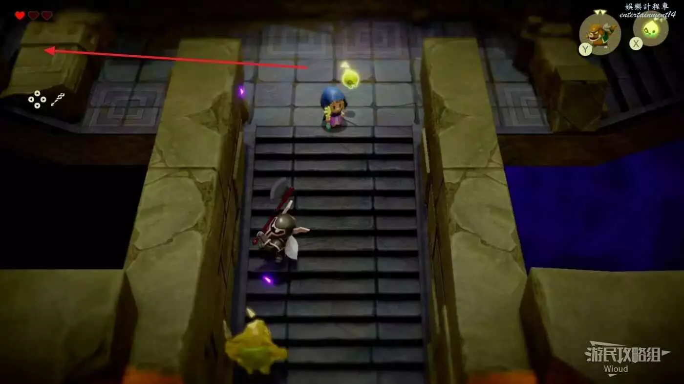 林克消失後留下了力量之劍,與劍互動可以開啟塞爾達的劍士形態,變身劍士形態將前面的紫色路障破壞,通過裡面的樓梯口繼續前進。
