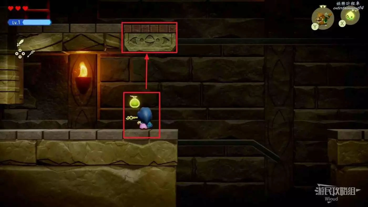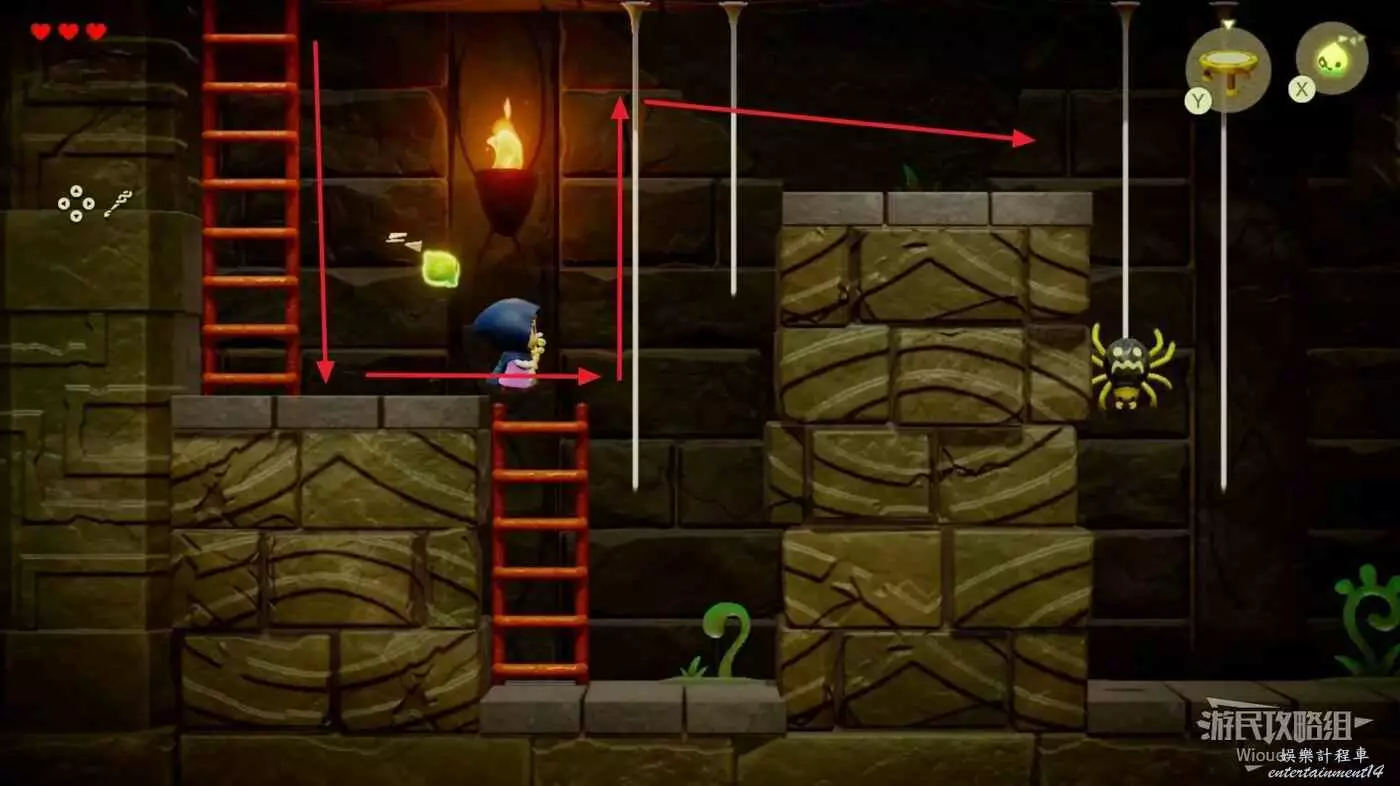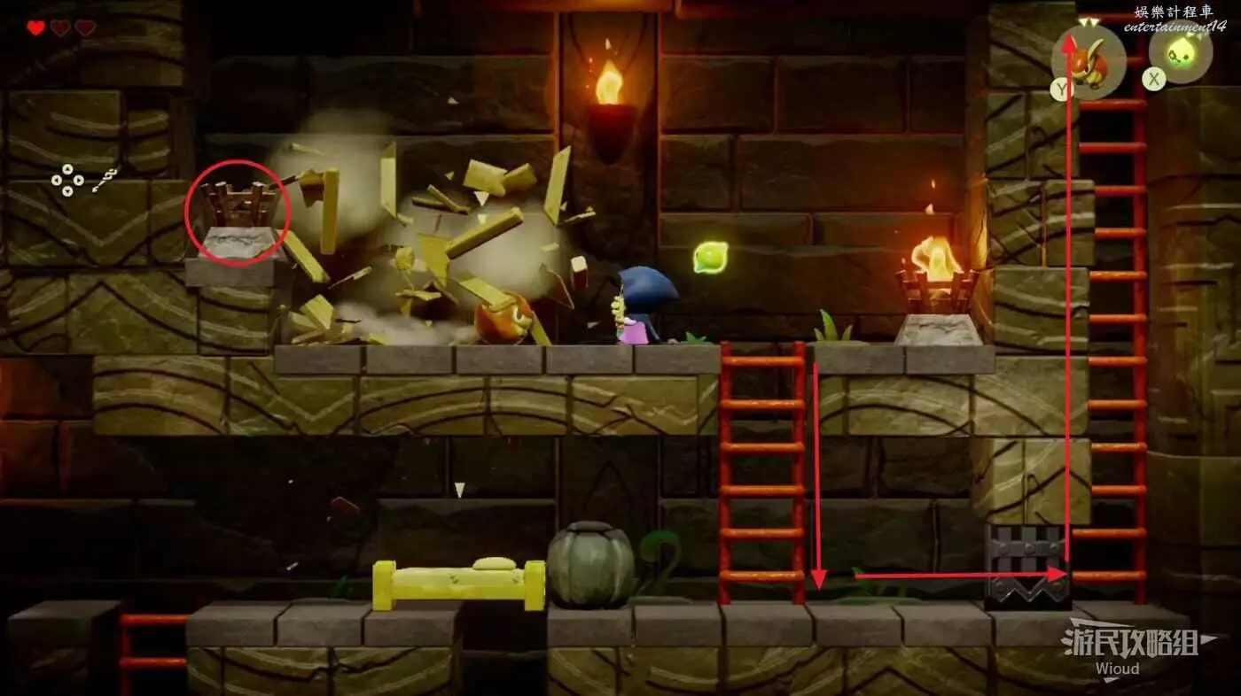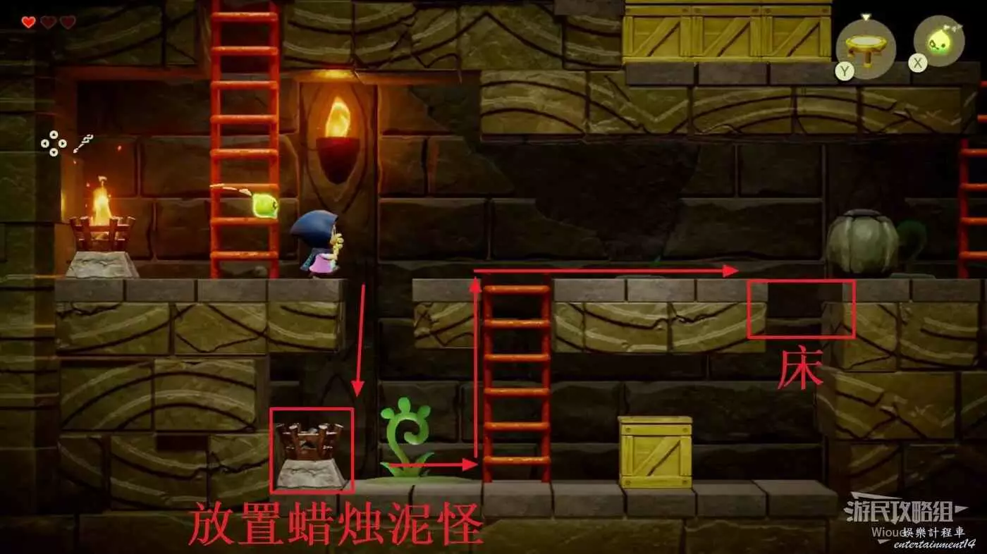 往左側木箱處放一隻邦吉羅將木箱全部破壞掉,使用蠟燭泥怪將左側的篝火點燃,右下的大門解鎖,通過右側樓梯離開這個區域。