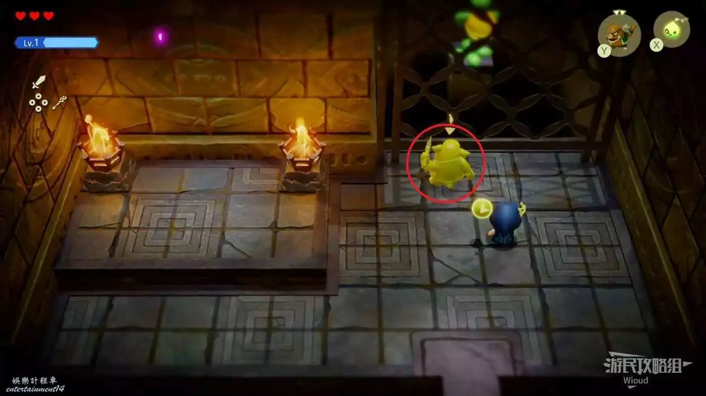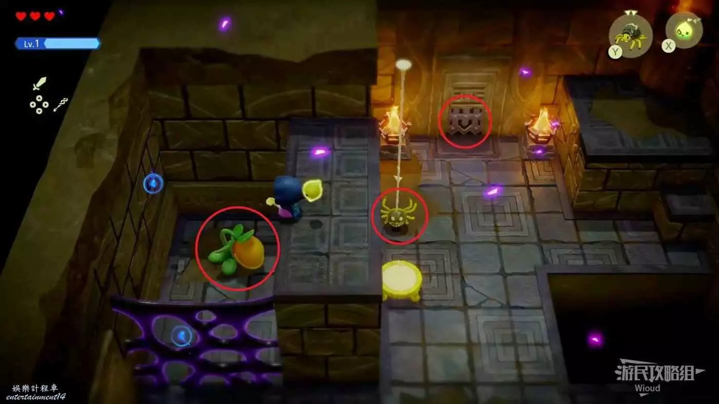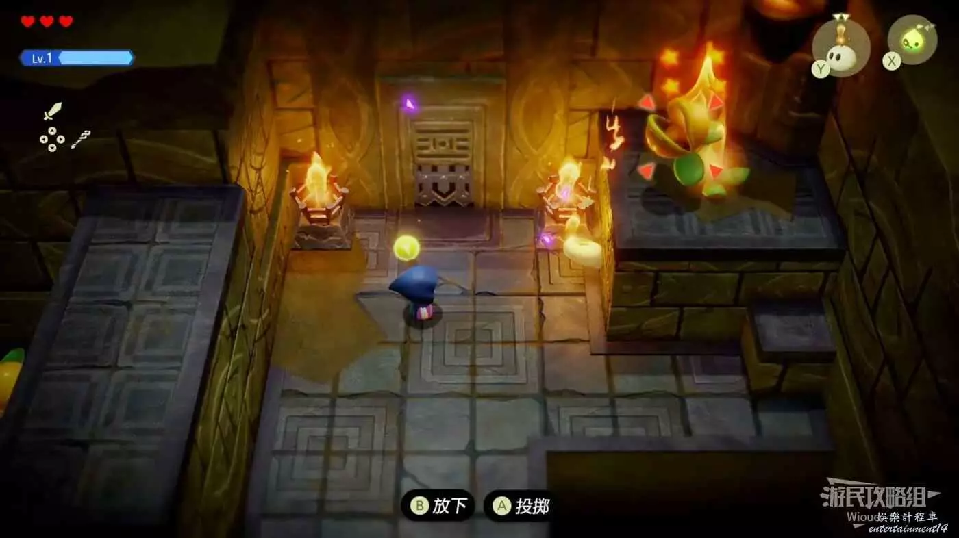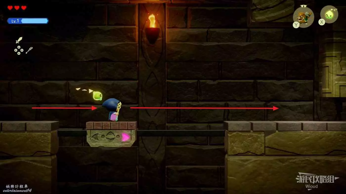 往左側木箱處放一隻邦吉羅將木箱全部破壞掉,使用蠟燭泥怪將左側的篝火點燃,右下的大門解鎖,通過右側樓梯離開這個區域。