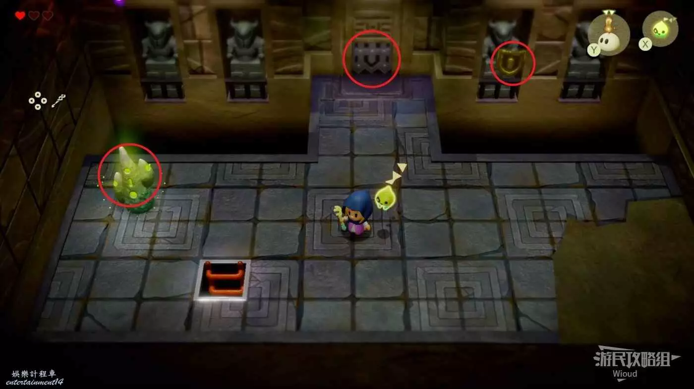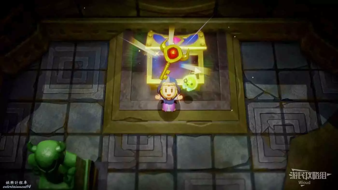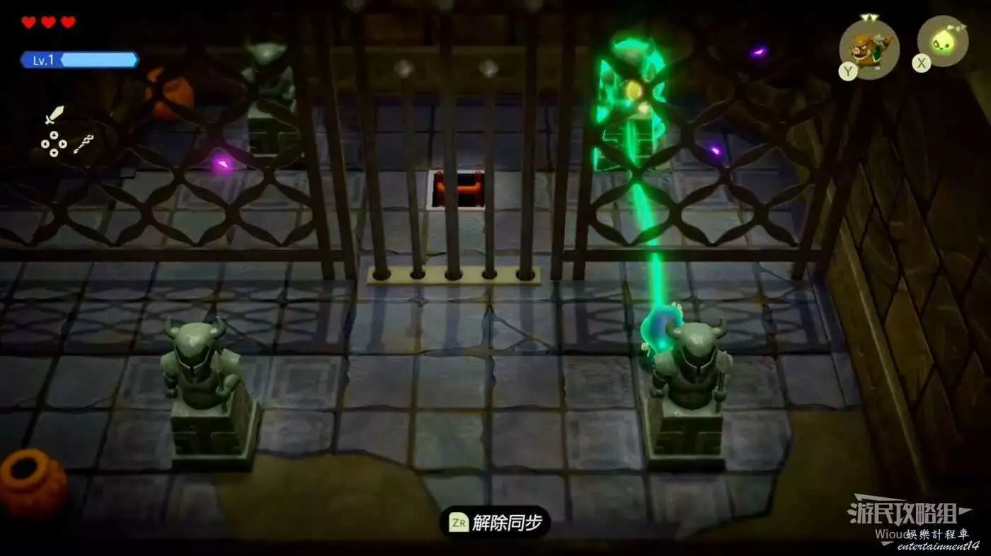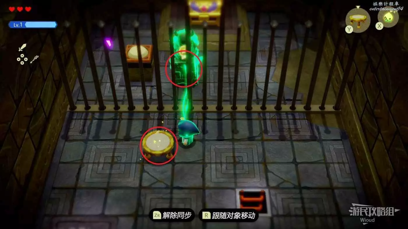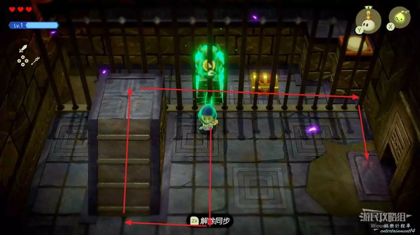 使用同步能力牽引裡面的綠色雕像,然後跟著下圖路線走一遍,走到右邊大門處停止,雕像碰到機關即可開啟寶箱。