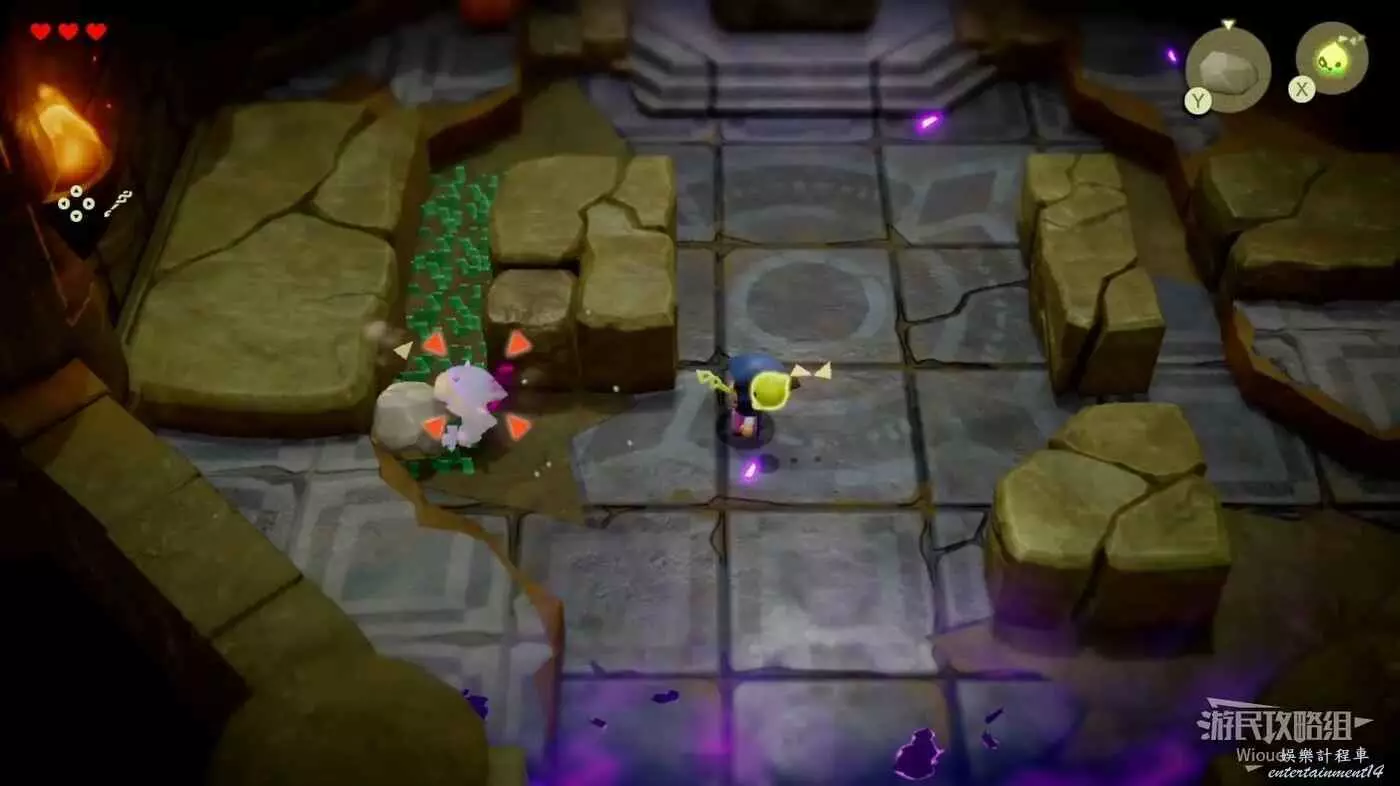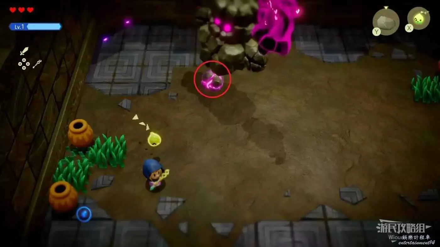 這場BOSS戰很簡單,我們只需要繞著紅框所示的兩個石頭來回轉,林克不一會就會丟失目標。