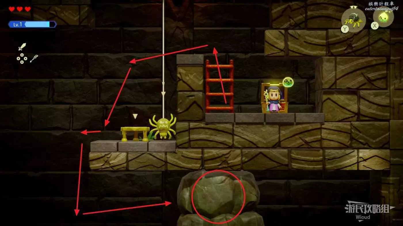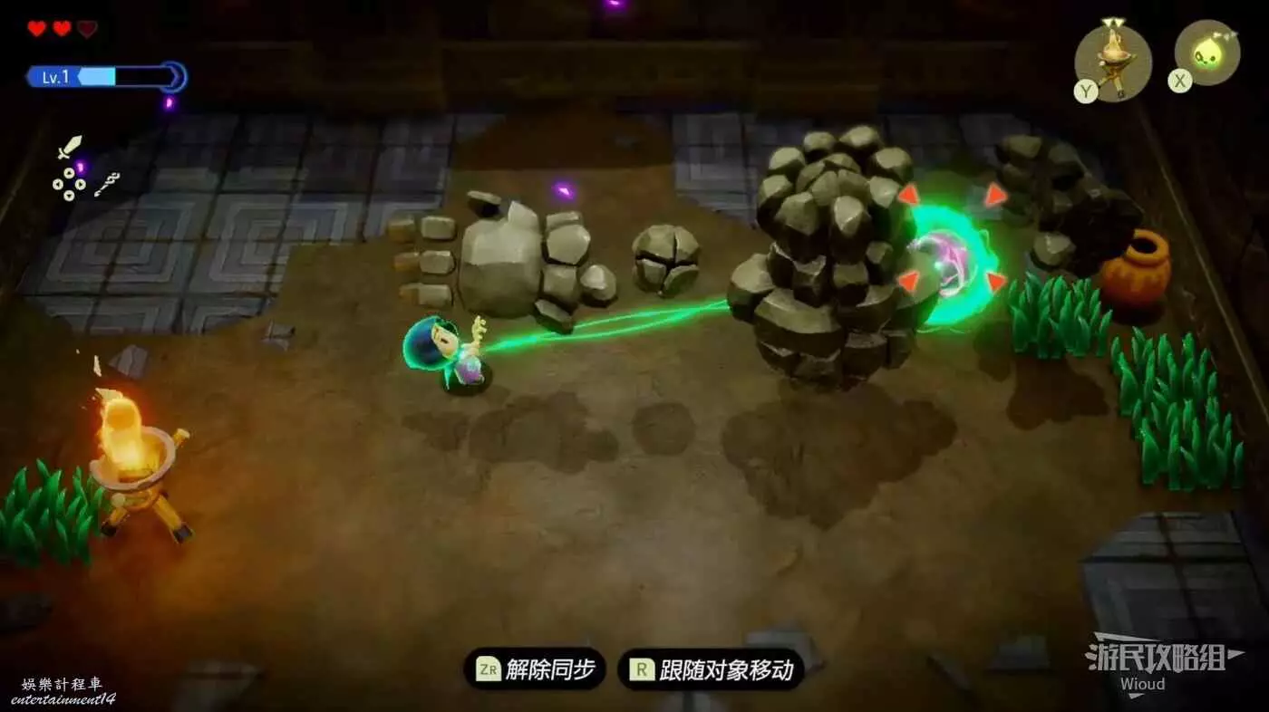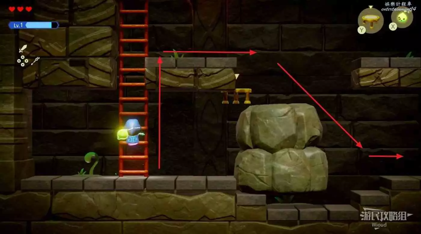 打開寶箱後原路返回,跳到最底層往右走,使用同步能力操控巨石往左移動。